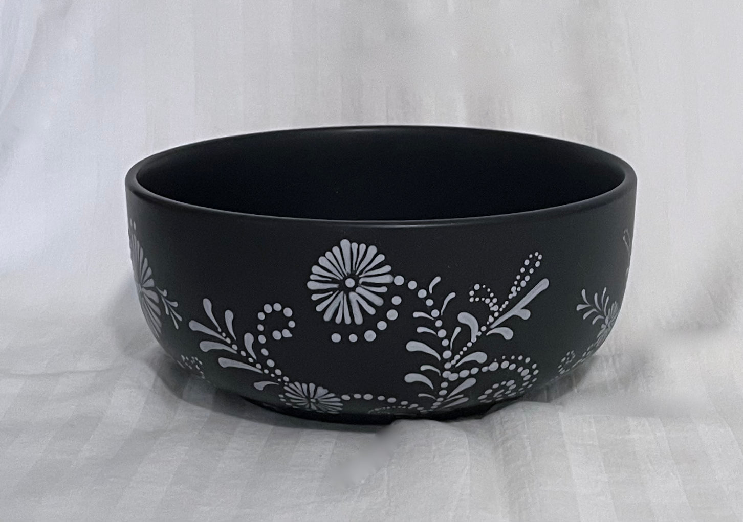 Delicately designed with a silver floral pattern, this black mug and bowl set is elegant and timeless. An excellent choice for a quiet morning's repast! The bowl is large and suitable for cereal, soup or dips. The mug sports a large, easy-to hold handle with the pattern along the base.