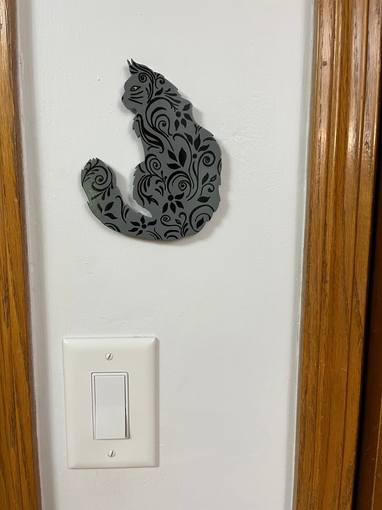 This 6 inch Charcoal Grey wood cut-out Cat is hand painted with acrylic and finished with a protective clear-coat spray. This beautiful cat has a unique Damask design in black. Available with a small Command Strip for hanging.