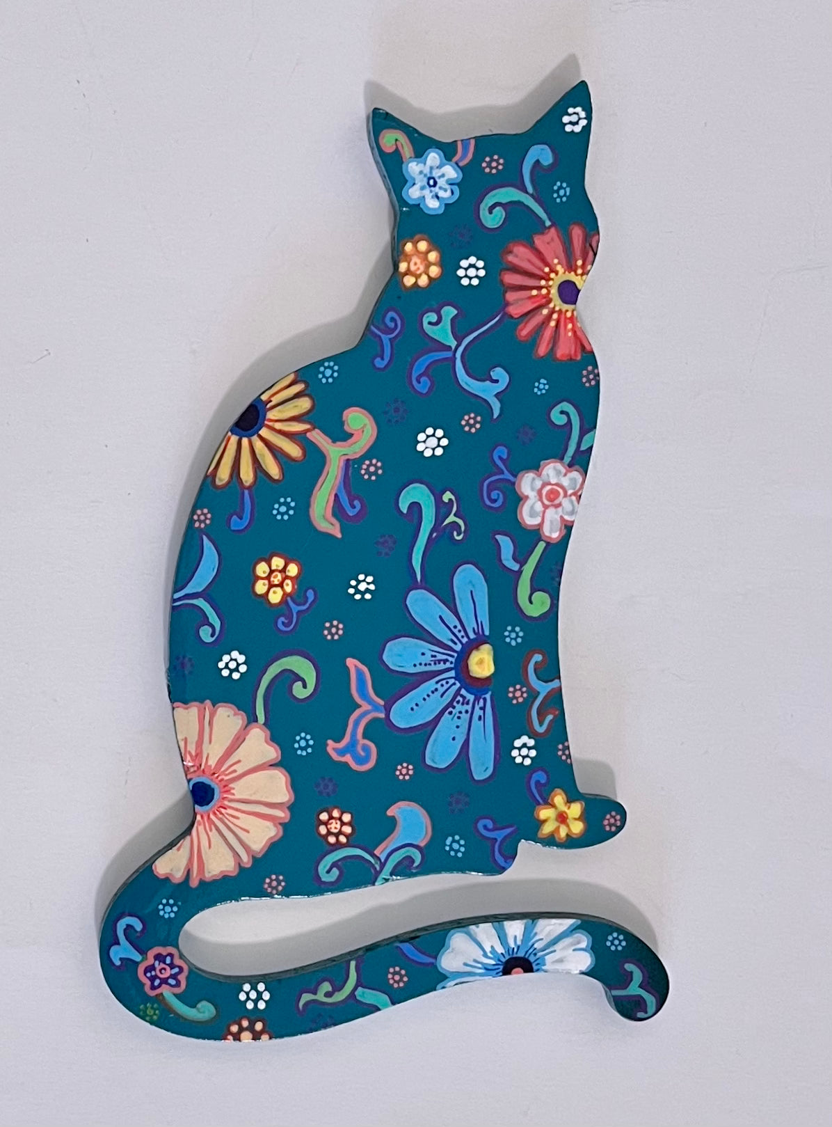 This 6 inch Turquoise wood cut-out Kitty is hand painted with acrylic and finished with a protective clear-coat spray. This beautiful cat has a unique Floral design in beautiful spring colors. Available with a small Command Strip for hanging.