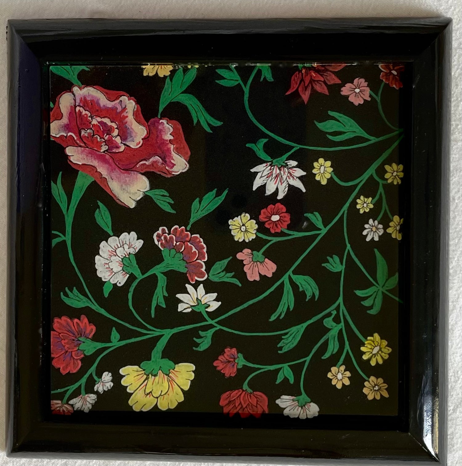This unique little square painting is inspired by Chinese patterns, and hand-painted in acrylic on a black background. Fine details create a 3 dimensional look on many of the flowers. This item is covered with a clear resin coating, with a hand-built rounded-edge frame to create a lacquered look. Available with a small Command Strip for hanging.