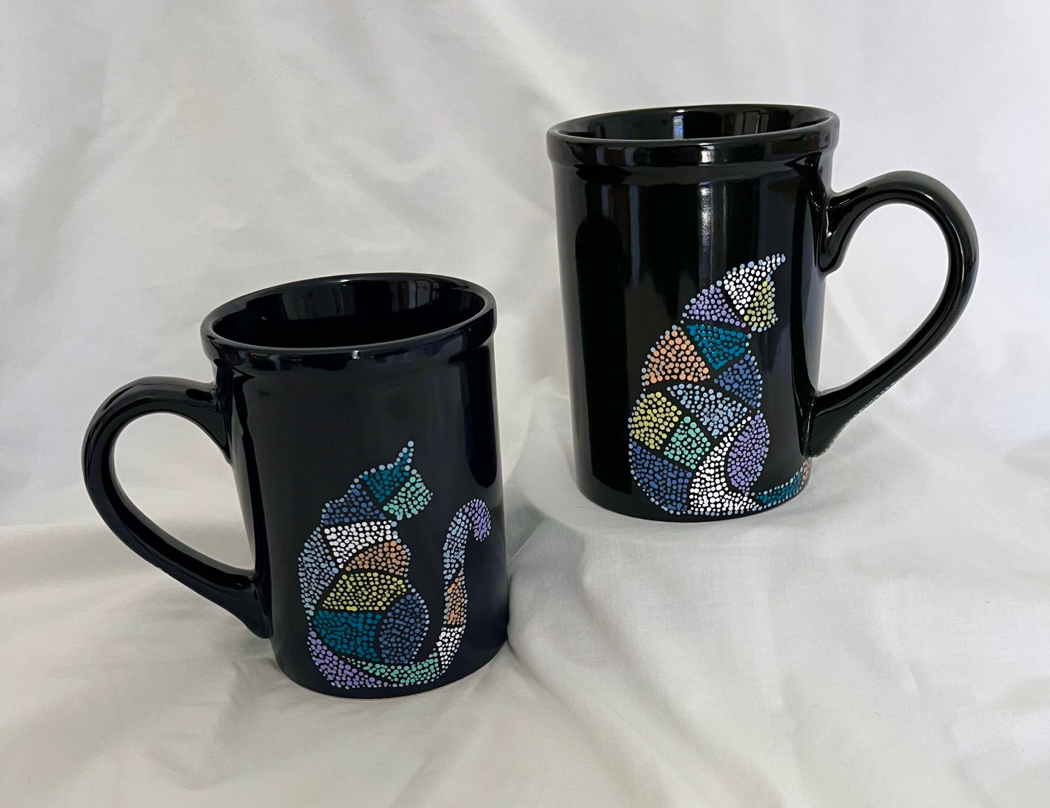 These adorable LARGE cat mugs are dotted in a Mosaic style with a uniquely painted cat on each side. The handle is large and comfortable to hold, with a tail wrapping up the middle of the handle. Each mug is handpainted and unique, so colors may vary. Available in black or deep navy blue.
