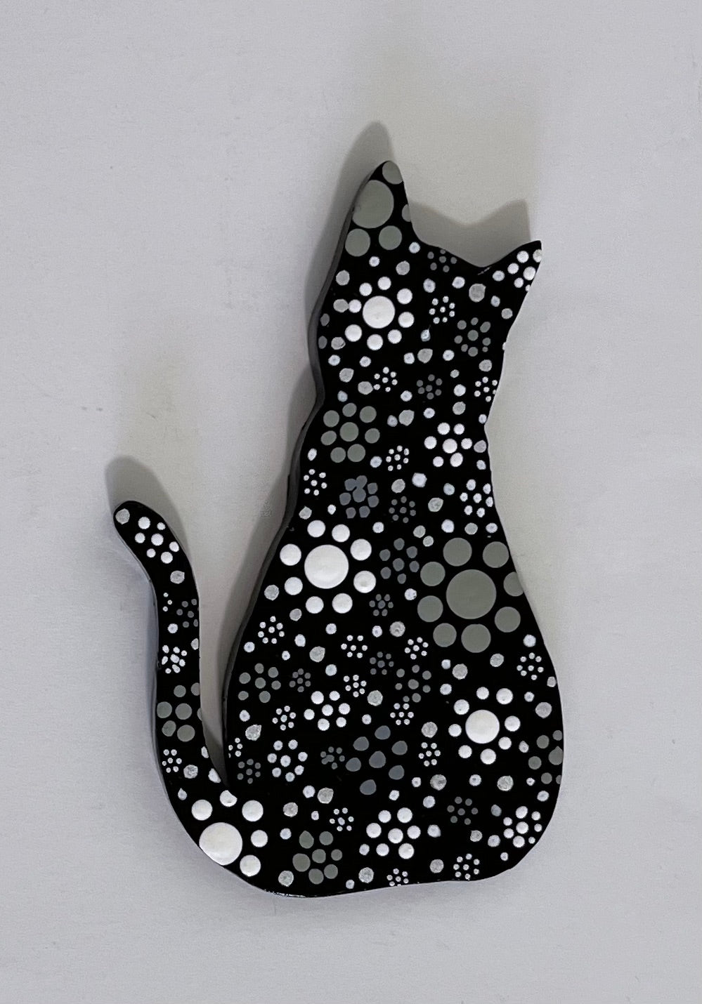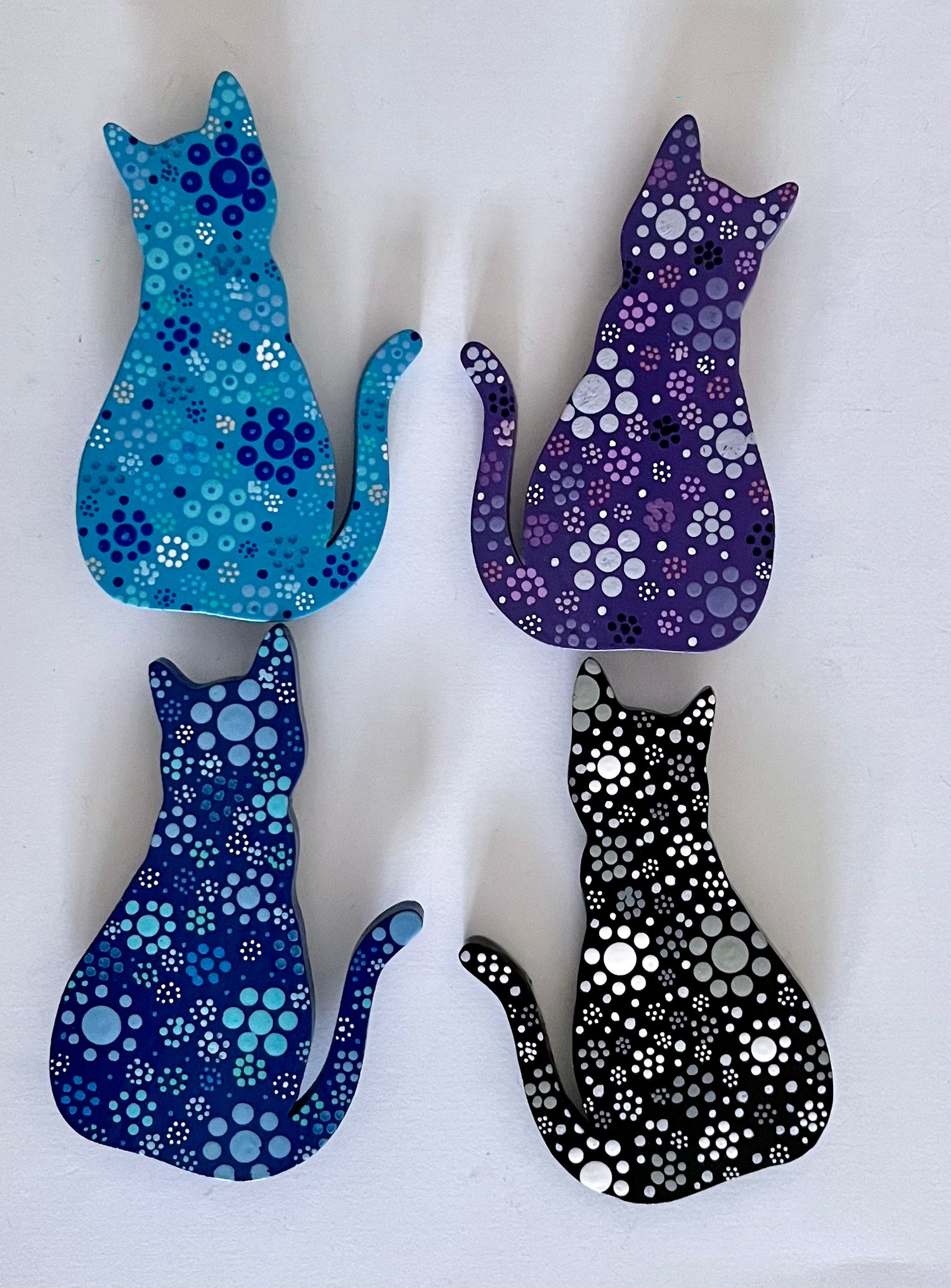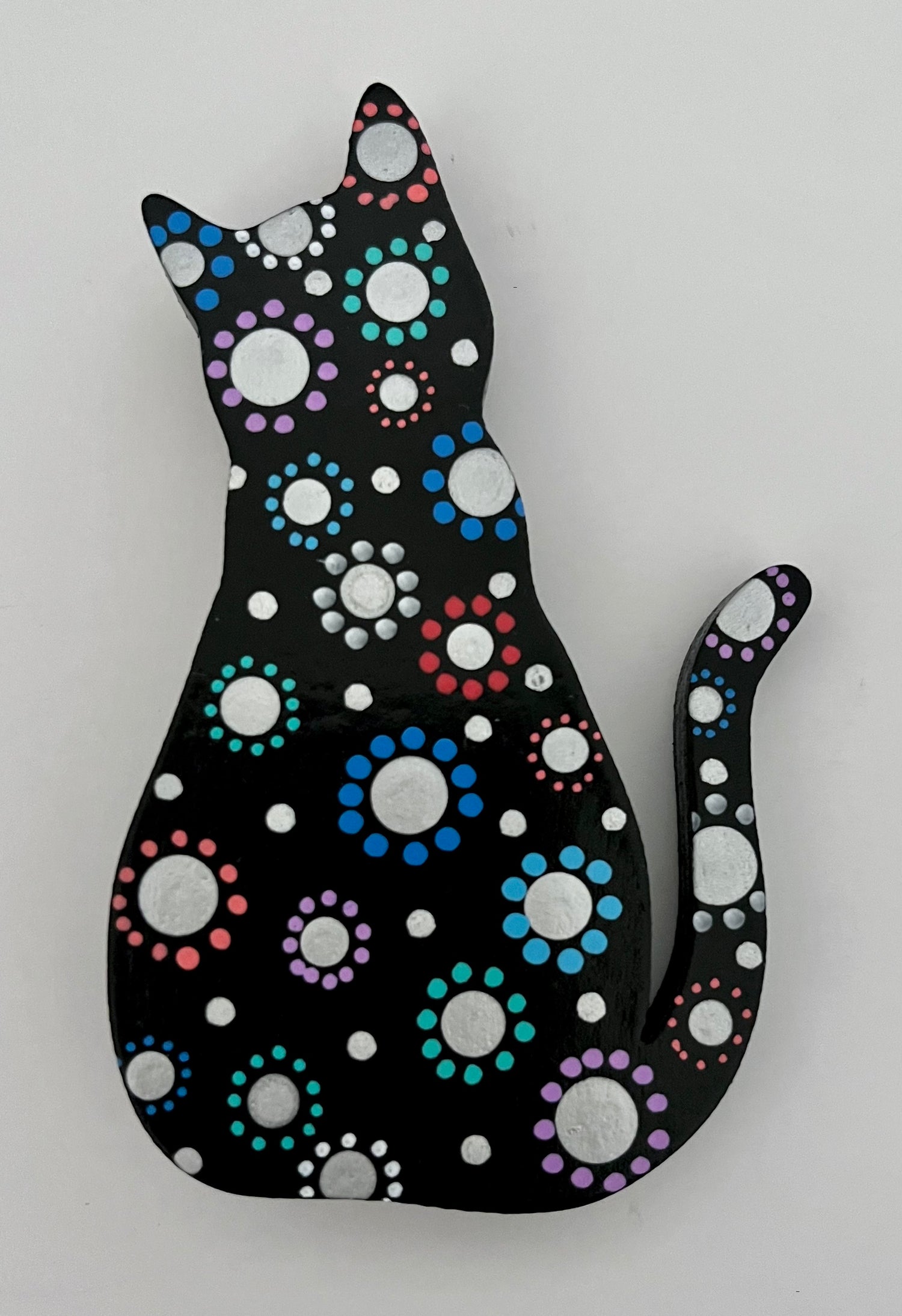 These cute wooden cat magnets are hand painted with acrylic and finished with a protective clear-coat spray. Black & White, Baby Blue, Cobalt or Purple variations feature pop-art flowers. Two Metallic versions are available in either gold or silver. Brighten someone's day with a pretty kitty!