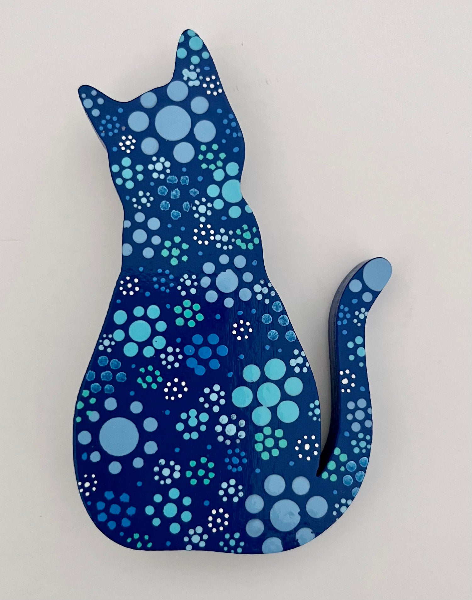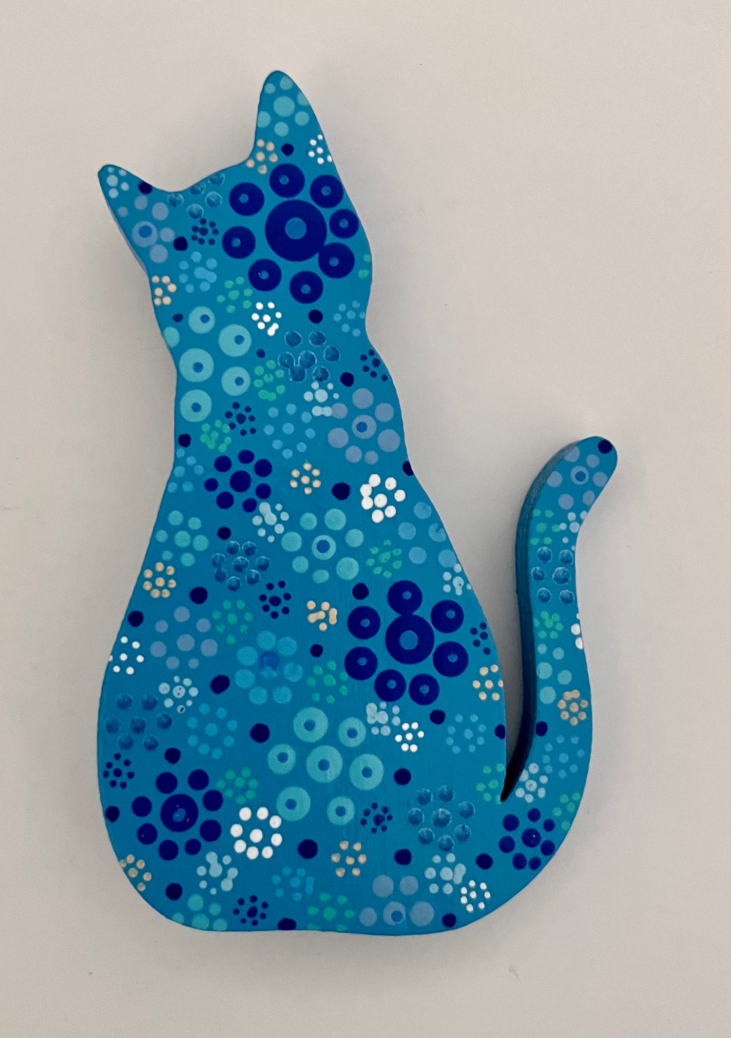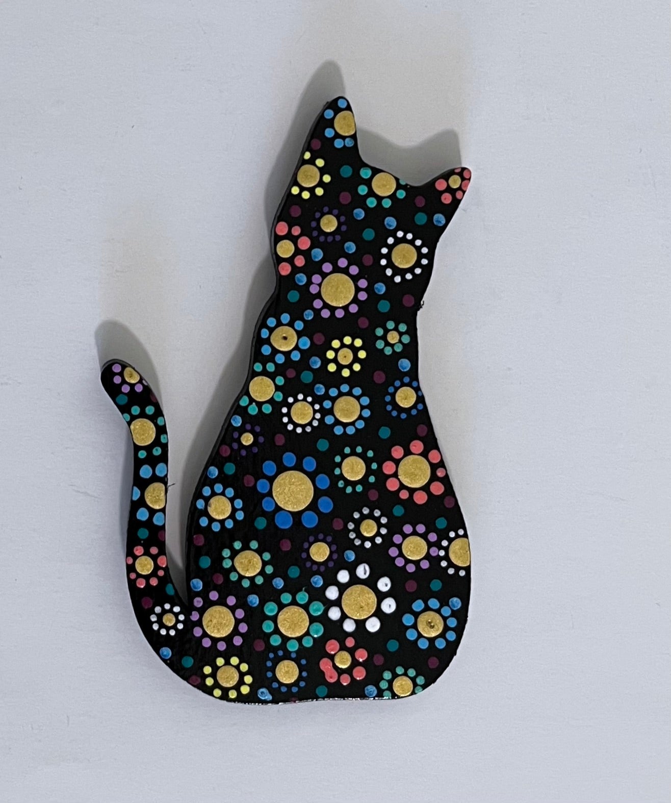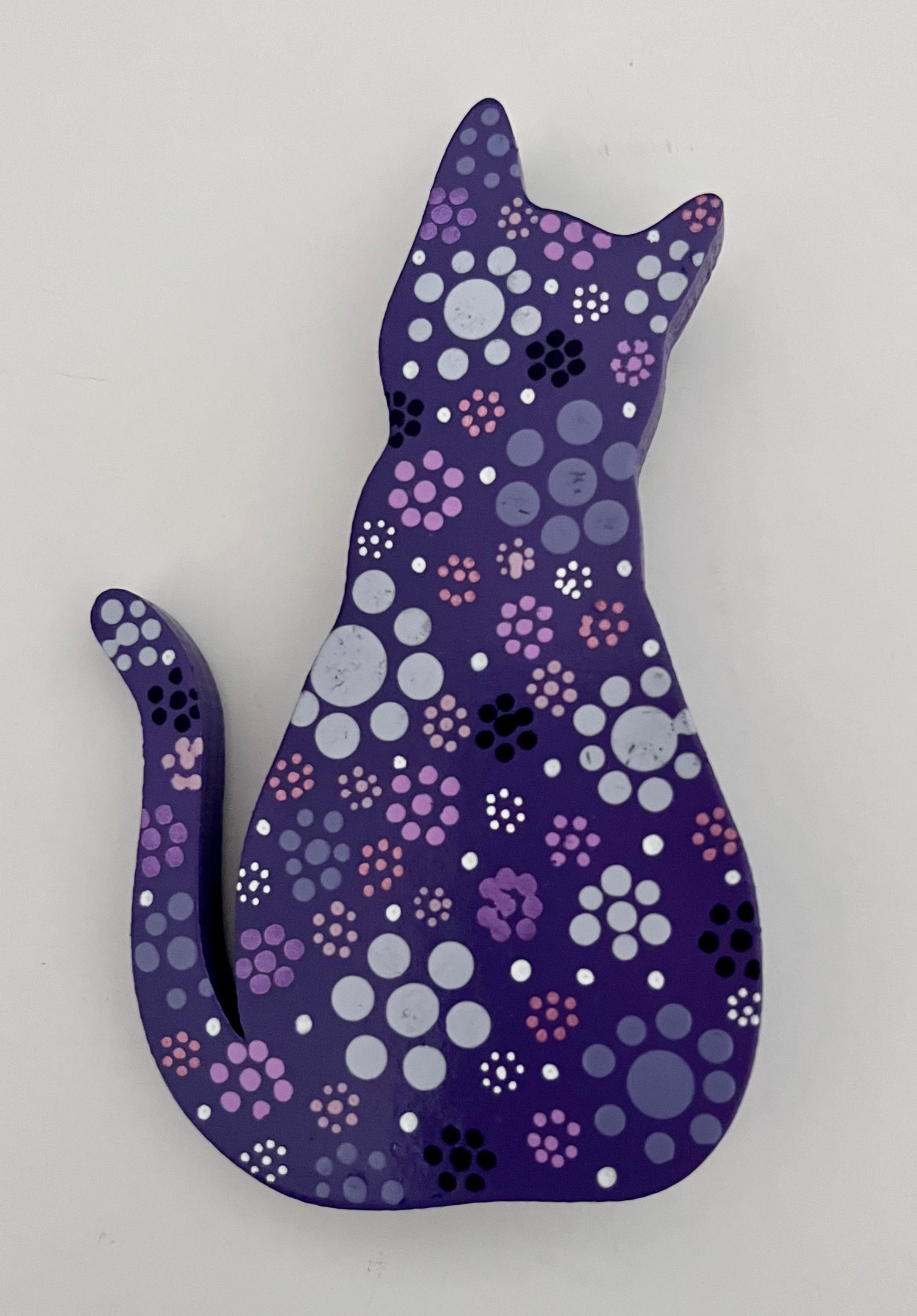 These cute wooden cat magnets are hand painted with acrylic and finished with a protective clear-coat spray. Black & White, Baby Blue, Cobalt or Purple variations feature pop-art flowers. Two Metallic versions are available in either gold or silver. Brighten someone's day with a pretty kitty!