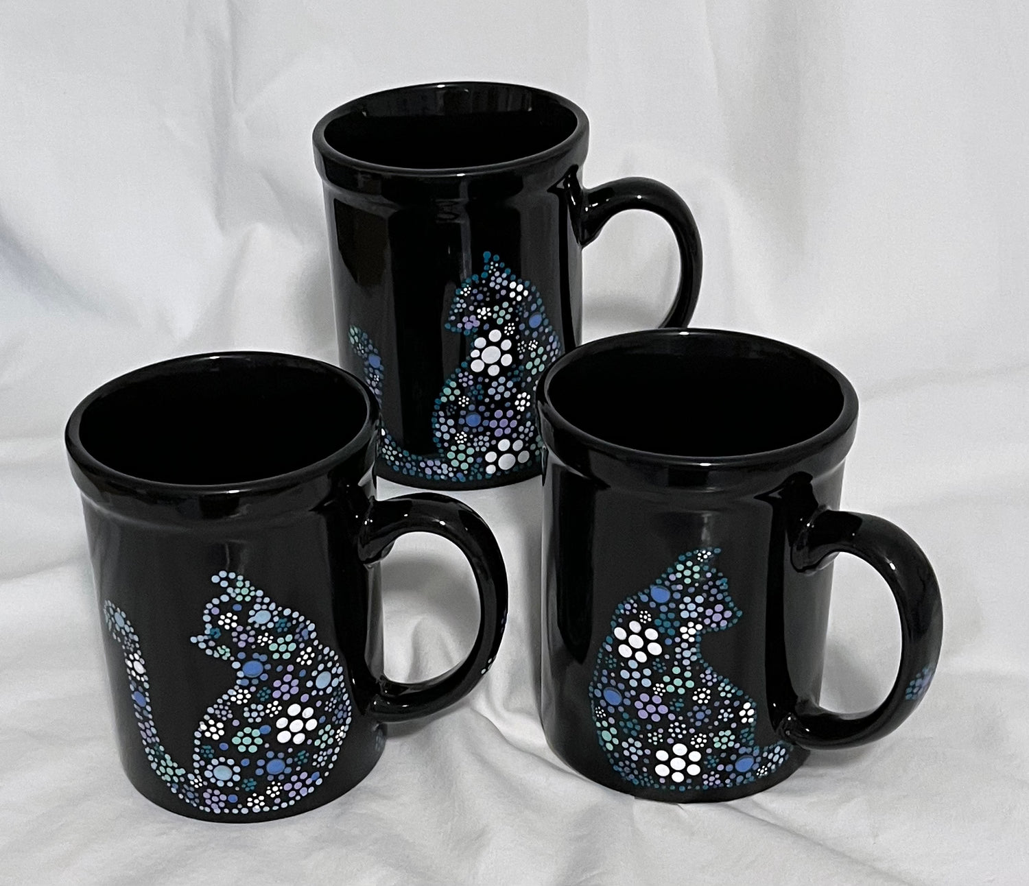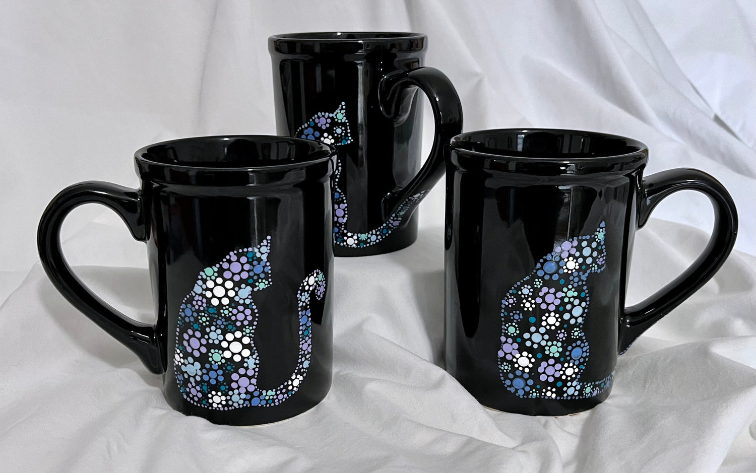 These adorable LARGE cat mugs are dotted in a "Mod" 60's floral style with a uniquely painted cat on each side. The handle is large and comfortable to hold, with a tail or flowers wrapping up the middle of the handle. The colors are in cool pastel tones. Each mug is handpainted and unique, so colors and shapes may vary.