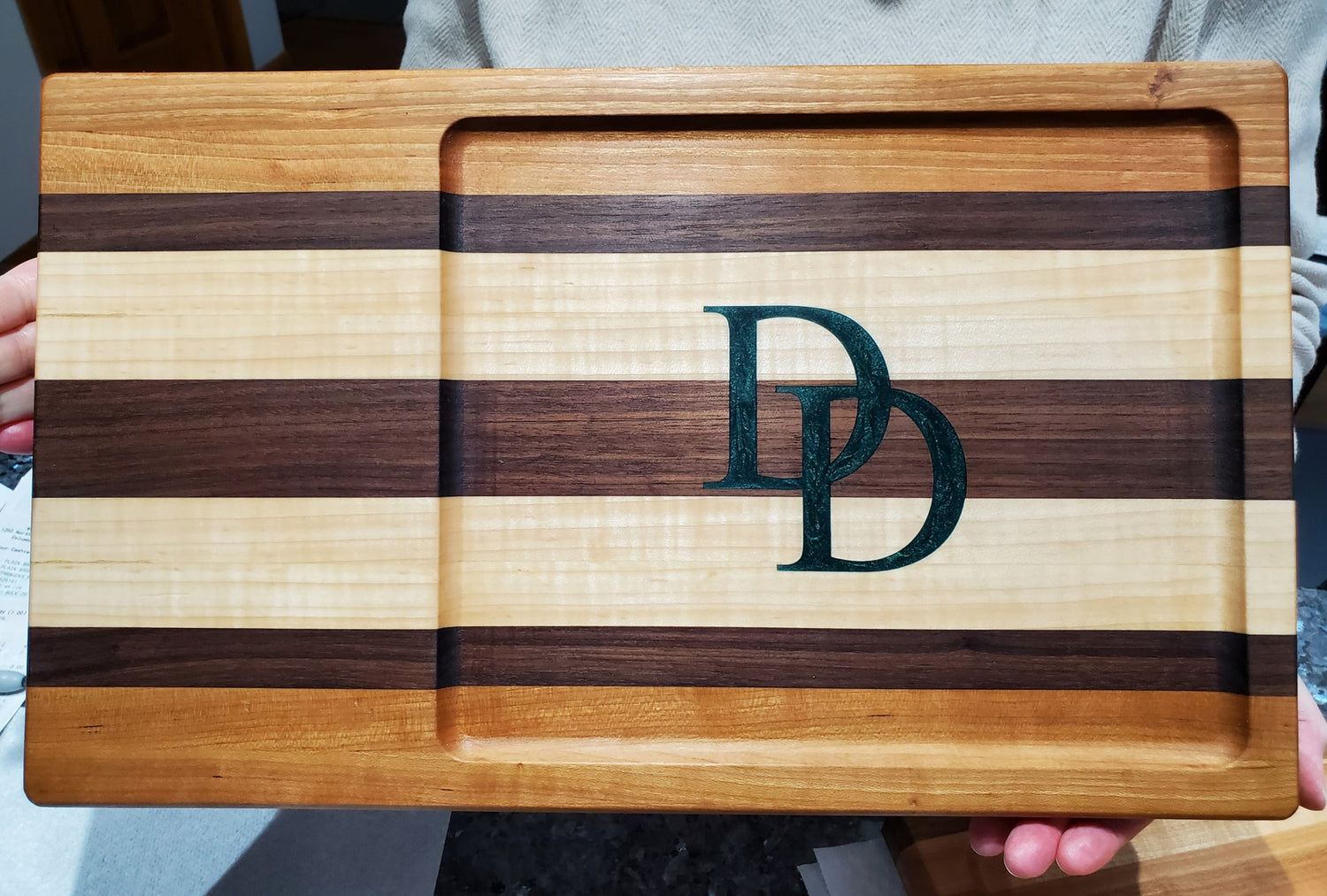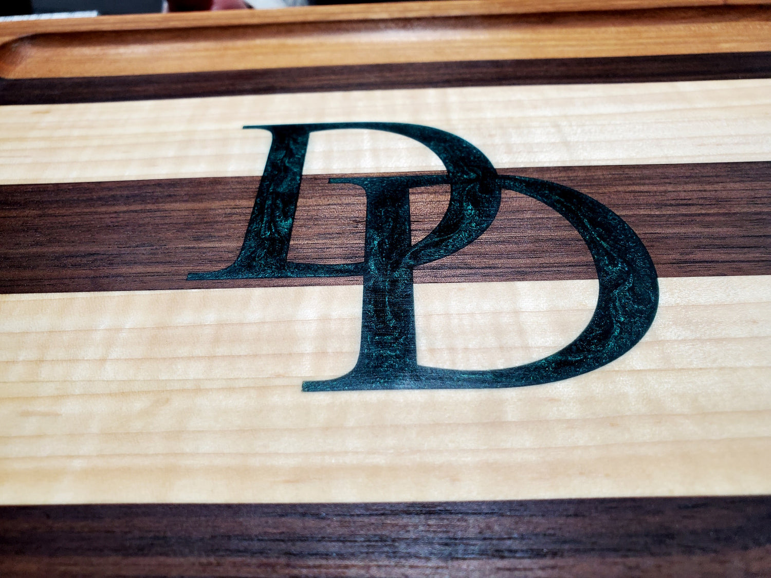 Walnut, cherry and maple charcuterie board with metallic green epoxy monogram inlay.