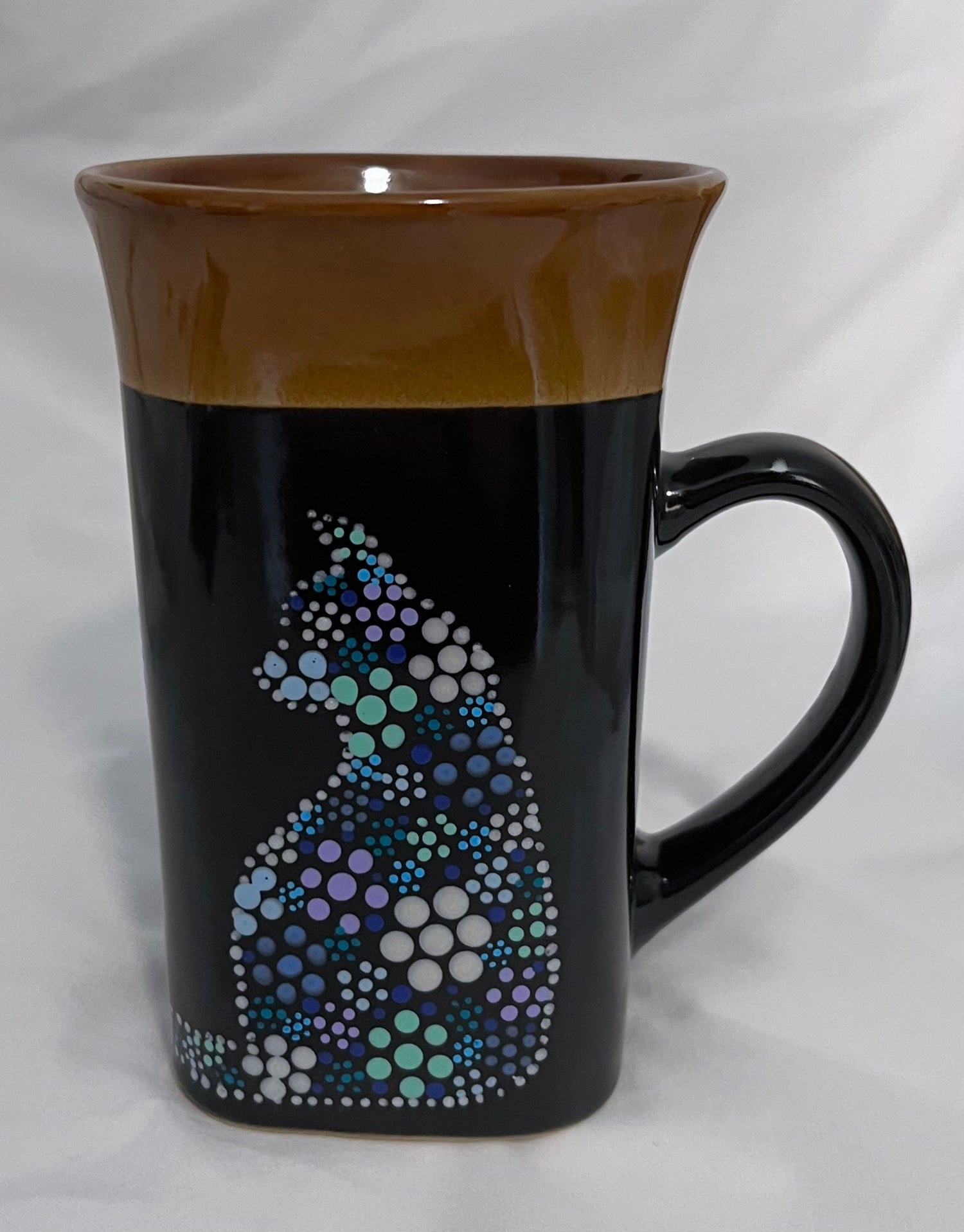 This large square-shaped brown and cobalt mug features two cat silhouettes in cool tones. The handle is large and comfortable to hold, and the kittens' tails wrap together into a heart shape in the middle.