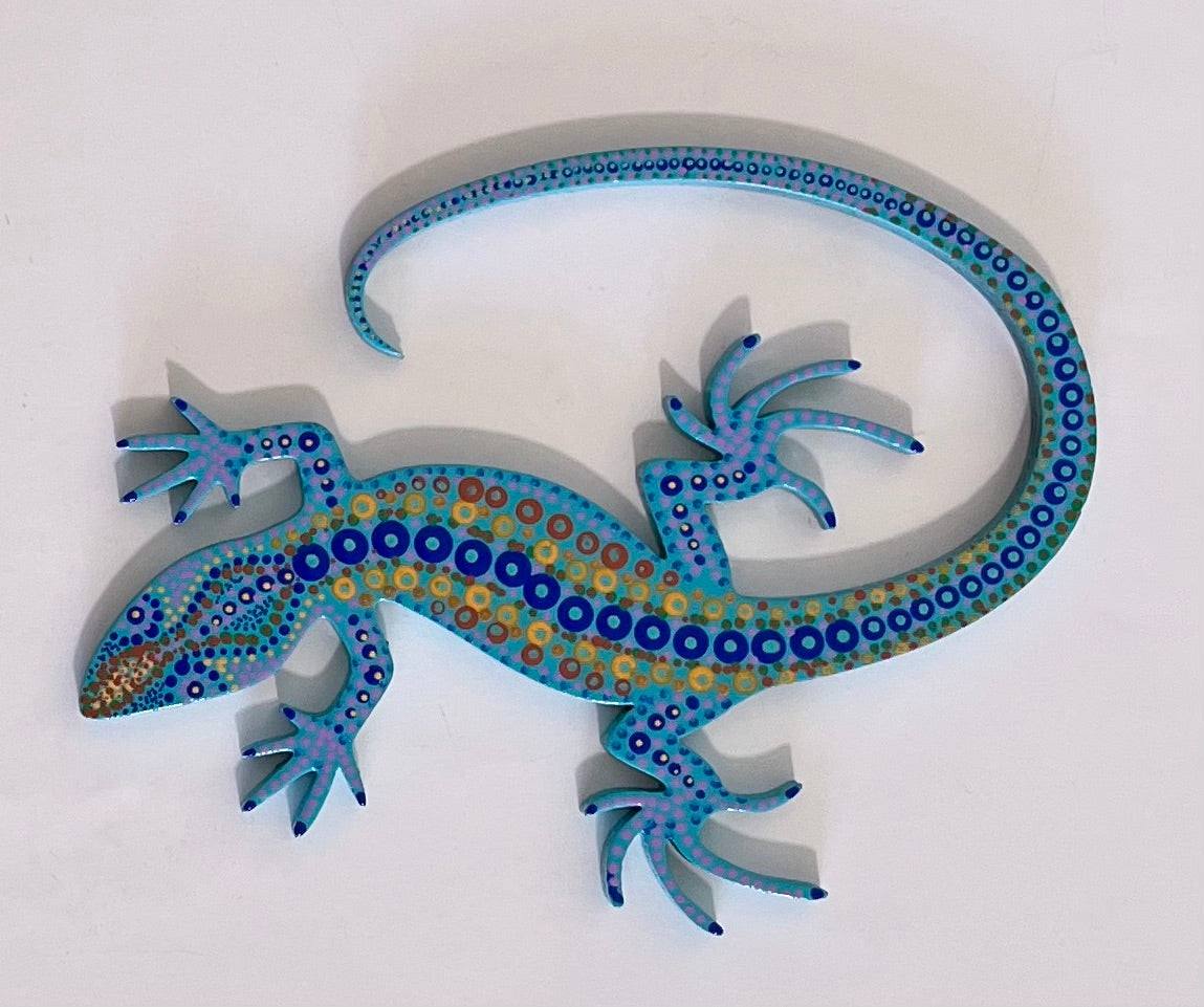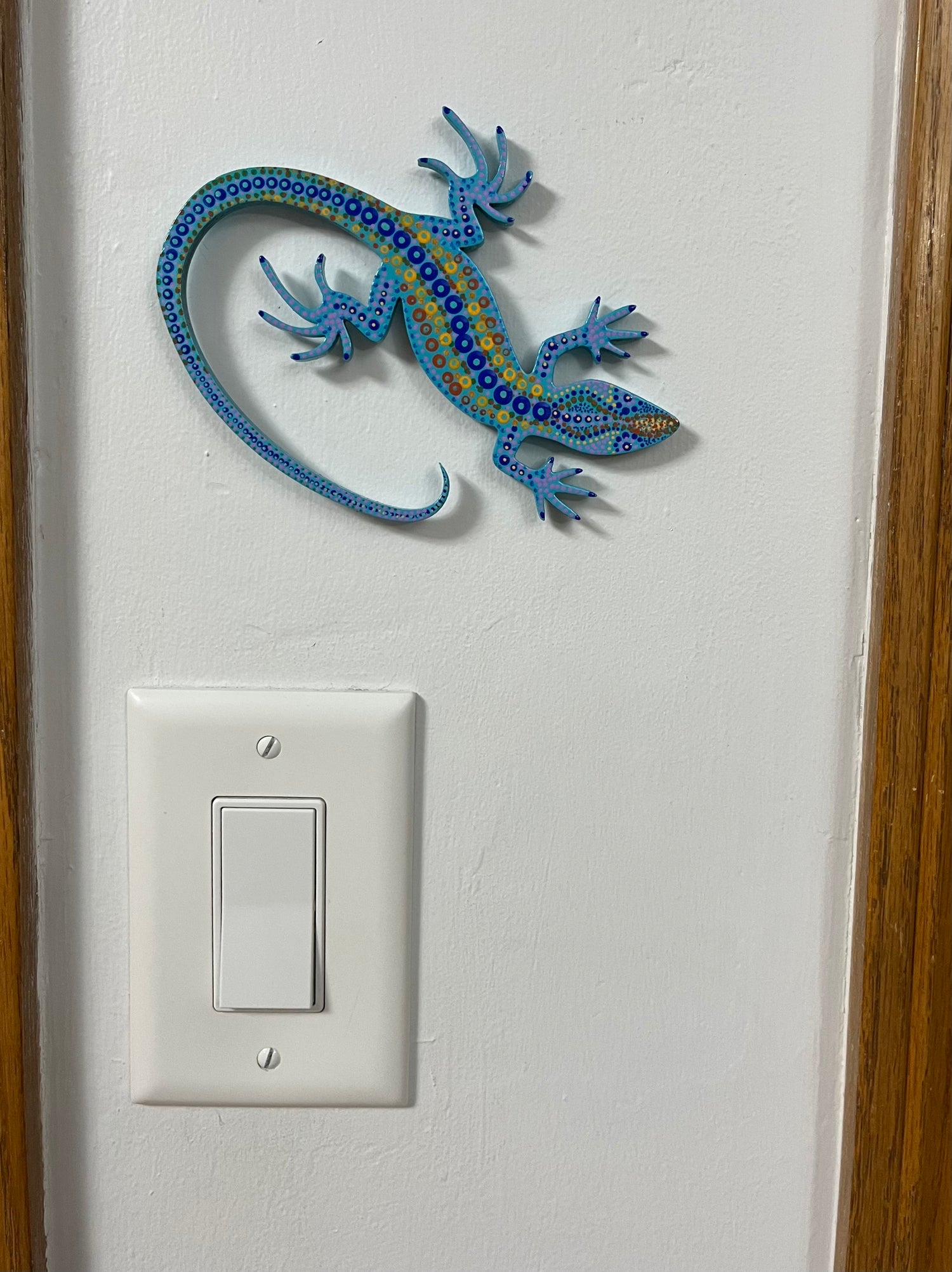 Who is this little guy crawling up my wall???! This Gecko-shaped wood cut-out is hand painted with acrylic and finished with a protective clear-coat spray. This fun wall art has a unique design which will surely add color and beauty to your walls! Available with a small Command Strip for hanging.