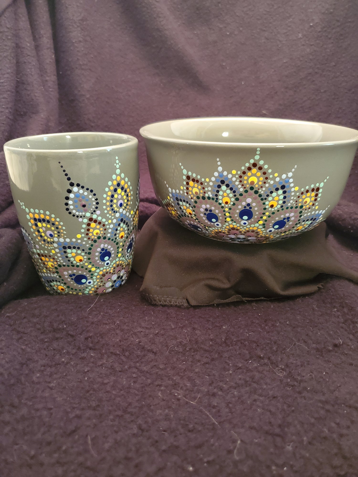 I’ve really enjoyed using this “Peacock” pattern of mandala design on mugs, and when I found this grey bowl I knew just the pattern to use! I love the colors against the grey, and honestly, if nobody buys this, I’ll be delighted to keep it to enjoy with my morning coffee and oatmeal. What a beautiful way to start off my mornings! But I’ll let someone else have a crack at it first!