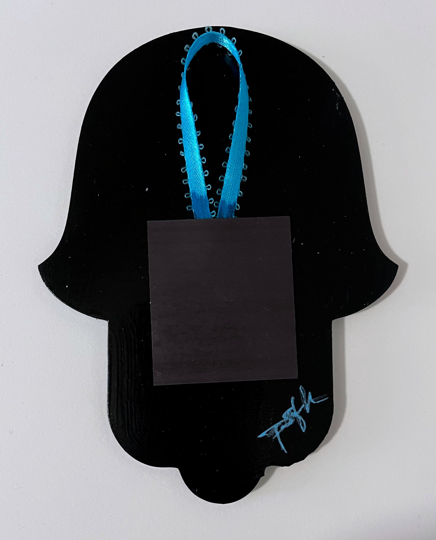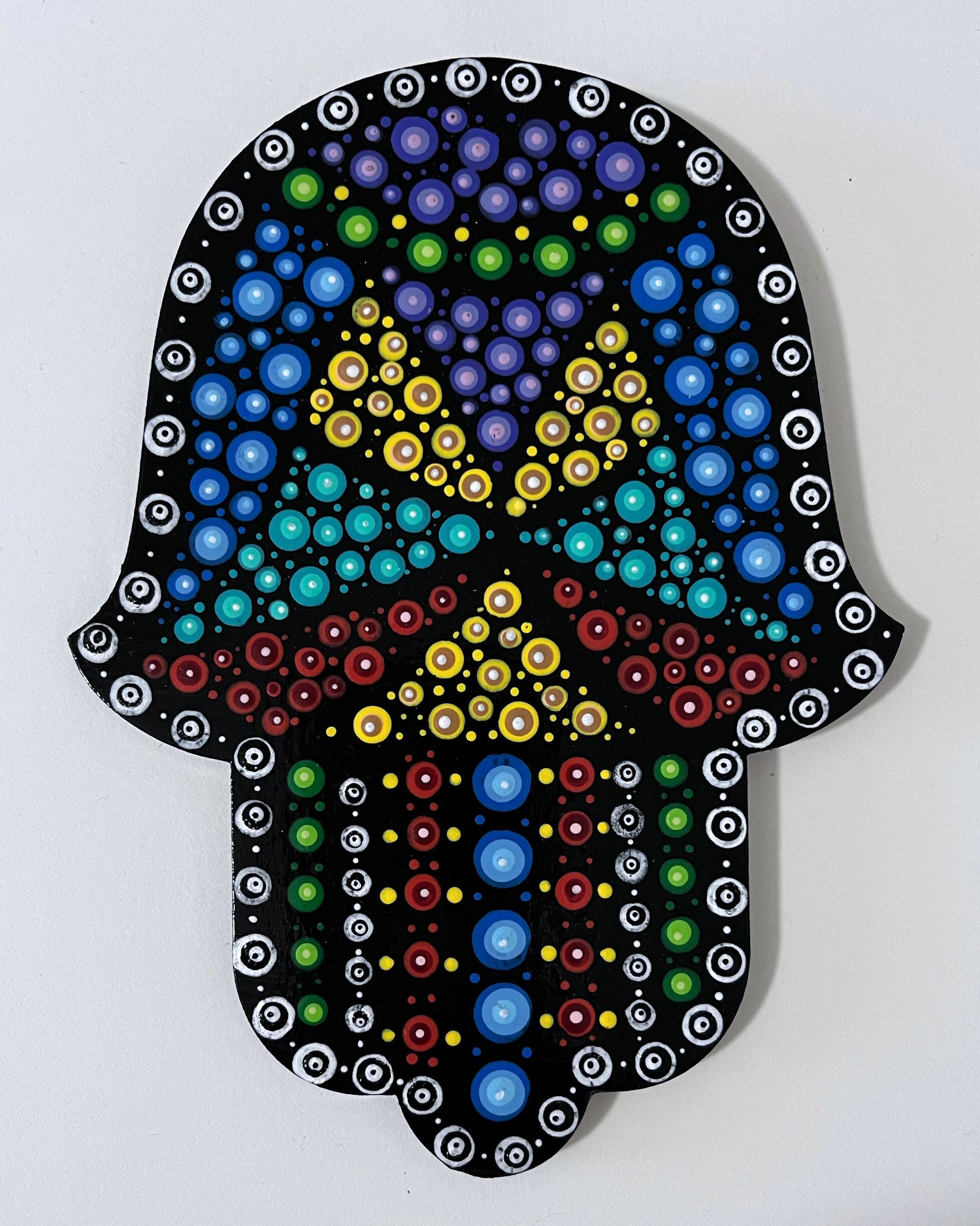 This Hamsa features a detailed multi-colored pattern with a primary palette and outlined in decorative black and white dots. It is hand-painted in acrylic and sealed with a clear protective coating. Includes two hanging options on the back with a ribbon loop for easy hanging and a magnet for placing it on the refrigerator.