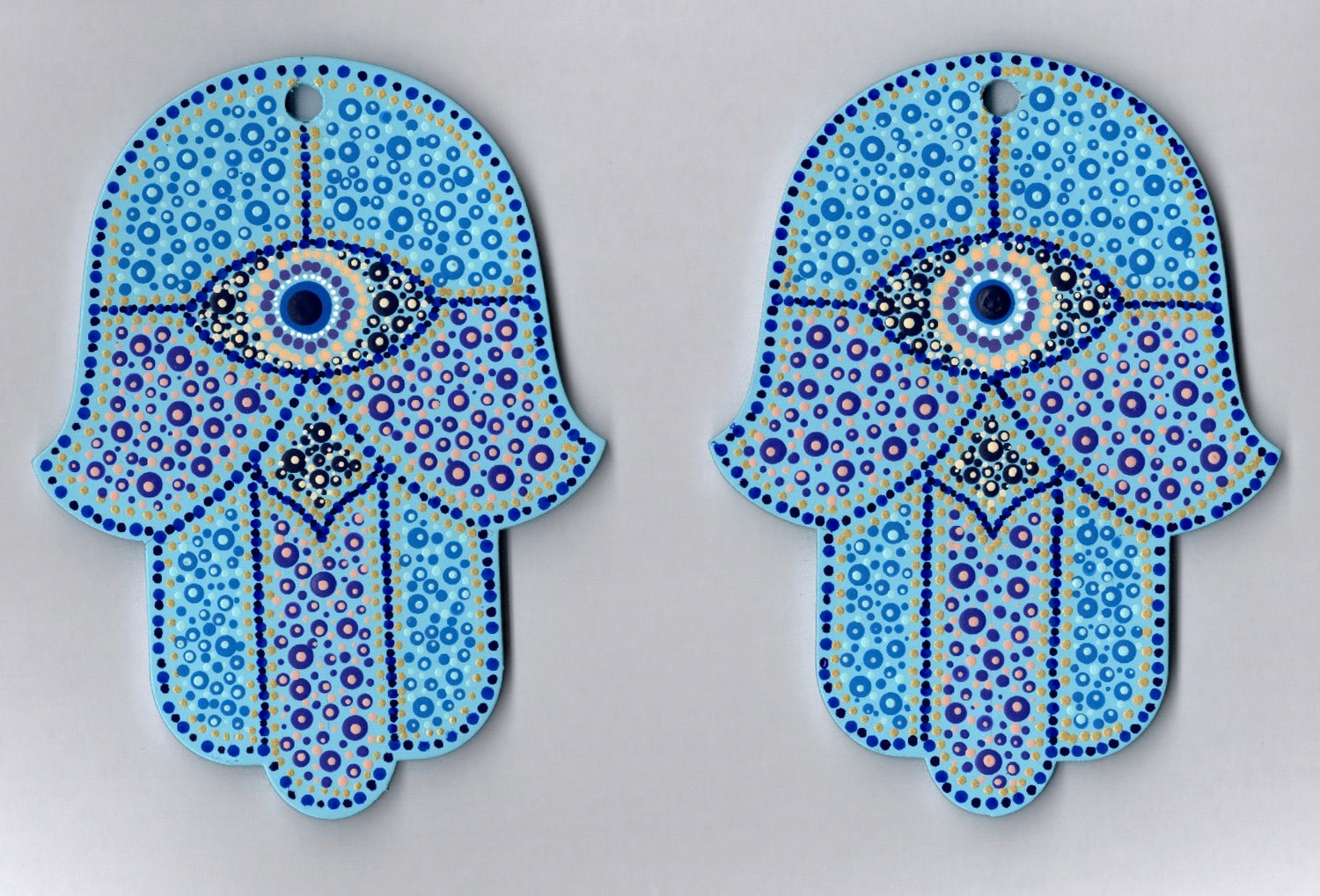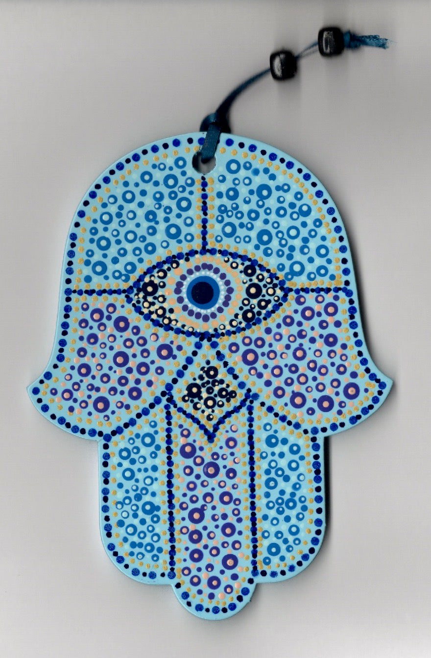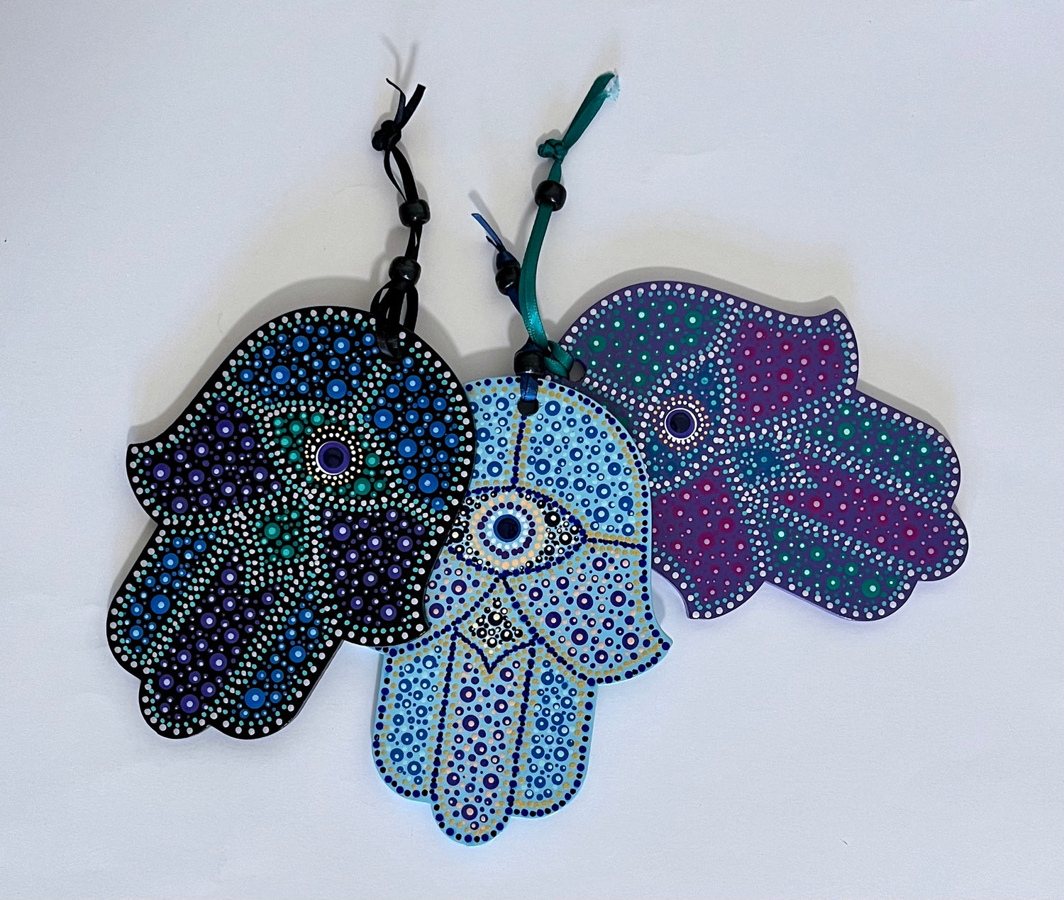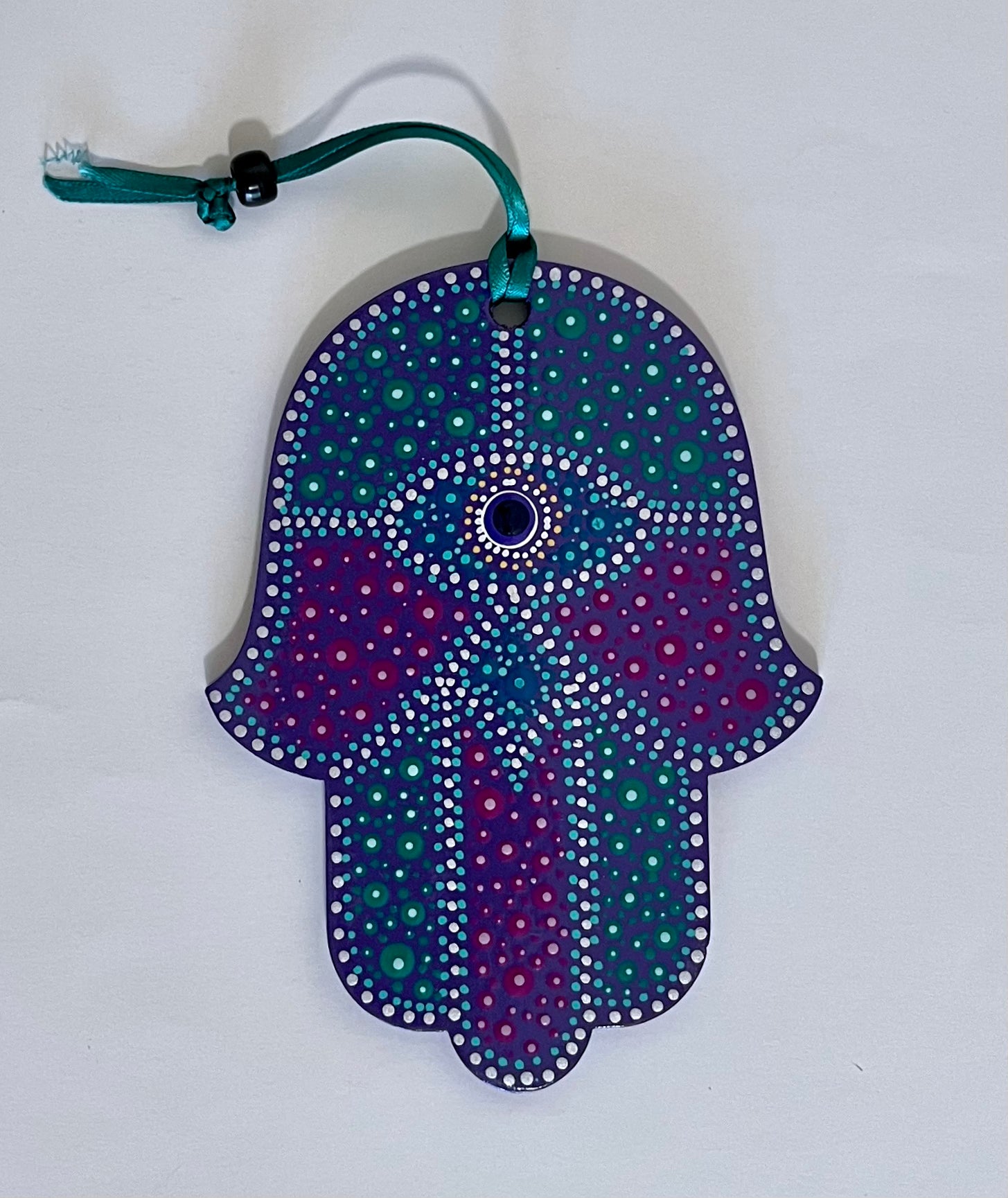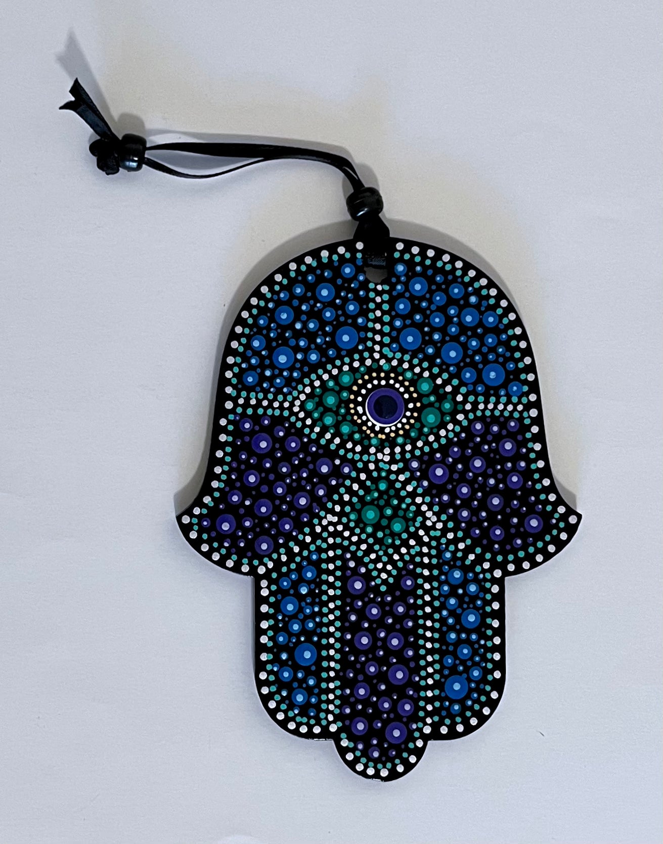 These beautiful Hamsas have dot patterns with a mosaic look with metallic highlights. The traditional "Eye" is included as a symbol of protection. It is hand-painted in acrylic and sealed with a clear protective coating. Includes a ribbon loop for easy hanging.