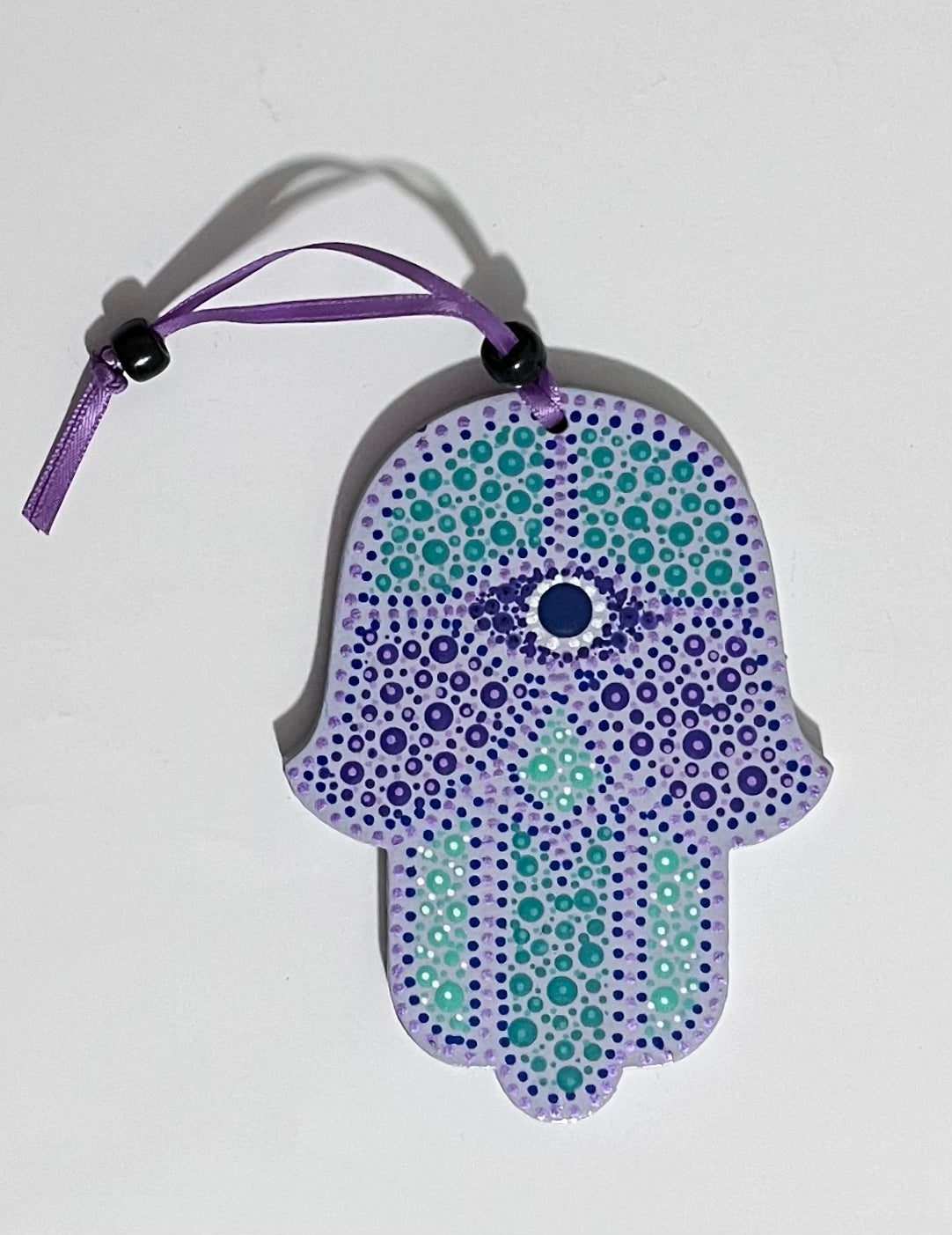 This beautiful Hamsa has dot patterns in purples and greens with a mosaic look. The traditional "Eye" is included as a symbol of protection. It is hand-painted in acrylic and sealed with a clear protective coating. Includes a ribbon loop for easy hanging.