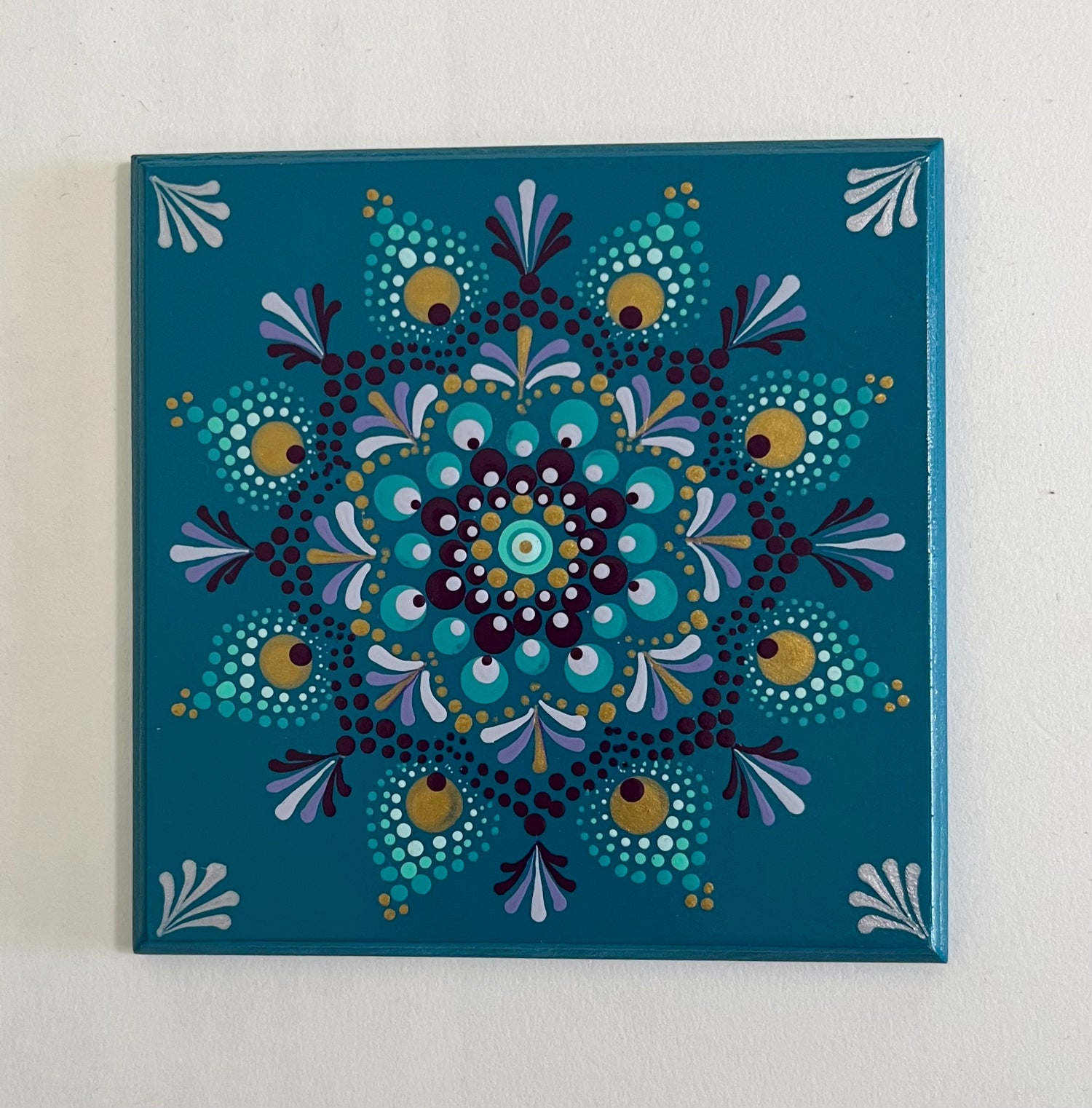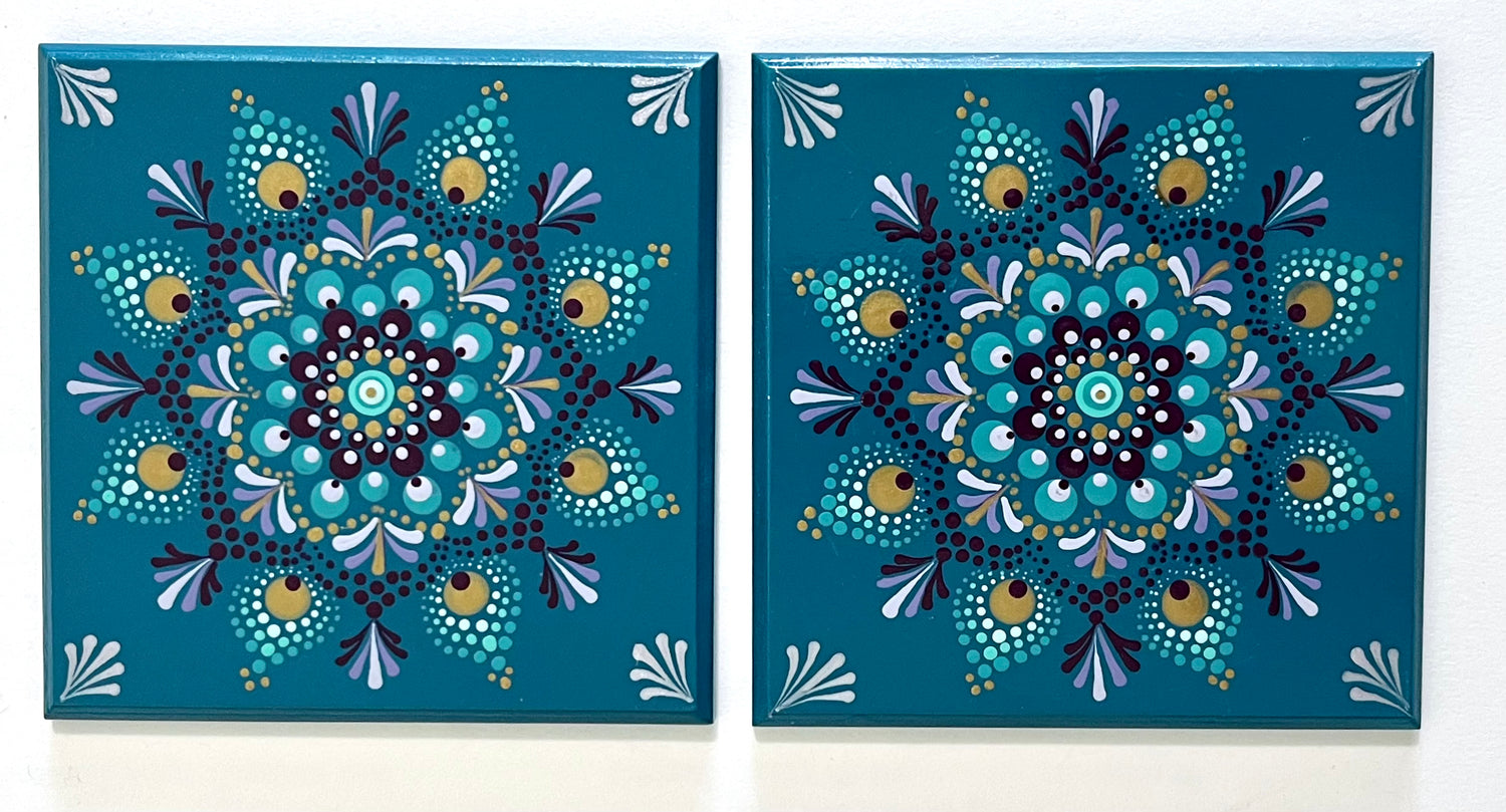 This unique set of 2, 4 inch coasters are hand-painted with an acrylic dot mandala pattern on a Lagoon Green background. Metallic gold with rich wine, green and lavender colors create elegant and striking patterns. These beauties will add eye-popping accents to any room! The coasters are protected with a spray finish and have a cork backing to protect all of your surfaces.