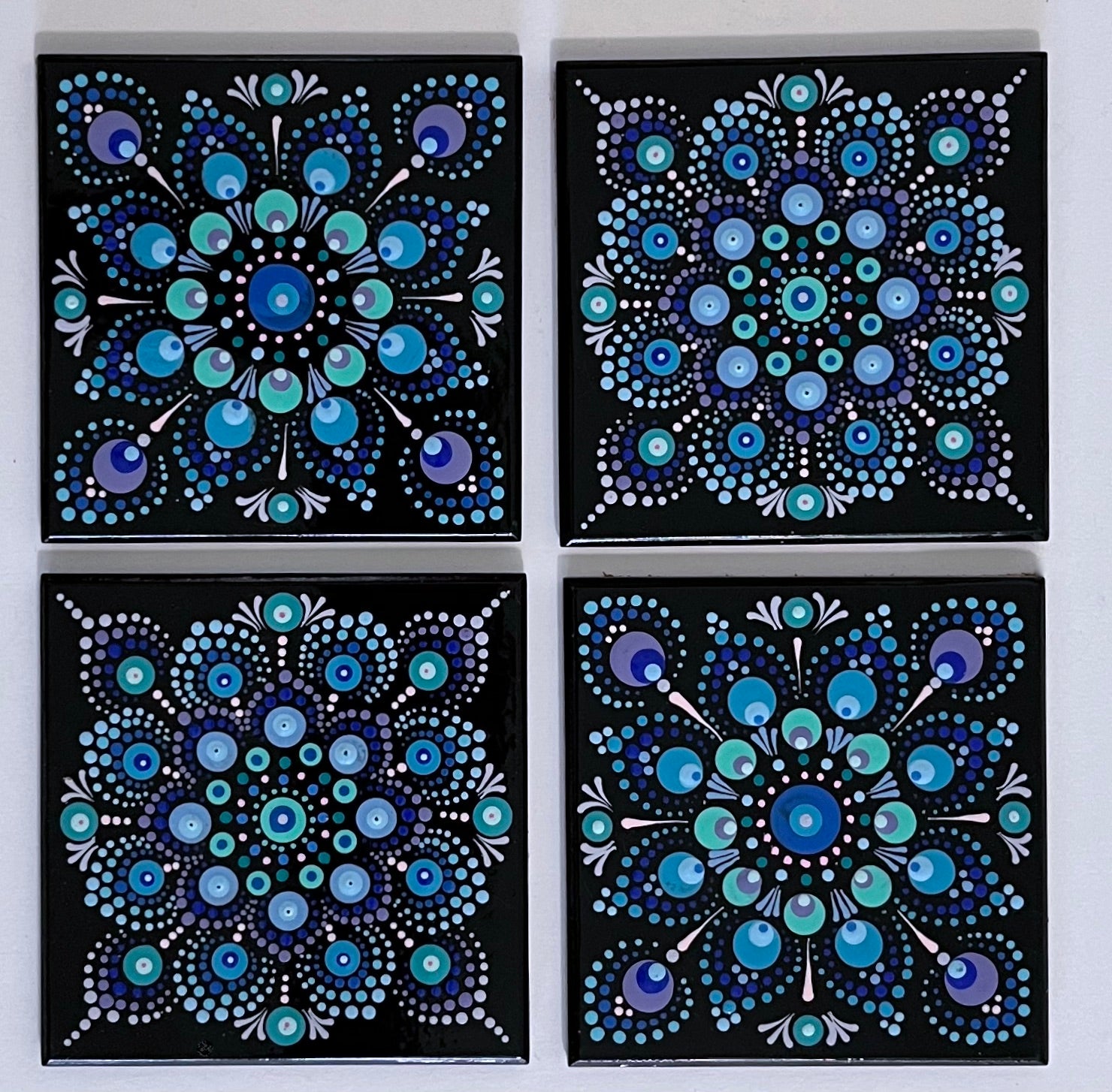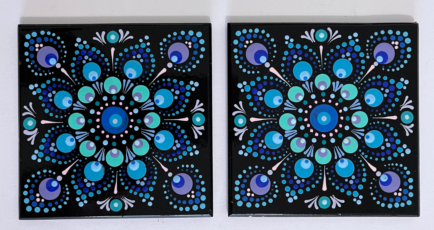 This unique set of 2, 4 inch coasters are hand-painted with an acrylic mandala dot pattern on a black background. Cool tones with turquoise, blue and lavender colors create elegant and striking patterns. These beauties will add eye-popping accents to any room! The coasters are protected with a spray finish and have a cork backing to protect all of your surfaces.