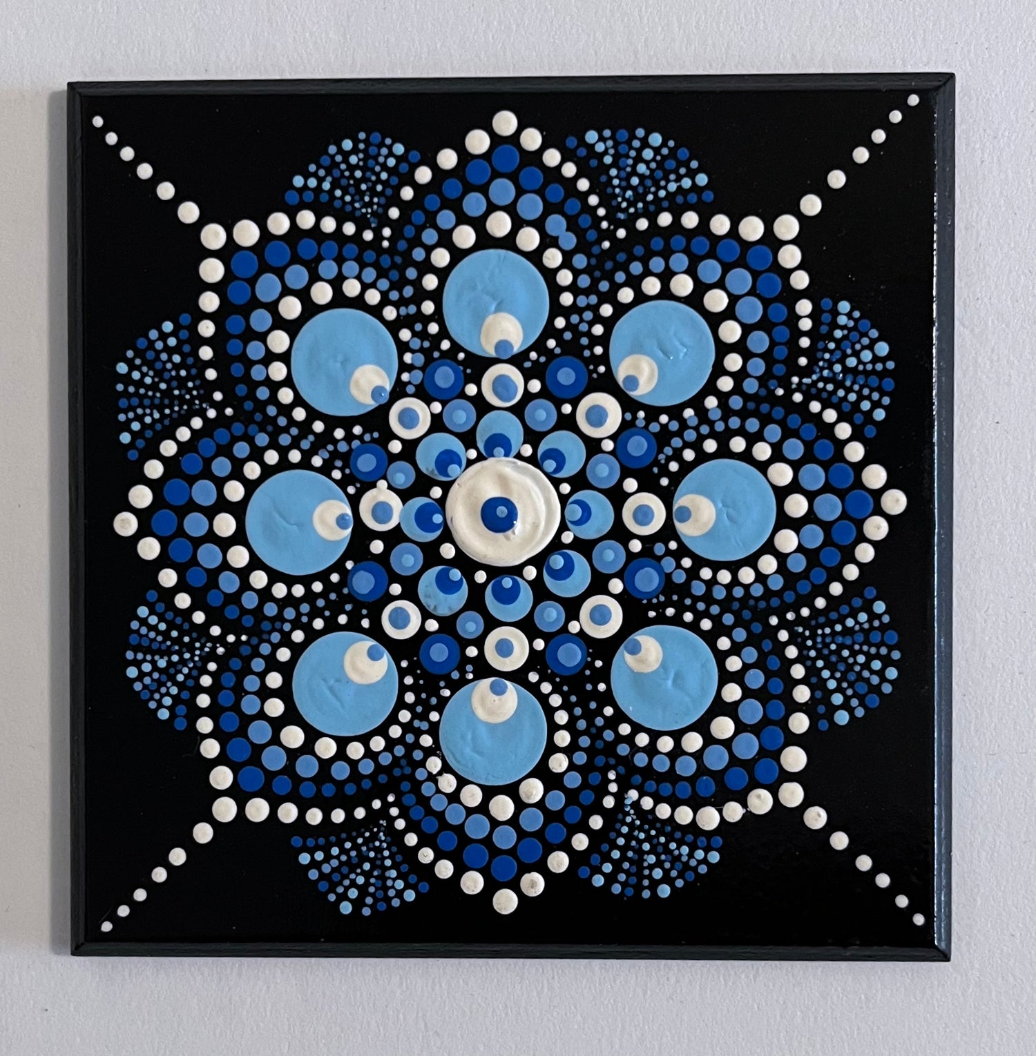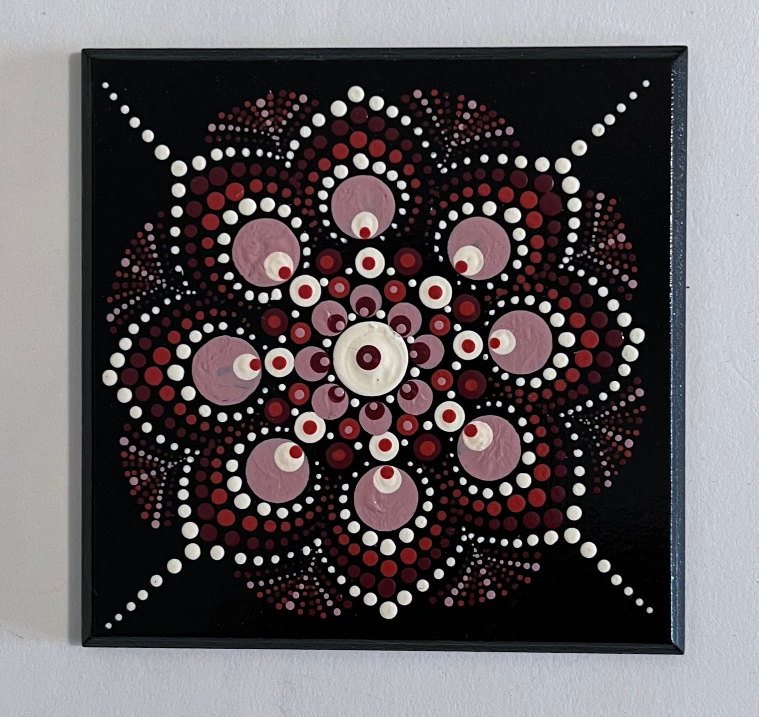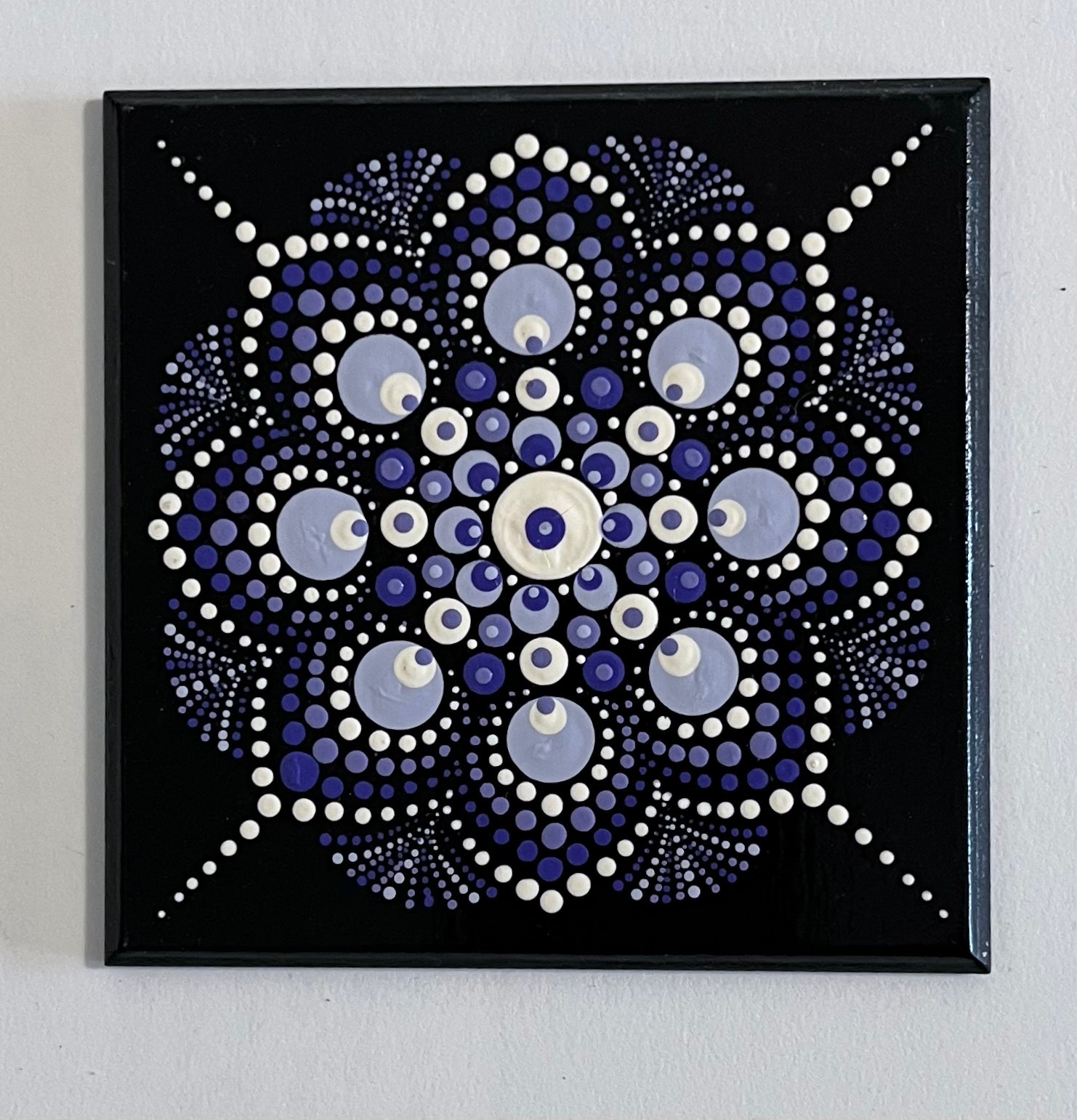 This unique set of 4 inch coasters is hand-painted with a similar acrylic dot mandala pattern on a black background. Each coaster is slightly different with varied colors in Blue, Purple, Green or Wine accents. The coasters are protected with a spray finish and have a cork backing to protect all of your surfaces.