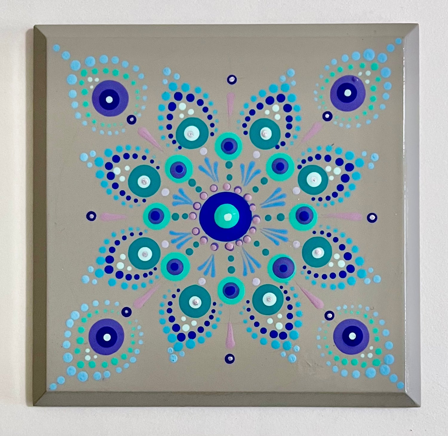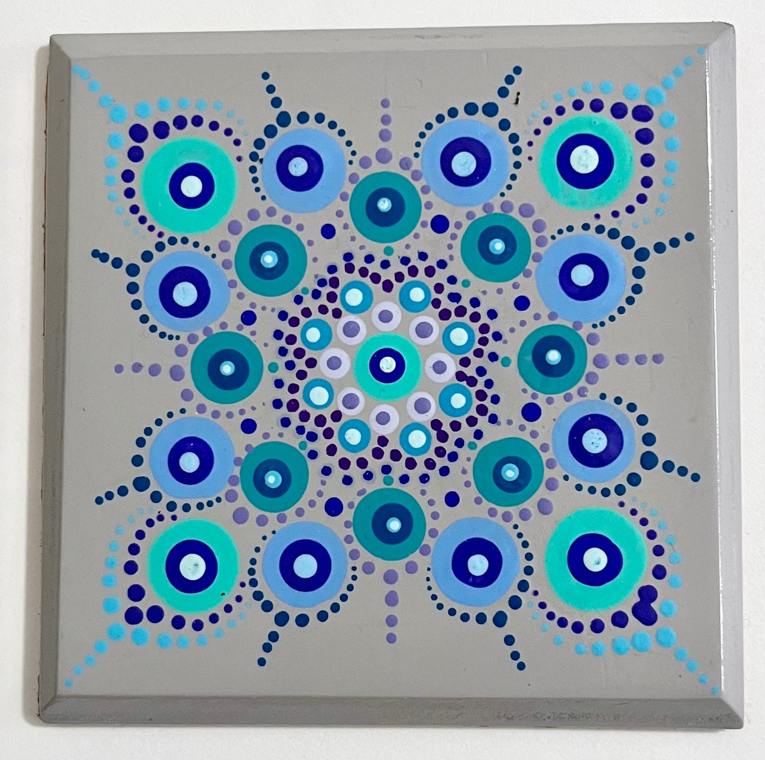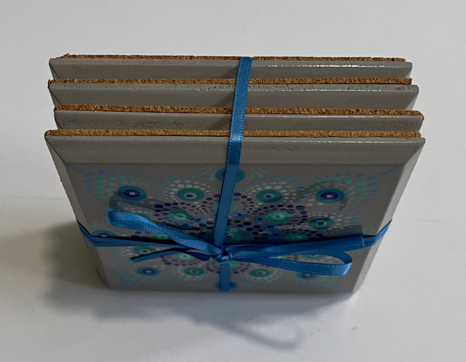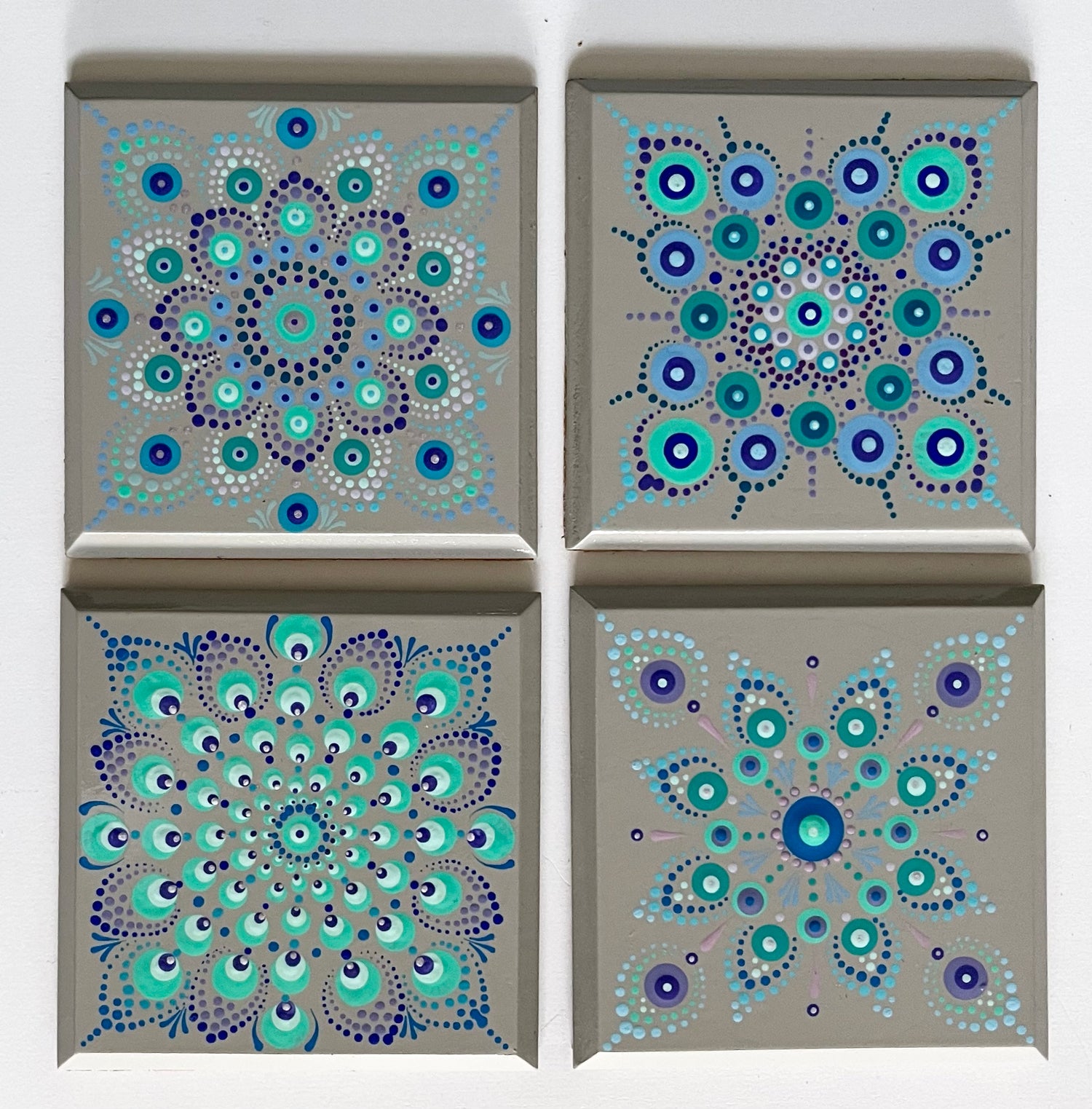 This unique set of 4 inch Grey coasters is hand-painted with acrylic dot mandala patterns. Cool pastels invite the viewer into an intricate world of color and pattern. These beauties will add eye-popping accents to any room! Each coaster in this group is created with a different mandala pattern in similar colors. The coasters are protected with a spray finish and have a cork backing to protect all of your surfaces.