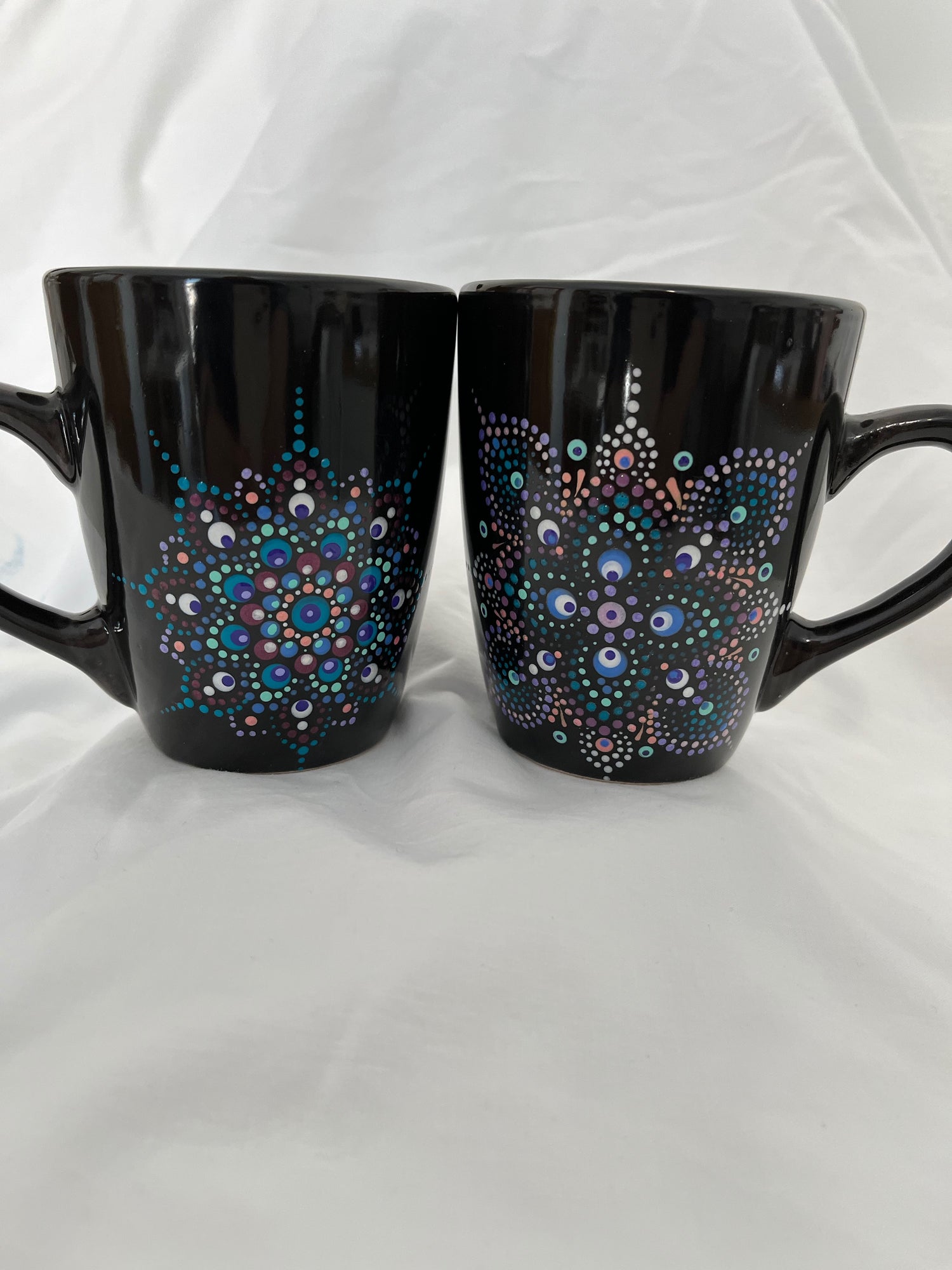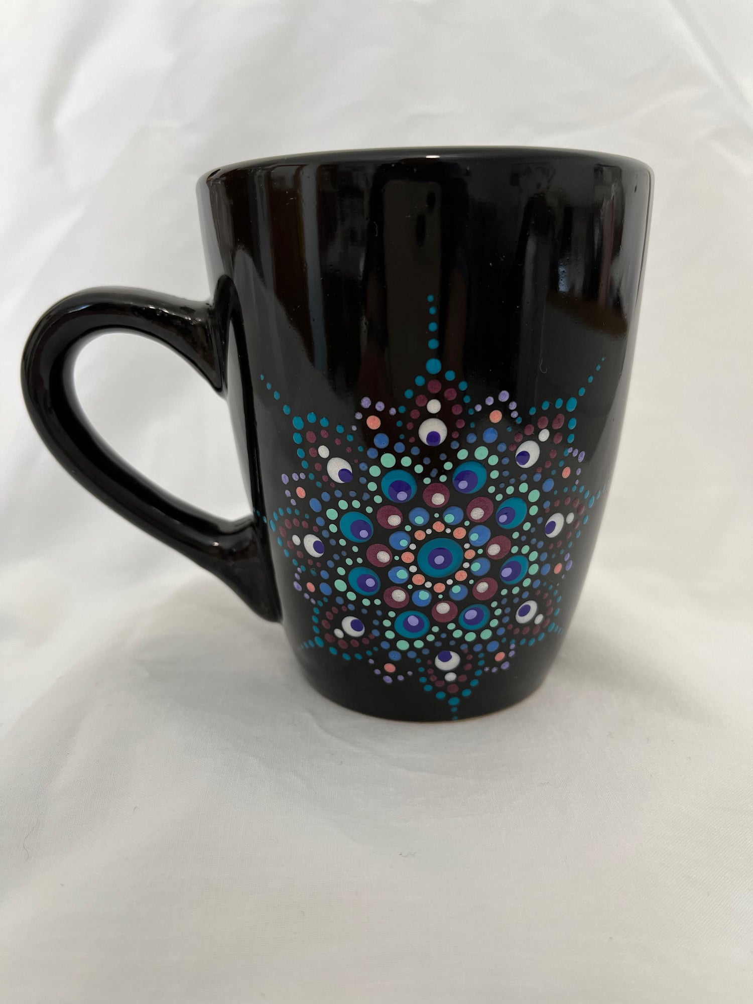 Cool tones in blues, purples, corals and metallic silver adorn this little beauty. Made for my twin sister Marla in her favorite colors. A turquoise and purple mandala appears on the left-handed side, with a larger, butterfly-shaped mandala on the right-handed side. This mug is sure to calm your spirit with your hot beverage in the morning, noon or night!