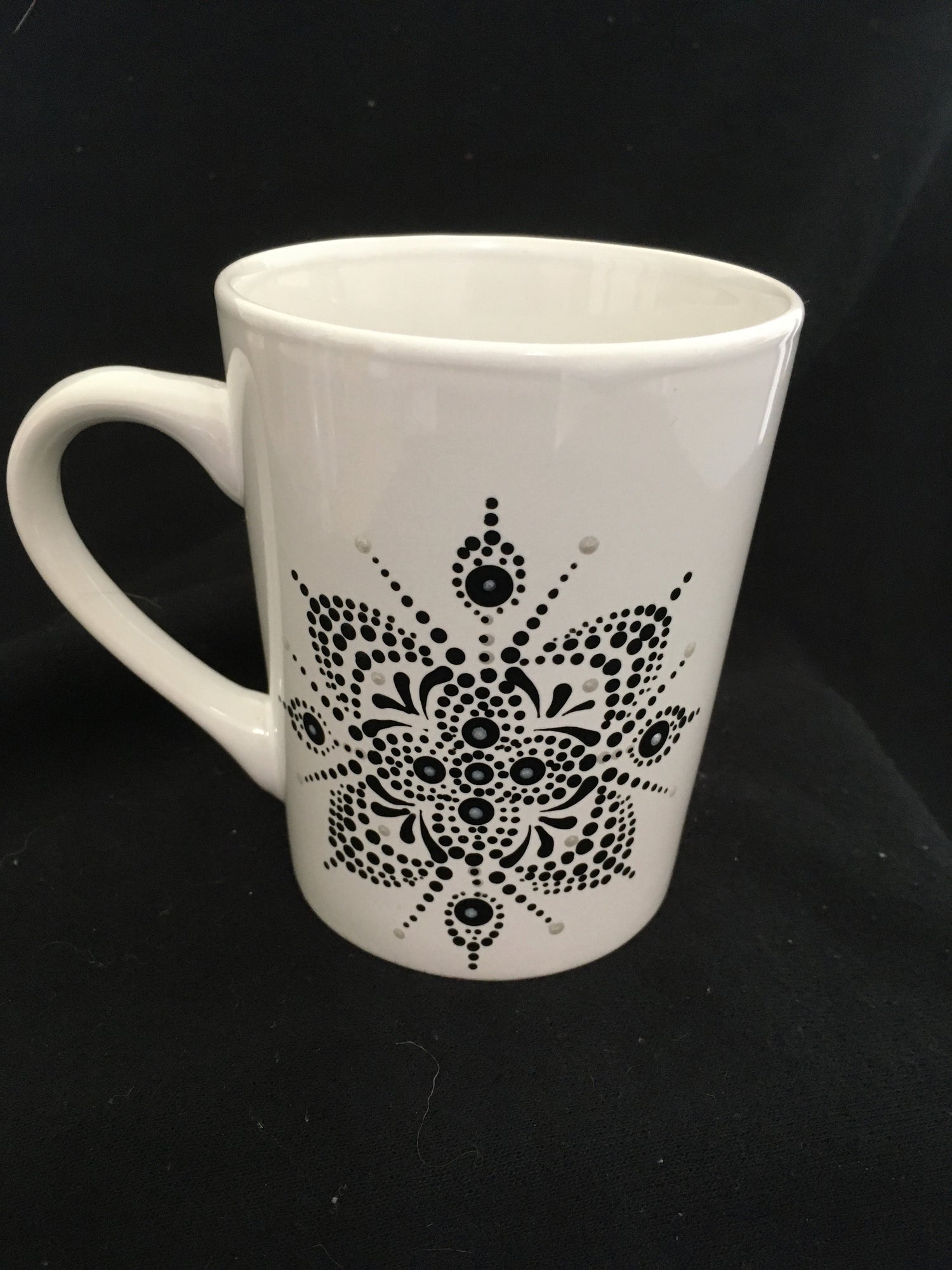This elegant black and silver mug will surely add a touch of class to your afternoon tea or morning coffee. Features a different Mandala pattern on each side. The raised texture of each dot will add a sensory experience to these harmoniously balanced designs. Pair this will any or all of the Black and Silver Mandala mugs for a special set, sure to be a great conversation piece!