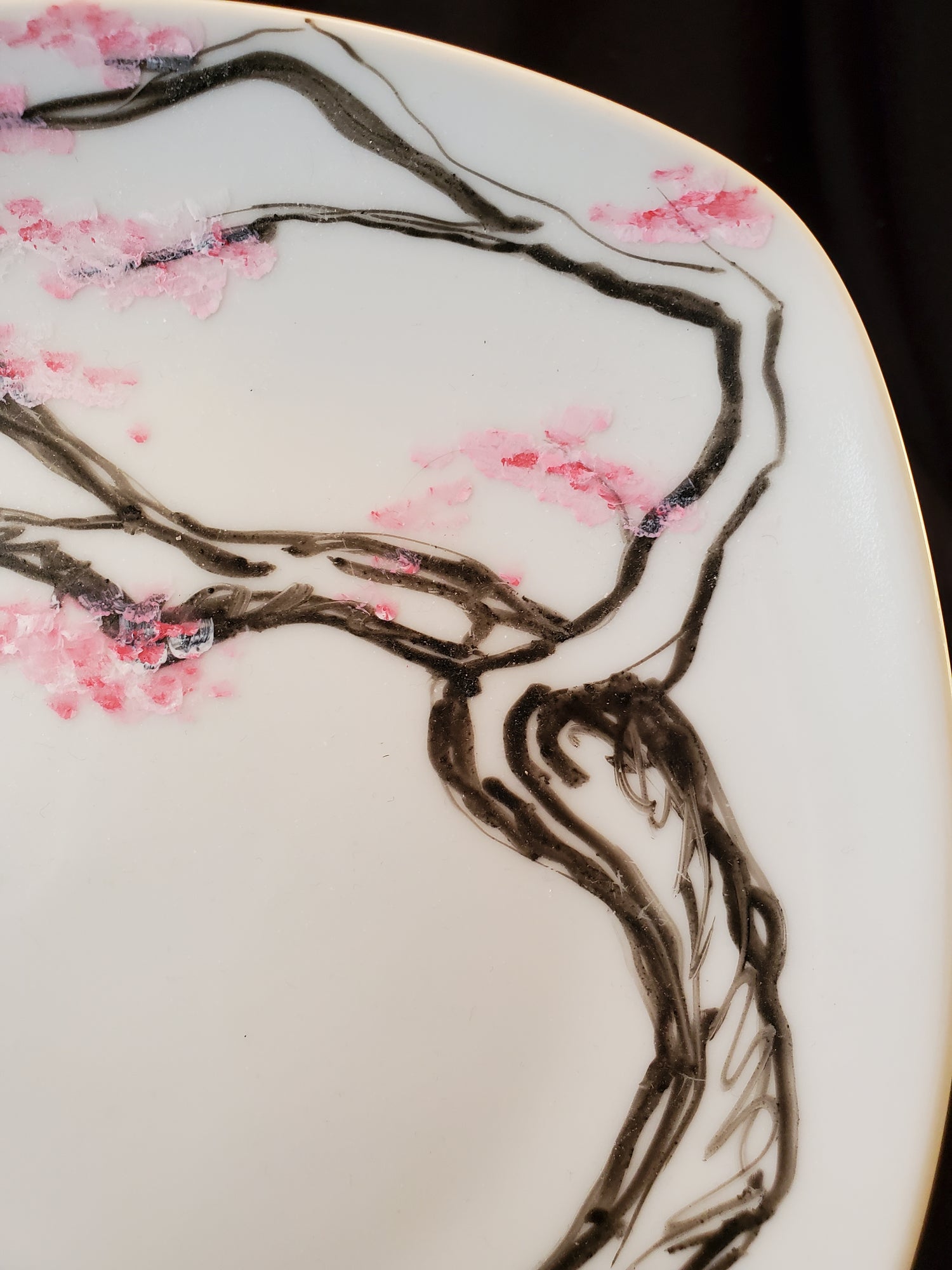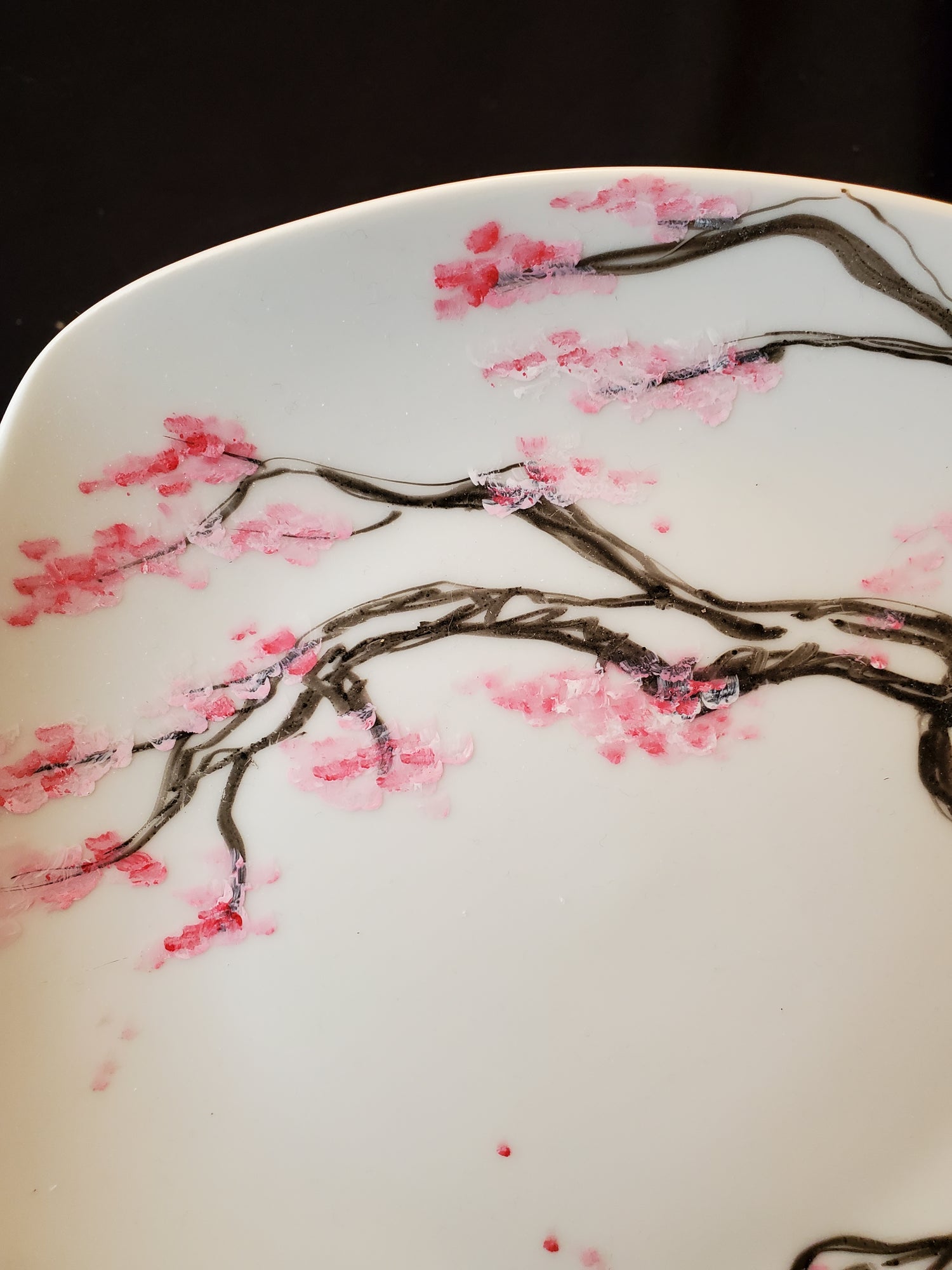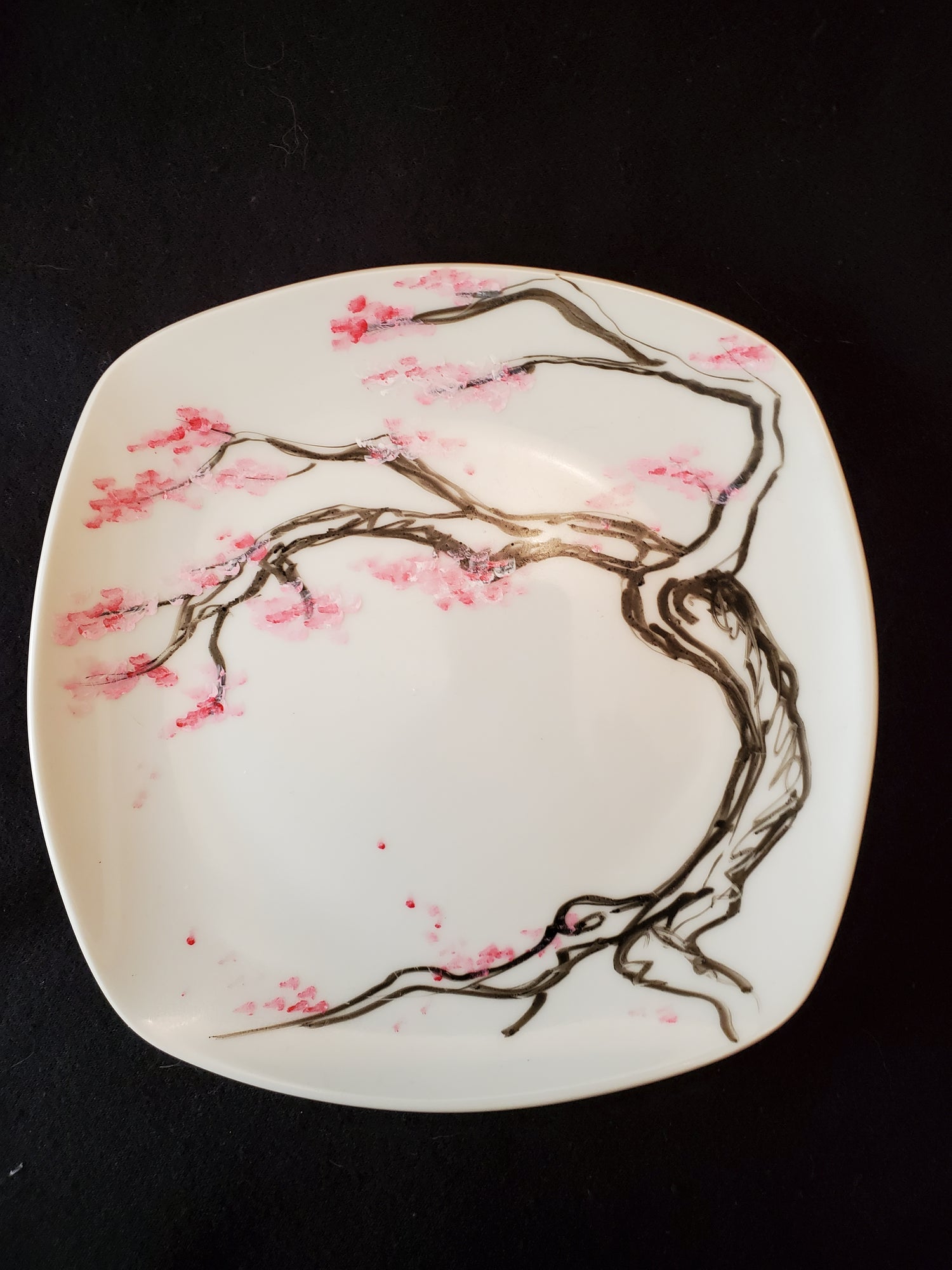 Cherry blossoms are a symbolic flower of the spring and renewal, and the fleeting nature of life. This small, 7.5 inch ceramic, hand-painted plate is an Asian-inspired decorative plate sure to add peace and joy to your home. Pair this with the large plate or another small cherry blossom plate for a delightful serving set. This delicately painted plate will look elegant on a decorative table easel.