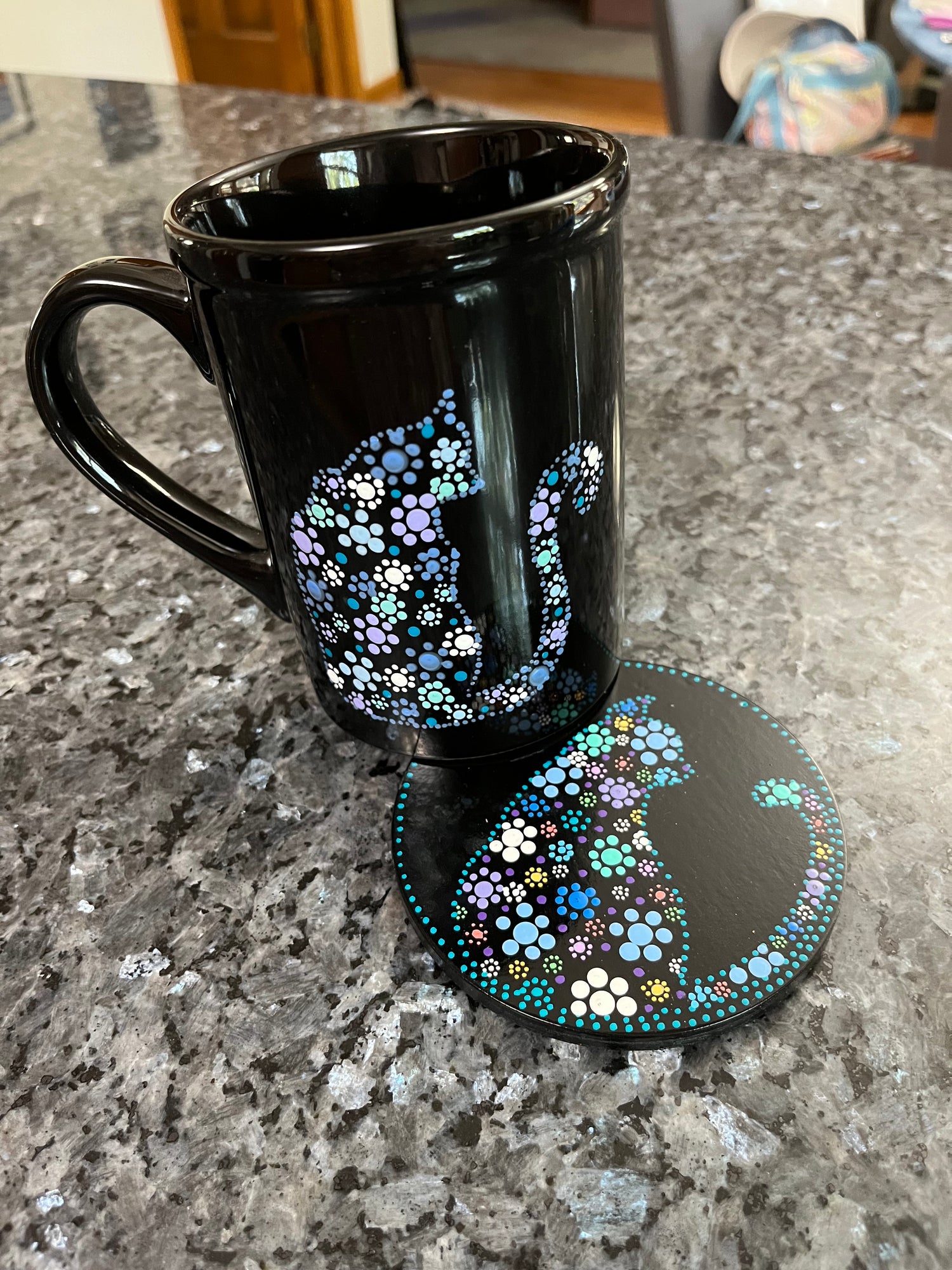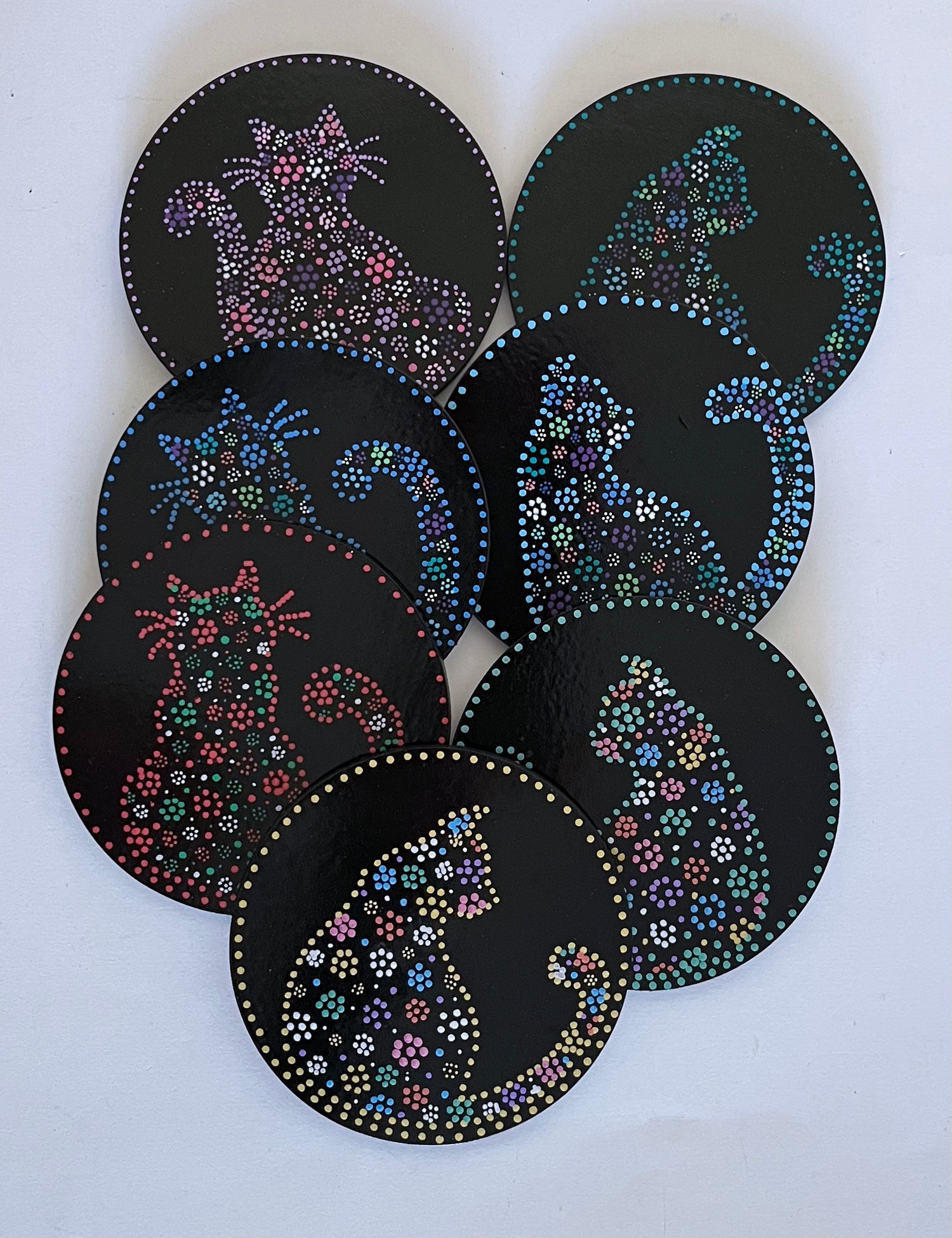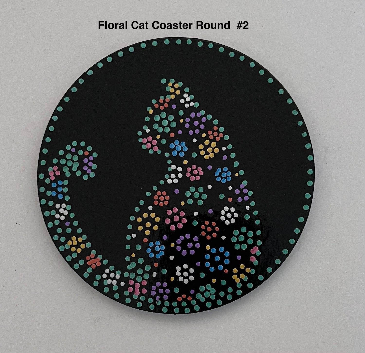 These adorable Cat Coasters are hand-painted with acrylic. Each coaster has a variation of a the Modern-style Floral cat pattern in a variety of colors and kitty profiles. The coasters are protected with a spray finish and have a cork backing to protect all of your surfaces.