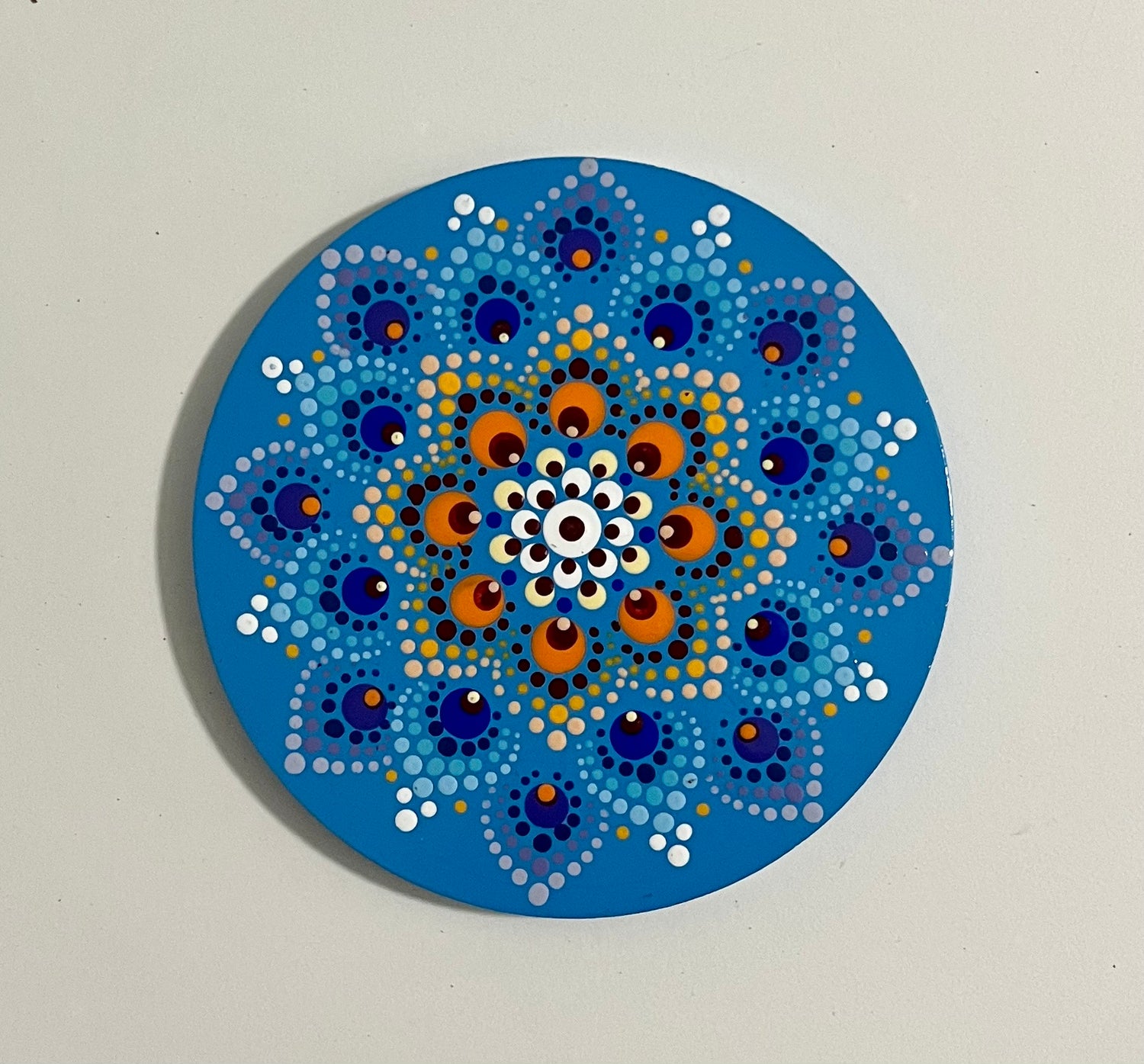 These unique 4 inch round coasters are hand-painted with acrylic dot mandala patterns on a turquoise blue background. These beauties will add eye-popping accents to any room! The coasters are protected with a spray finish and have a cork backing to protect all of your surfaces.