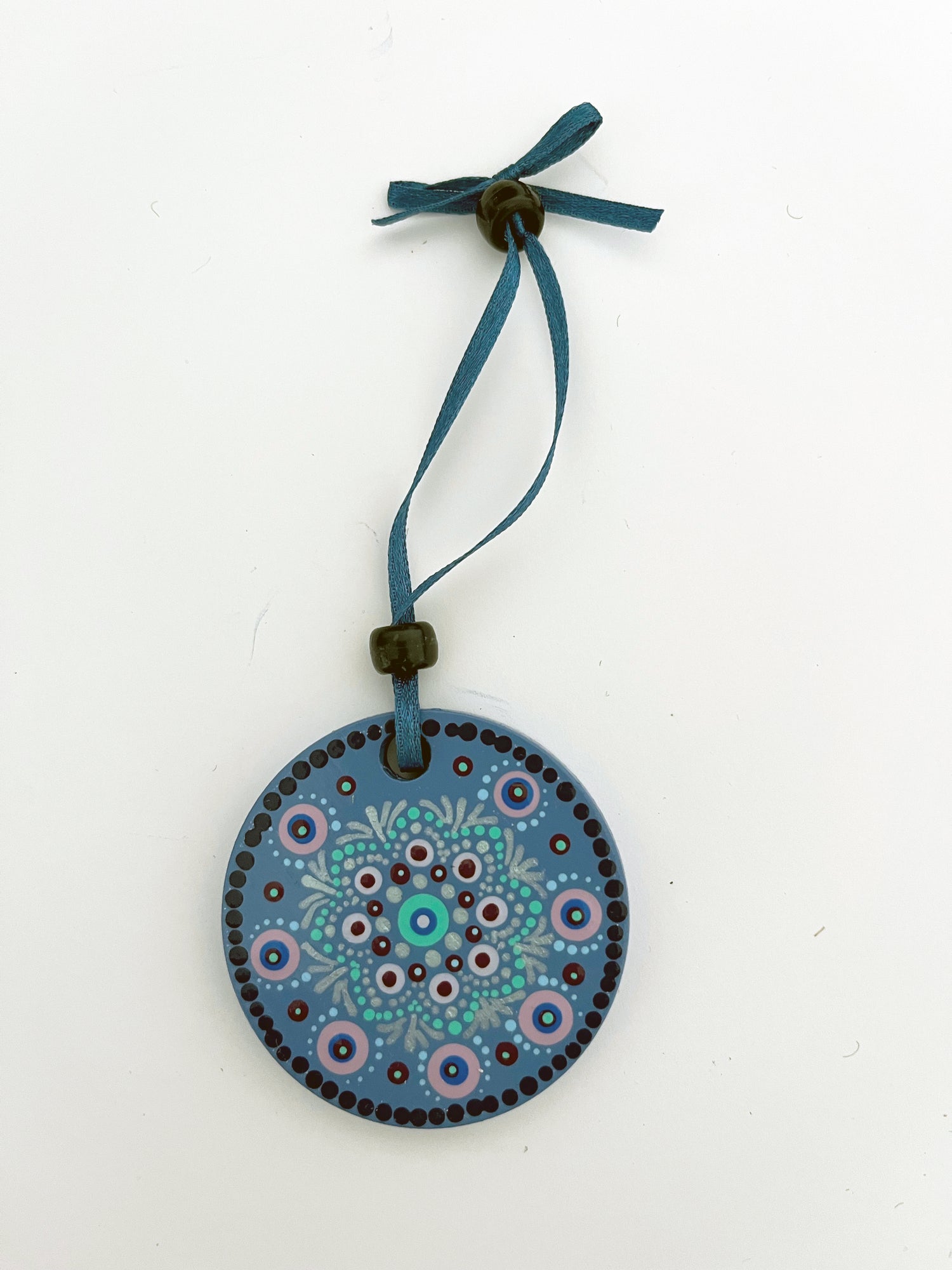 Metallic silver, blue, lilac, burgundy and mint green come together in a delicate mandala pattern on this small, precious decorative hanging. For wall decoration, Christmas tree, or in any room as a peace talisman. Bead and ribbon hanger. Can also be used as a keychain.