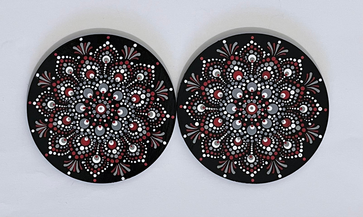 Round Scarlet & Grey Mandala Coasters - Black (set of 2)