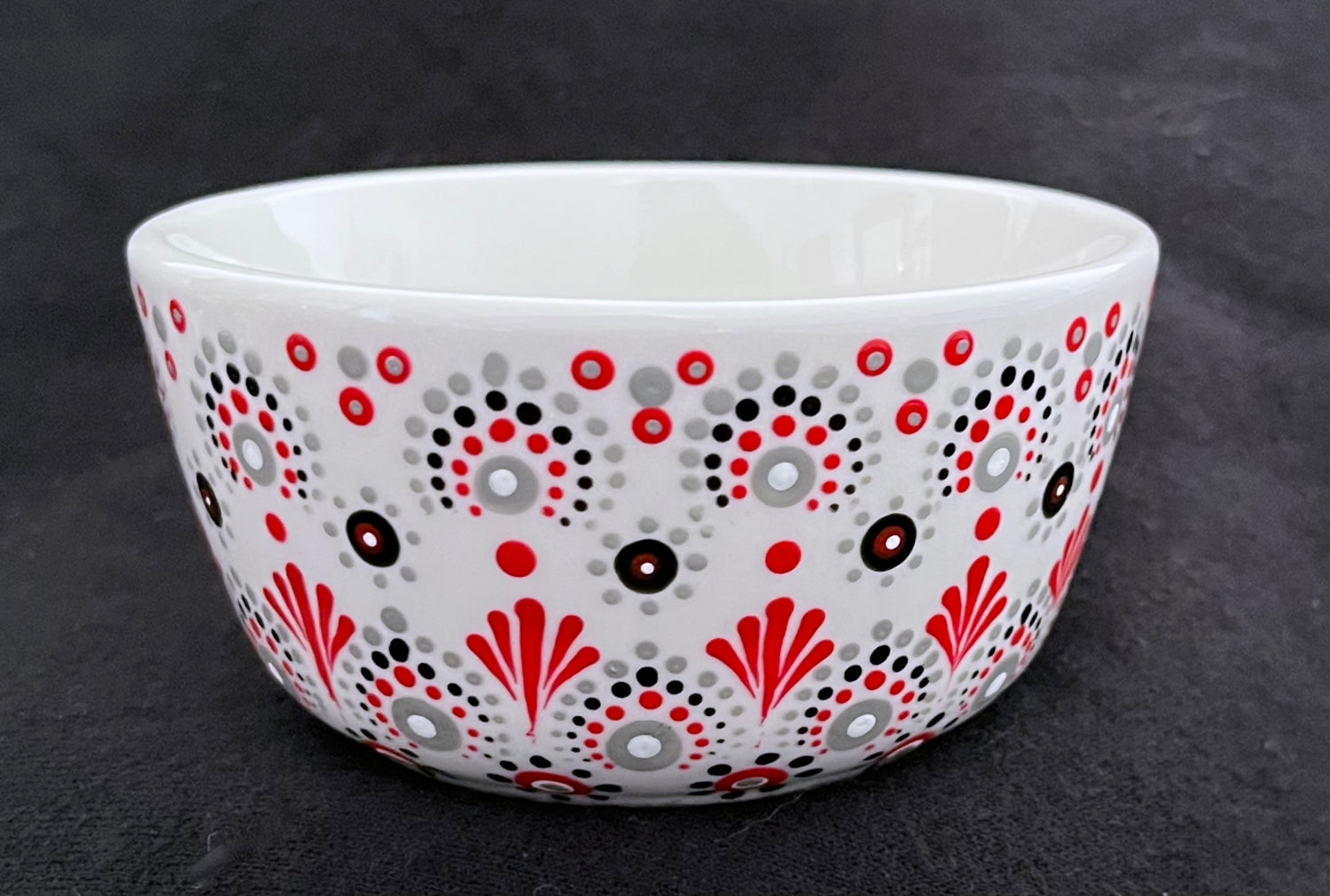 Show your team spirit with these Scarlet & Grey Dip Bowls! A mandala dot pattern in scarlet, white, black and grey adorns these hand-painted bowls, perfect for dips, nuts or candies. A perfect addition for a dorm room or for entertaining any Buckeye fans! Each sold separately.