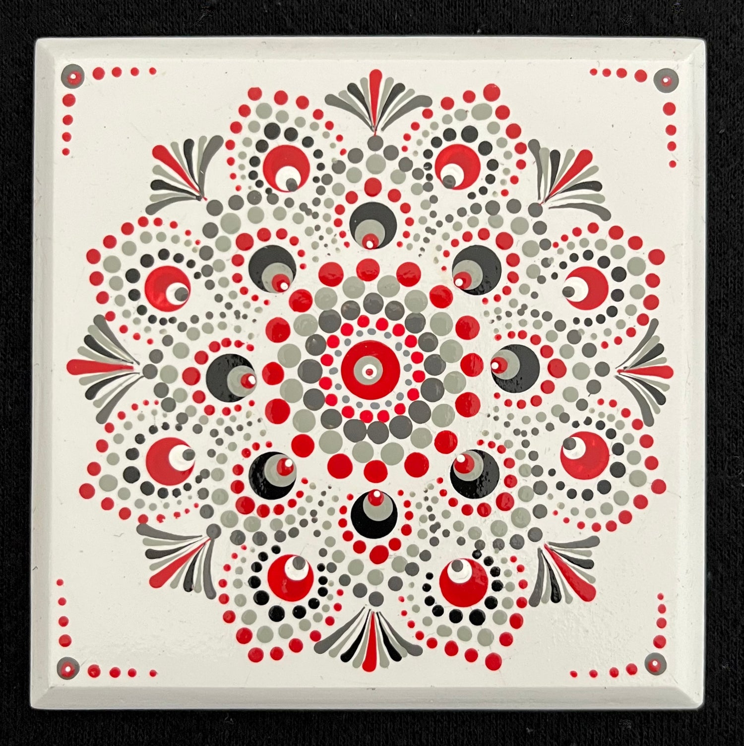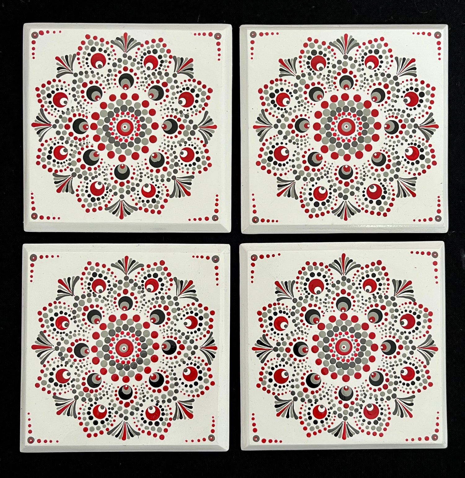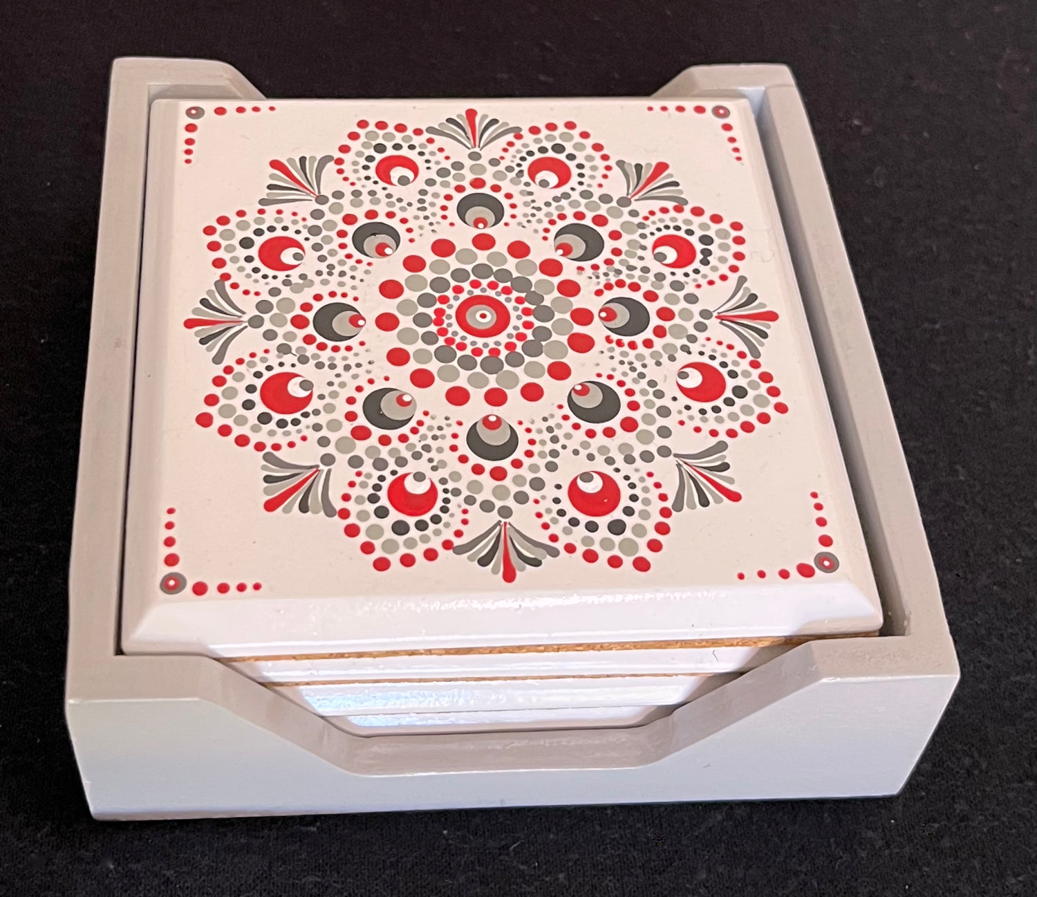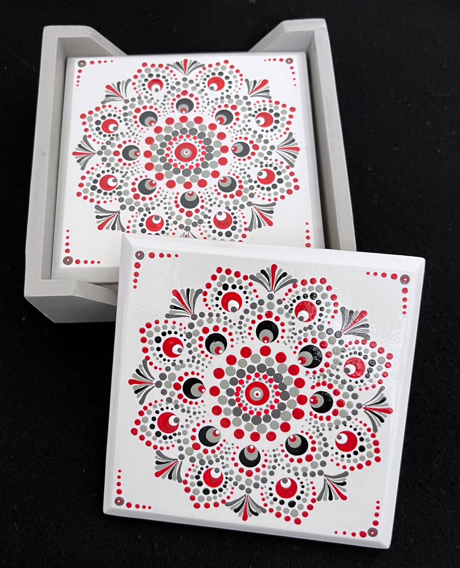 Scarlet & Grey Mandala Coasters - White. Set of 4 with box