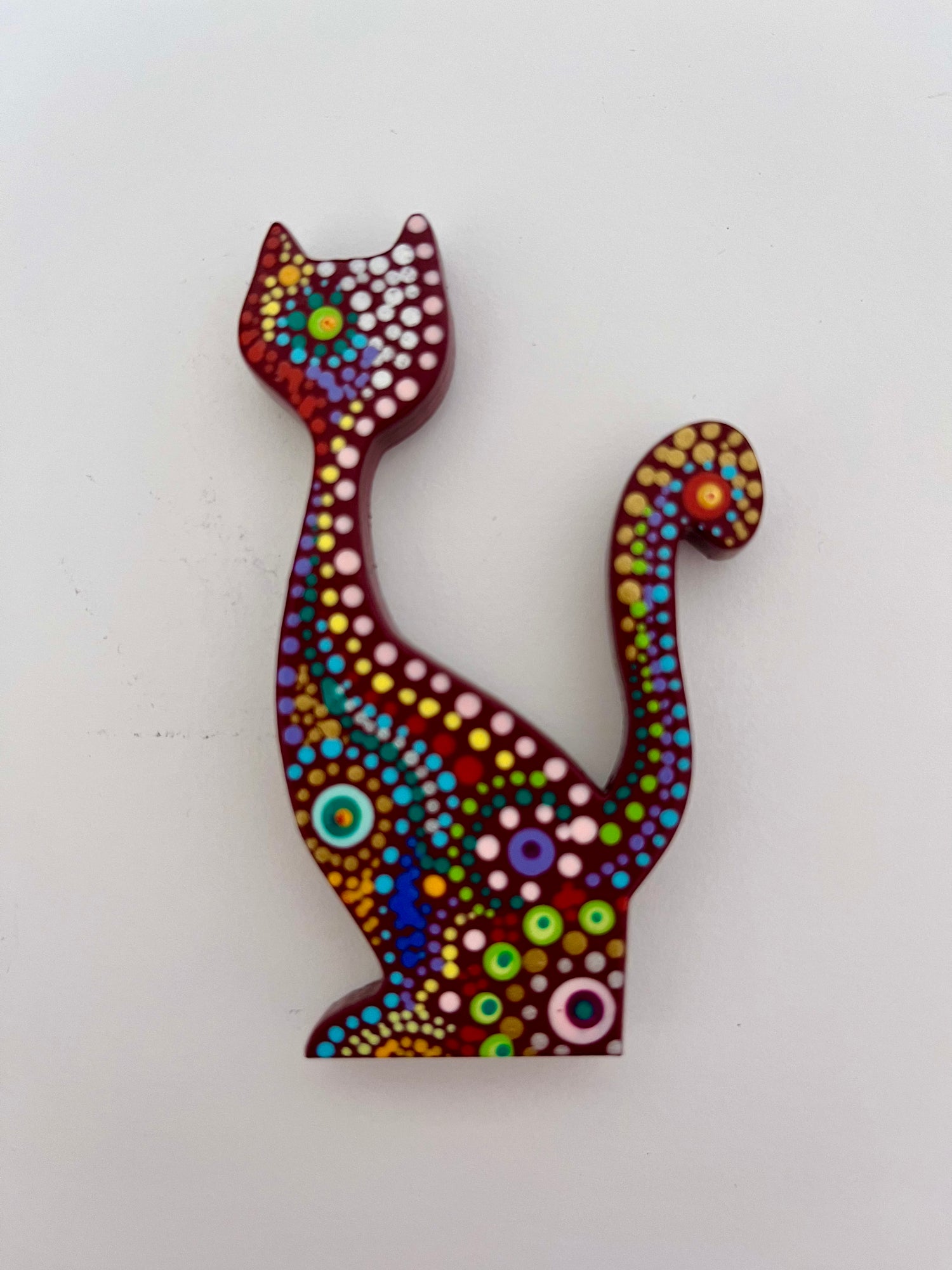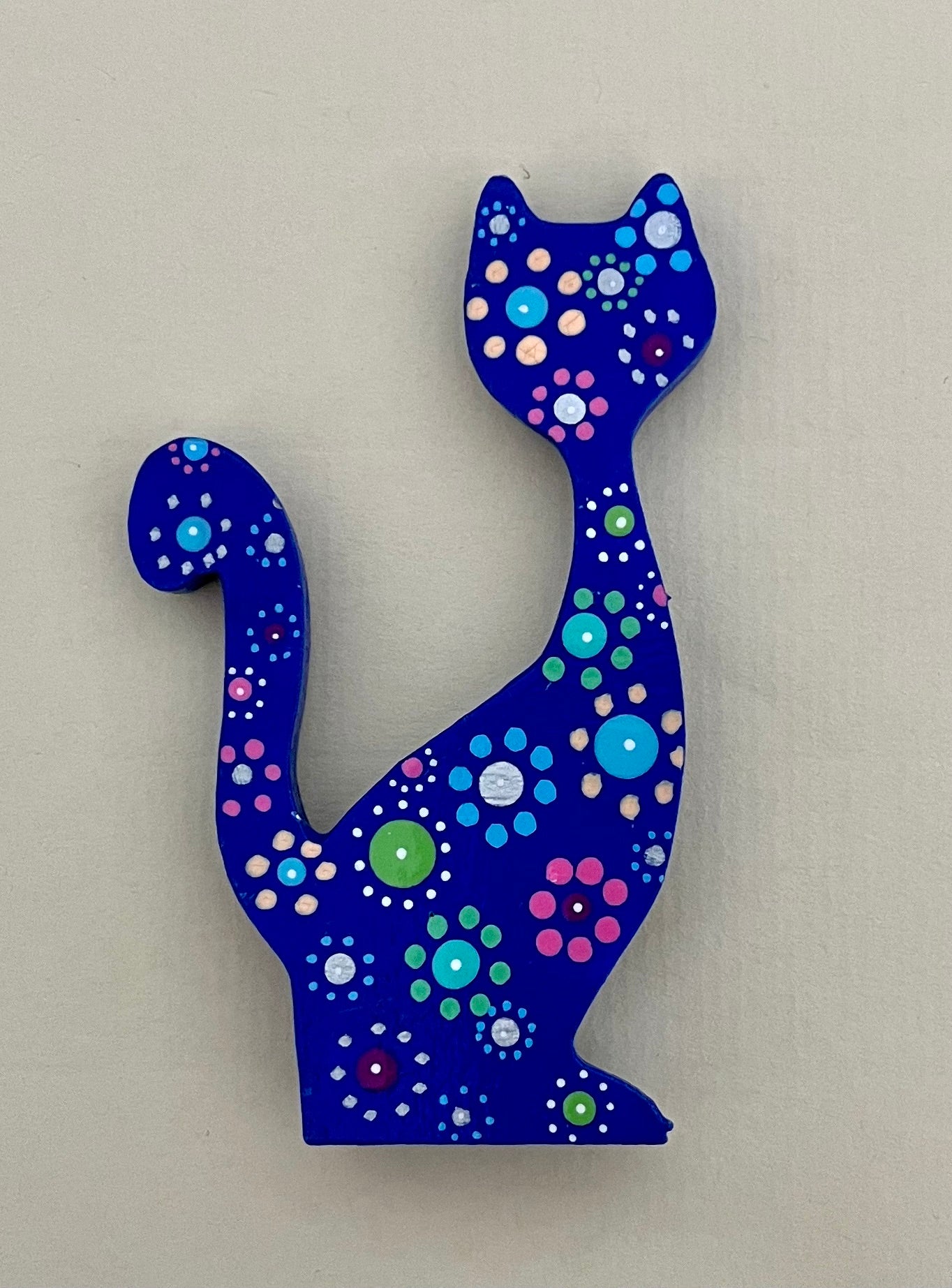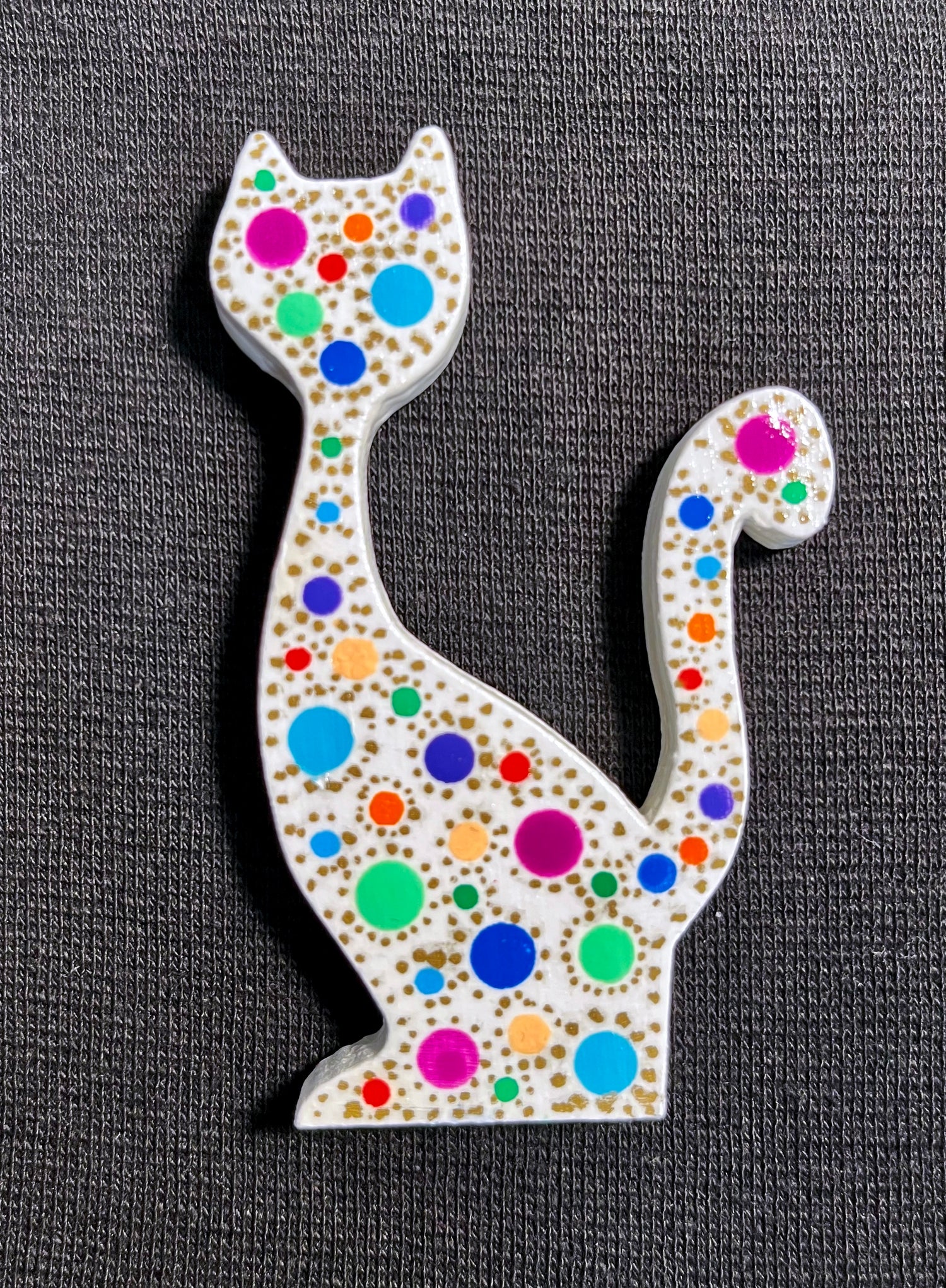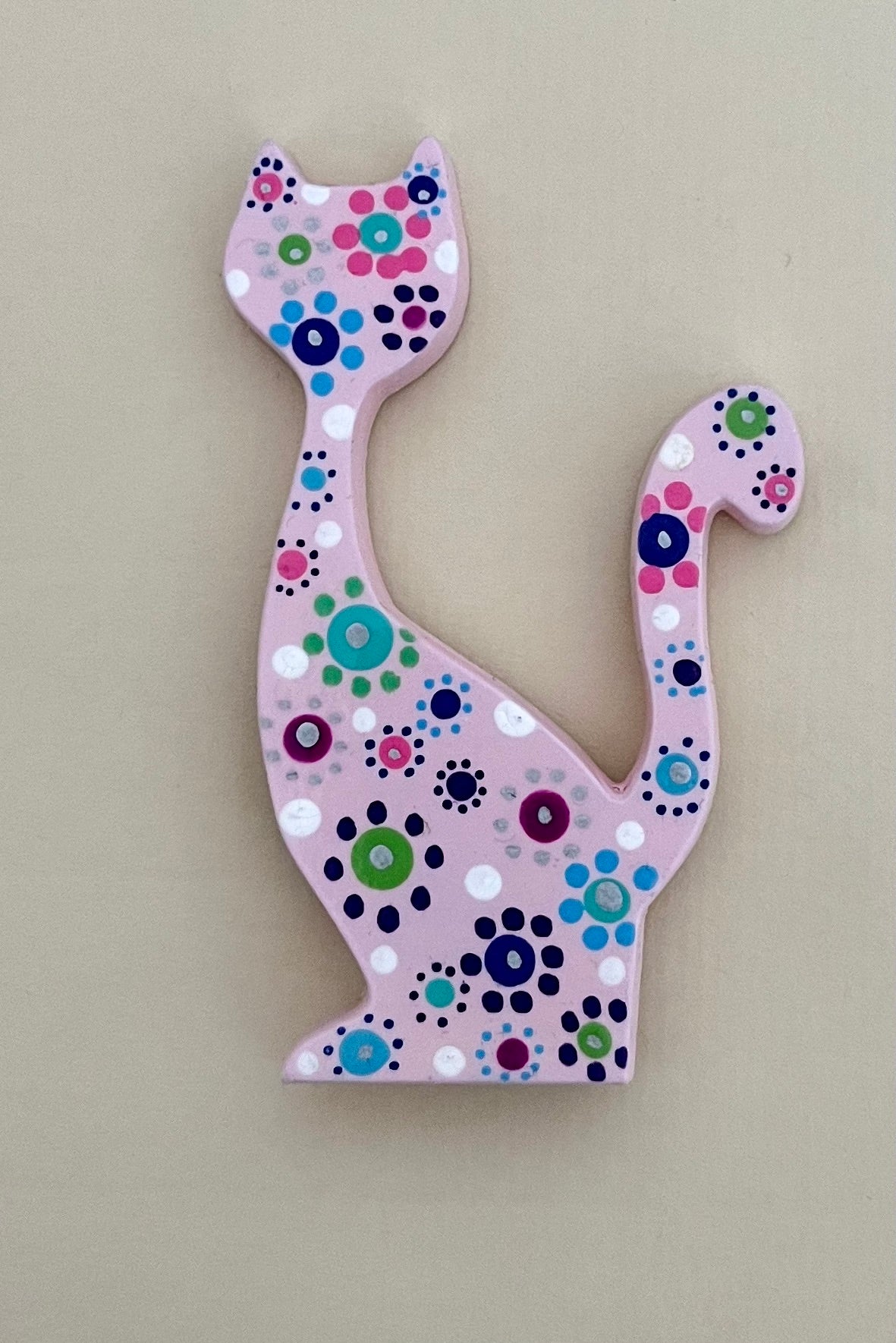 This cute wooden cat magnet is hand painted with acrylic and finished with a protective clear-coat spray. Dotted in a bright multi-colored palette on various background colors, this little gem would be a delightful gift! Metallic highlights in gold or silver adorn some of these kitties. Brighten someone's day with a pretty kitty!