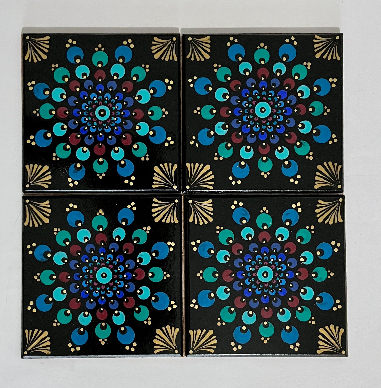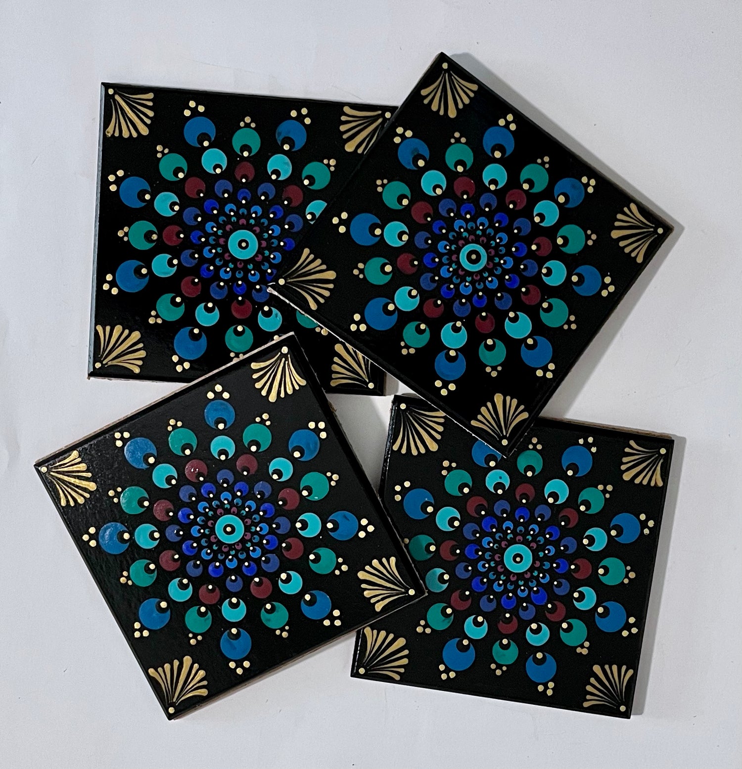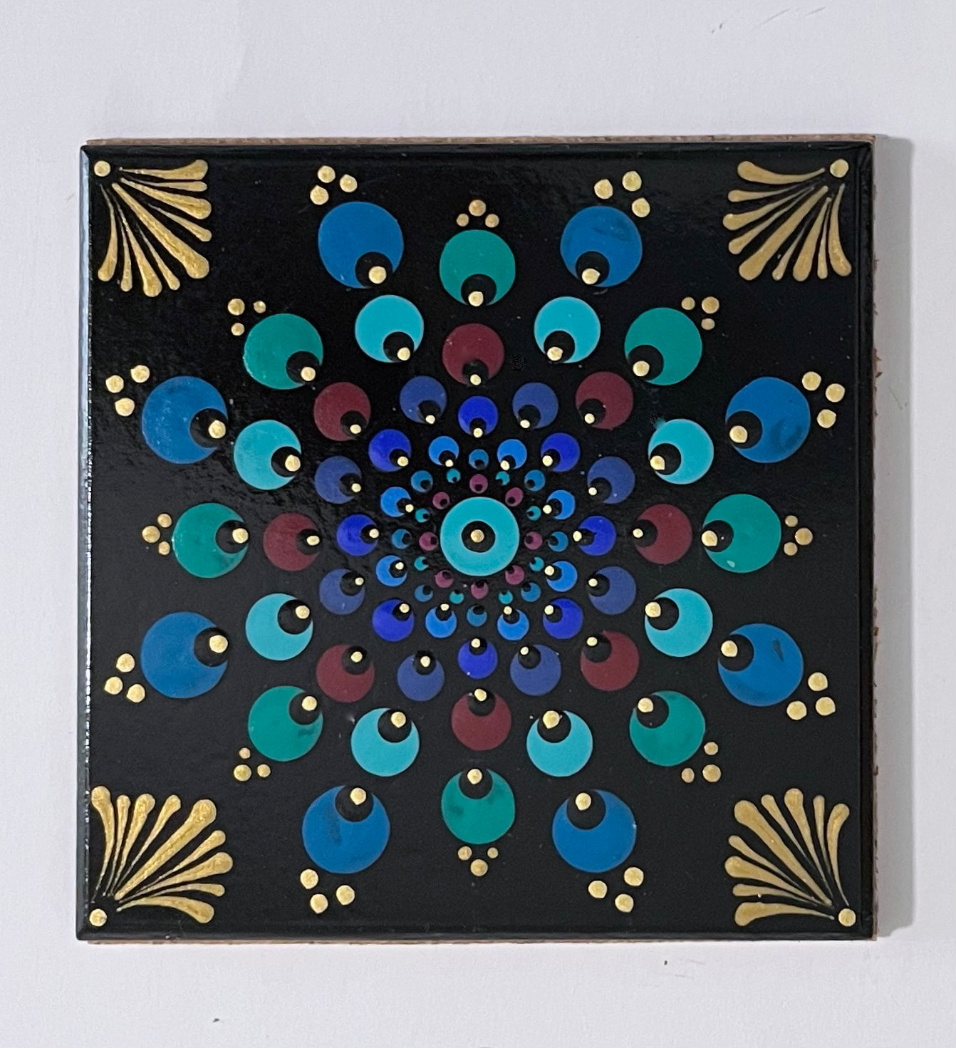 This unique set of 4 inch coasters is hand-painted with acrylic. It features a mandala pattern on a black background, with blue and greet dots with burgundy and metallic gold accents. These beauties will add eye-popping accents to any room! The coasters are protected with a spray finish and have a cork backing to protect all of your surfaces.