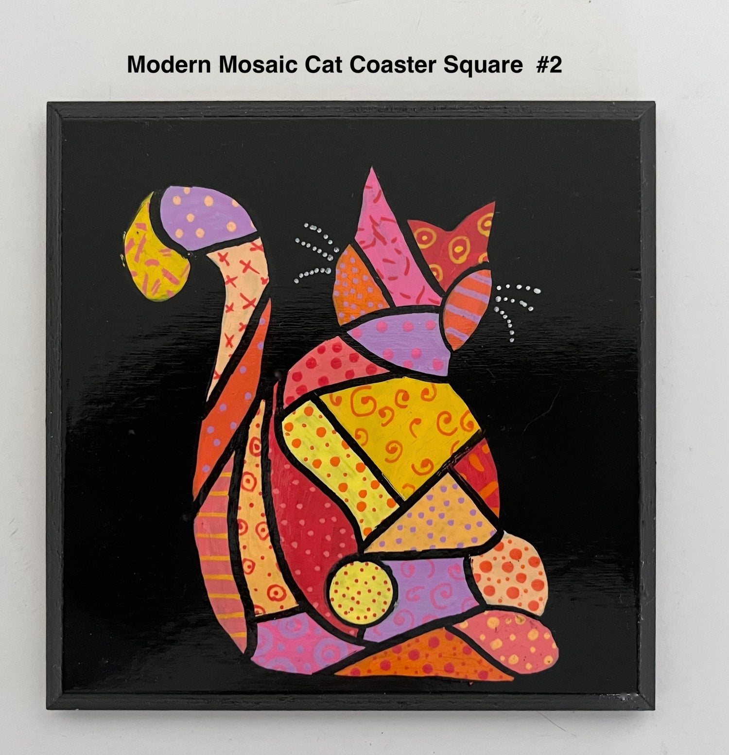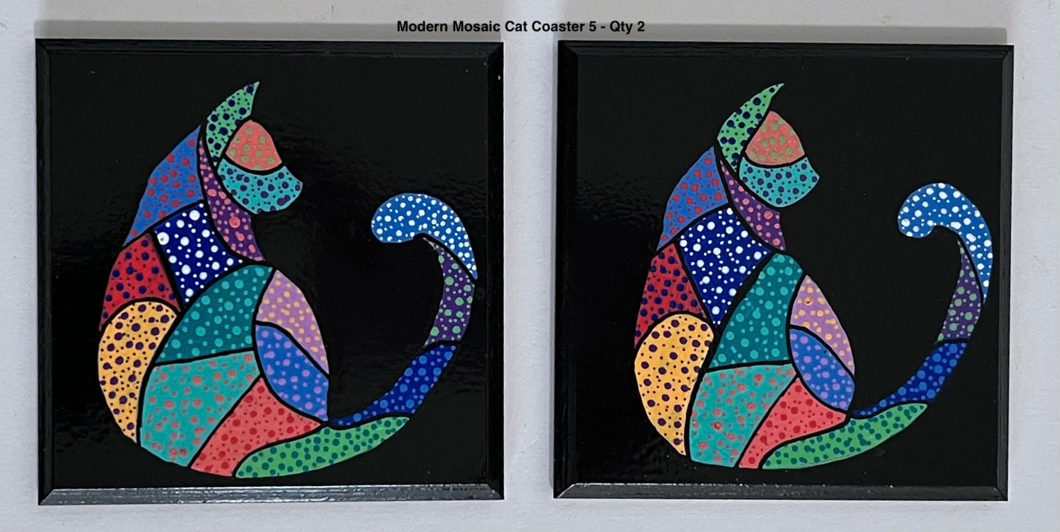 These adorable Modern Mosaic Cat Coasters are hand-painted with acrylic. Each coaster has a variation of a the Modern Mosaic cat pattern in a variety of bright colors and poses. The coasters are protected with a spray finish and have a cork backing to protect all of your surfaces.