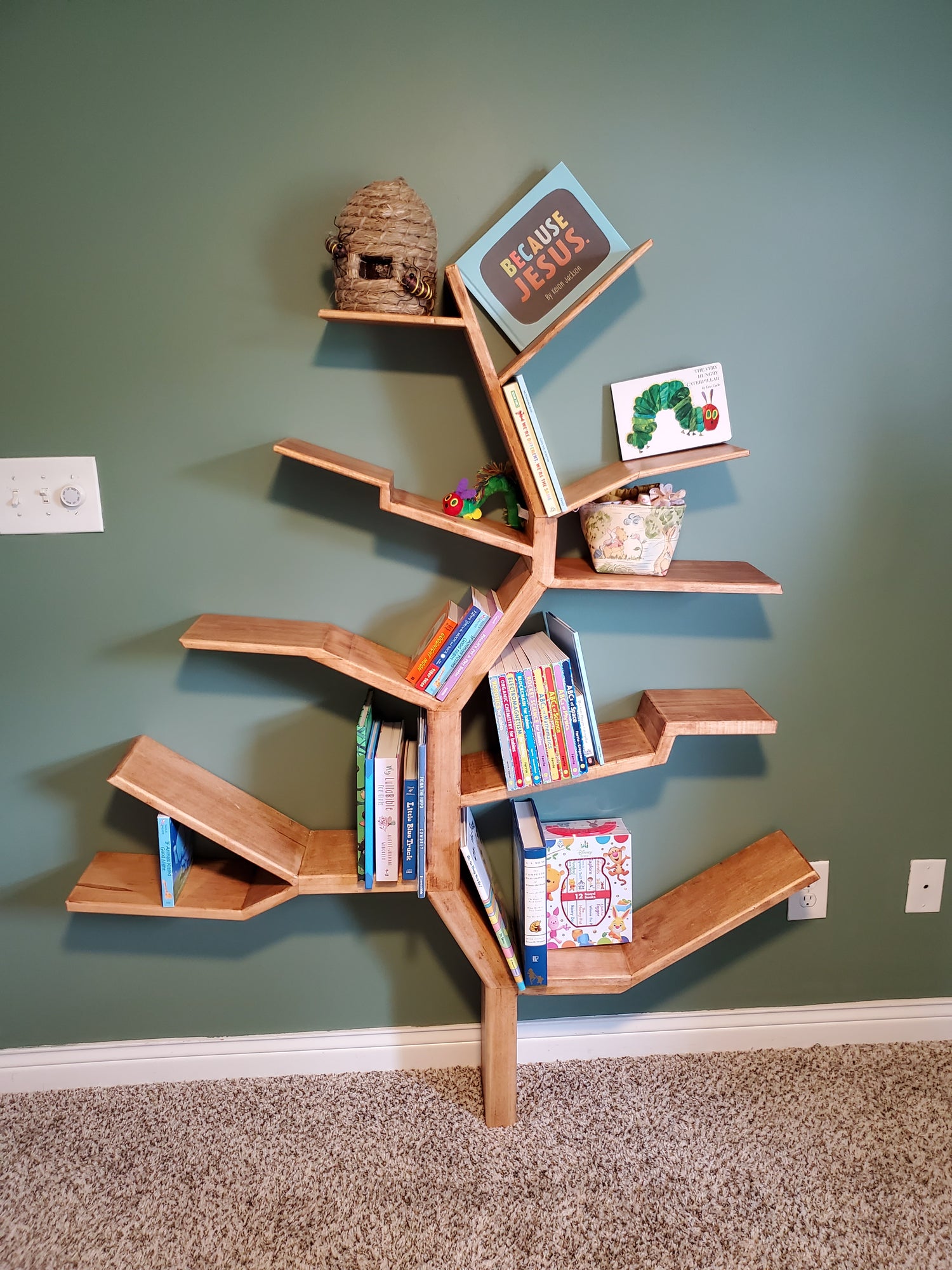 This was my most complex project to date, since the trunk and the branches each had their own unique angles! Not a 90 degree joint anywhere! But it was a ton of fun to design! This bookcase is made from maple and has an oil & wax finish, both of which are safe should the baby decide to chew on those shelves. 😃 The tree-shelf is about 4 feet wide at the bottom, 5 feet high, and 8 inches deep.