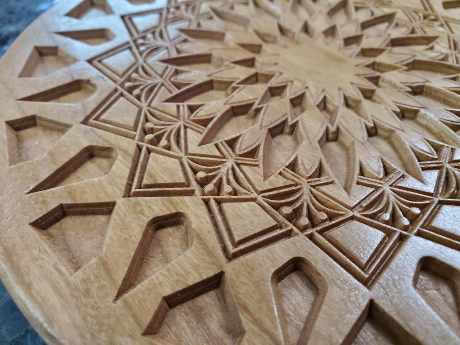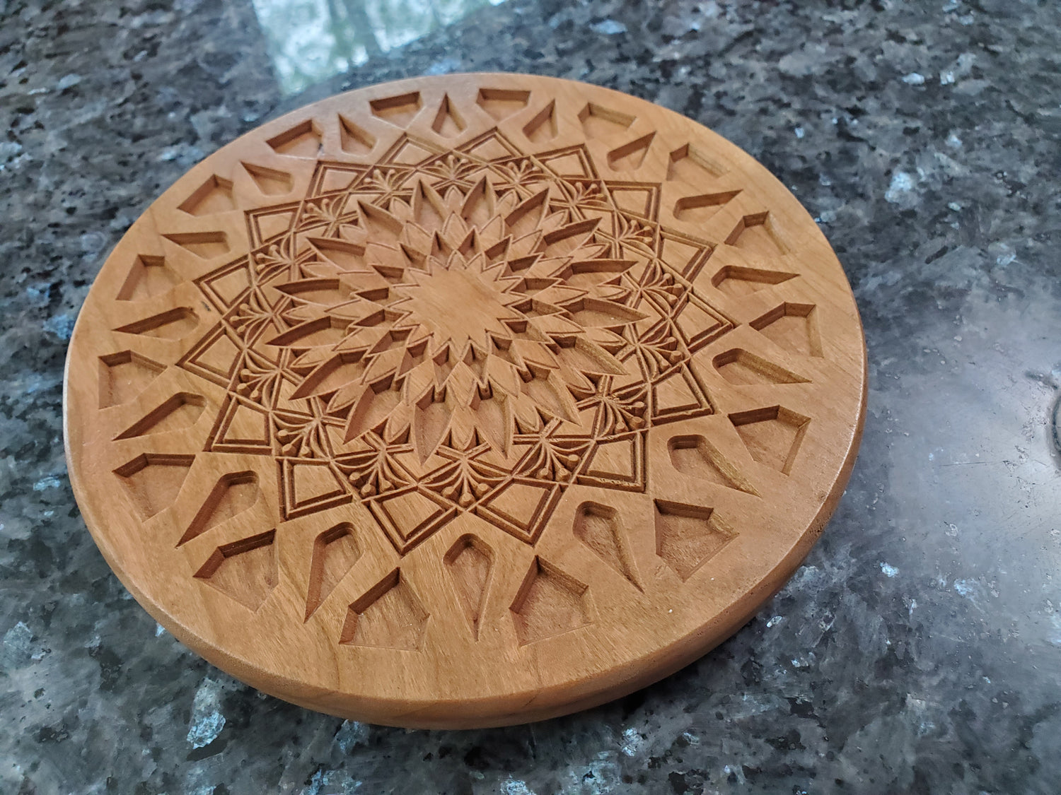 This trivet has our Geometric Starburst motif in a warm cherry wood.