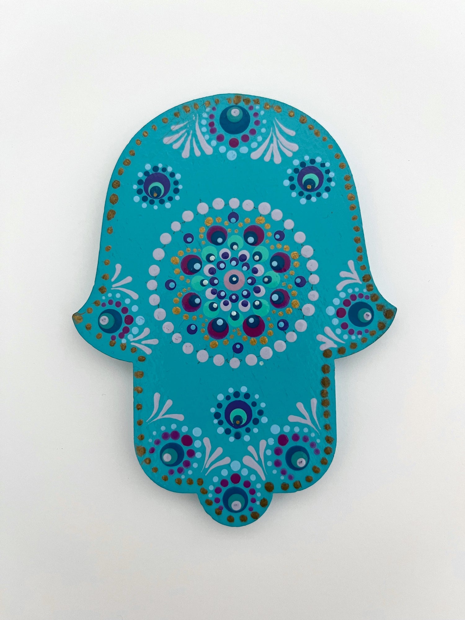 This one-of-a-kind turquoise Hamsa magnet features delicate lilac filigree with metallic gold highlights. It is hand-painted in acrylic and sealed with a clear protective coating. Includes a flat magnet on the back.