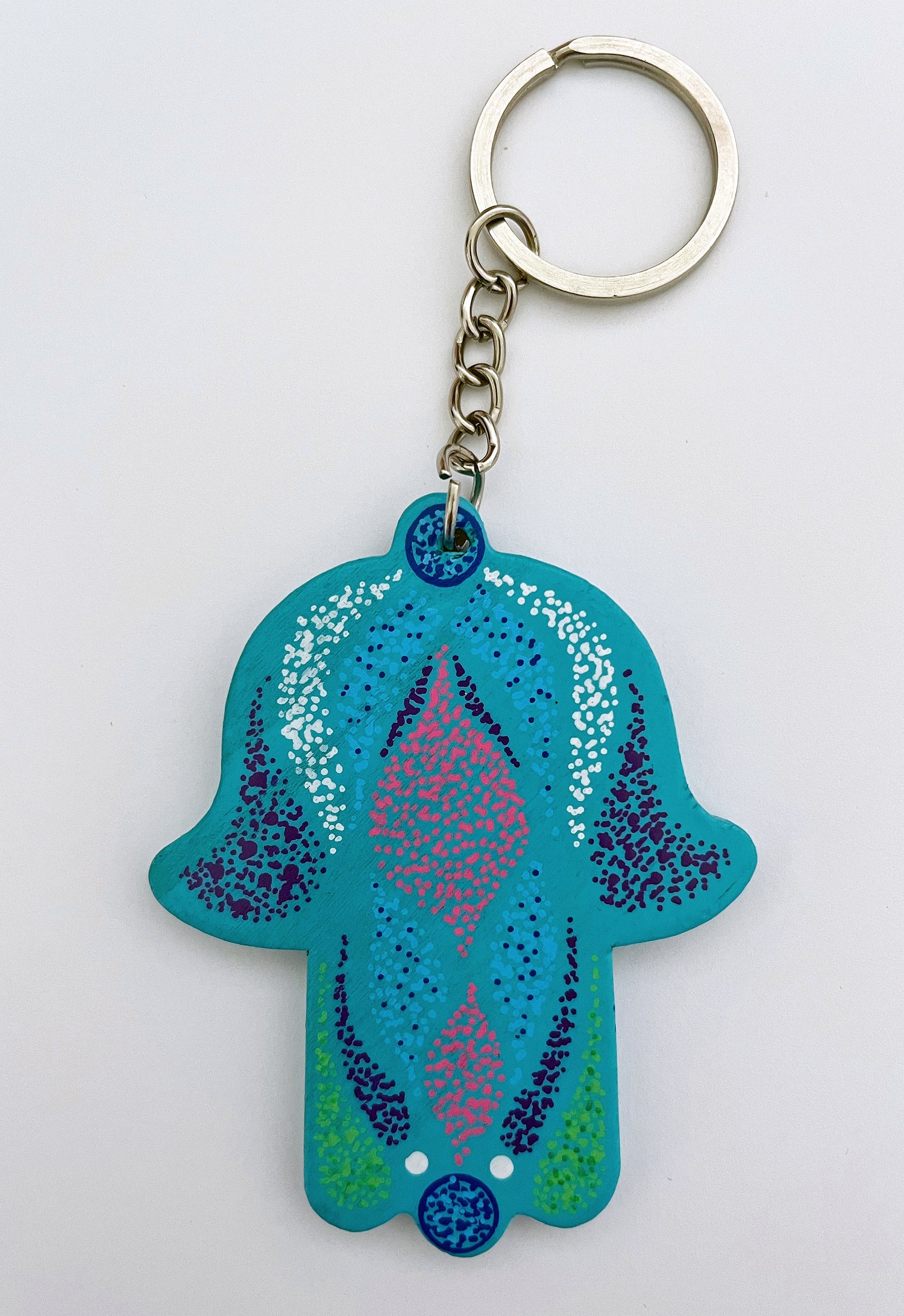 This hamsa keychain features tiny dots in pink, purple, white, blue and green on a turquoise field. It is handpainted on both sides in acrylic paints with a protective clear enamel spray.
