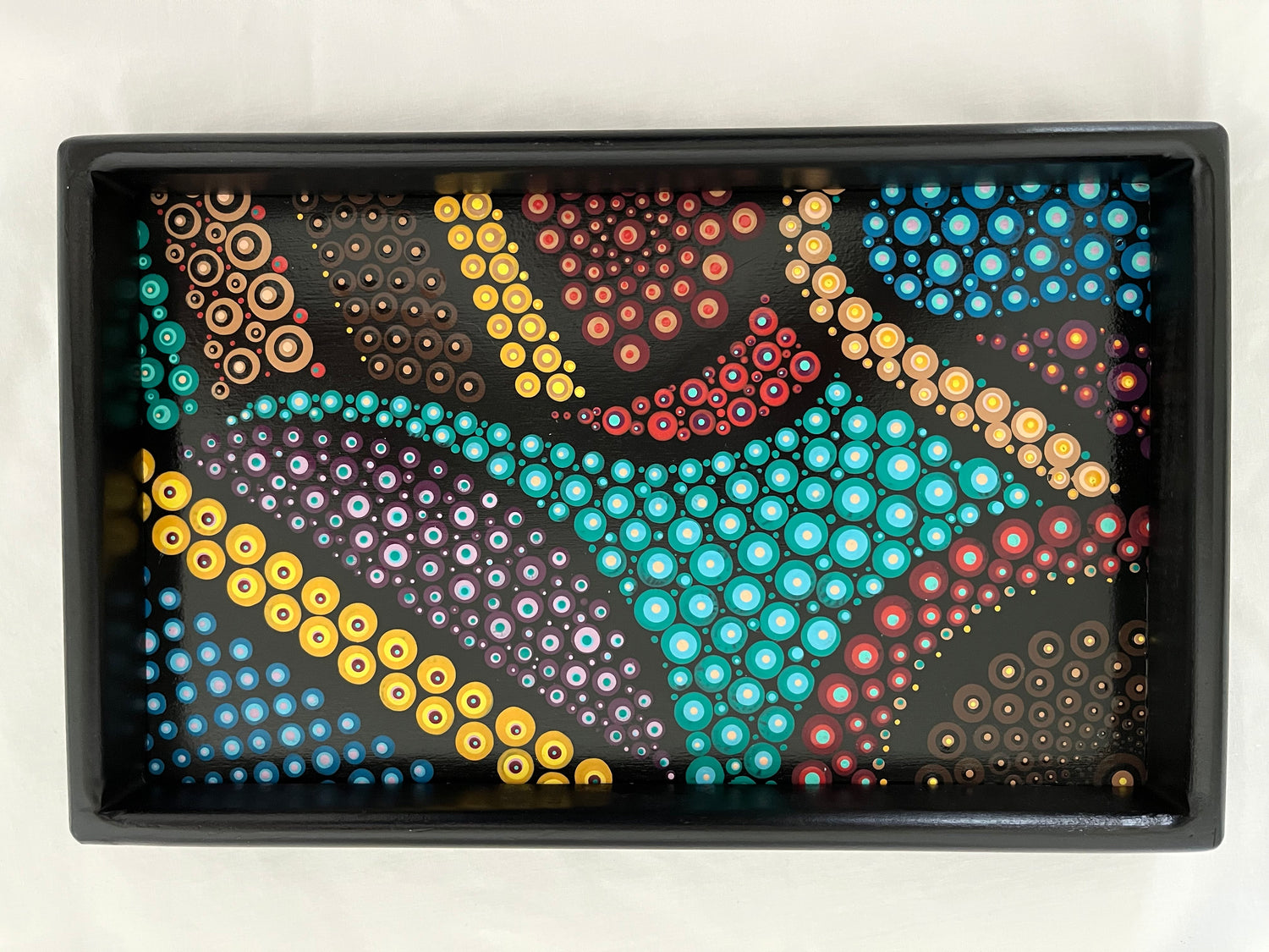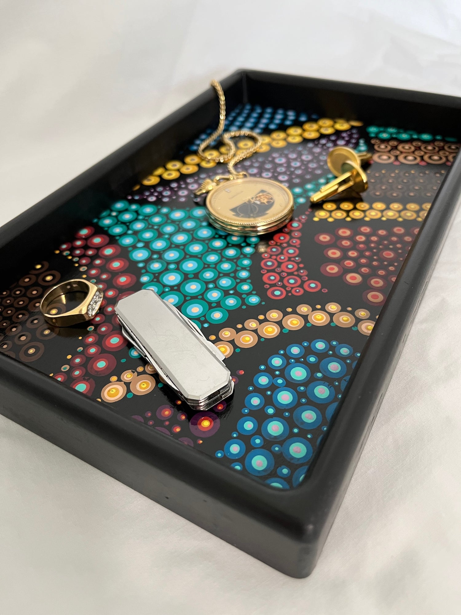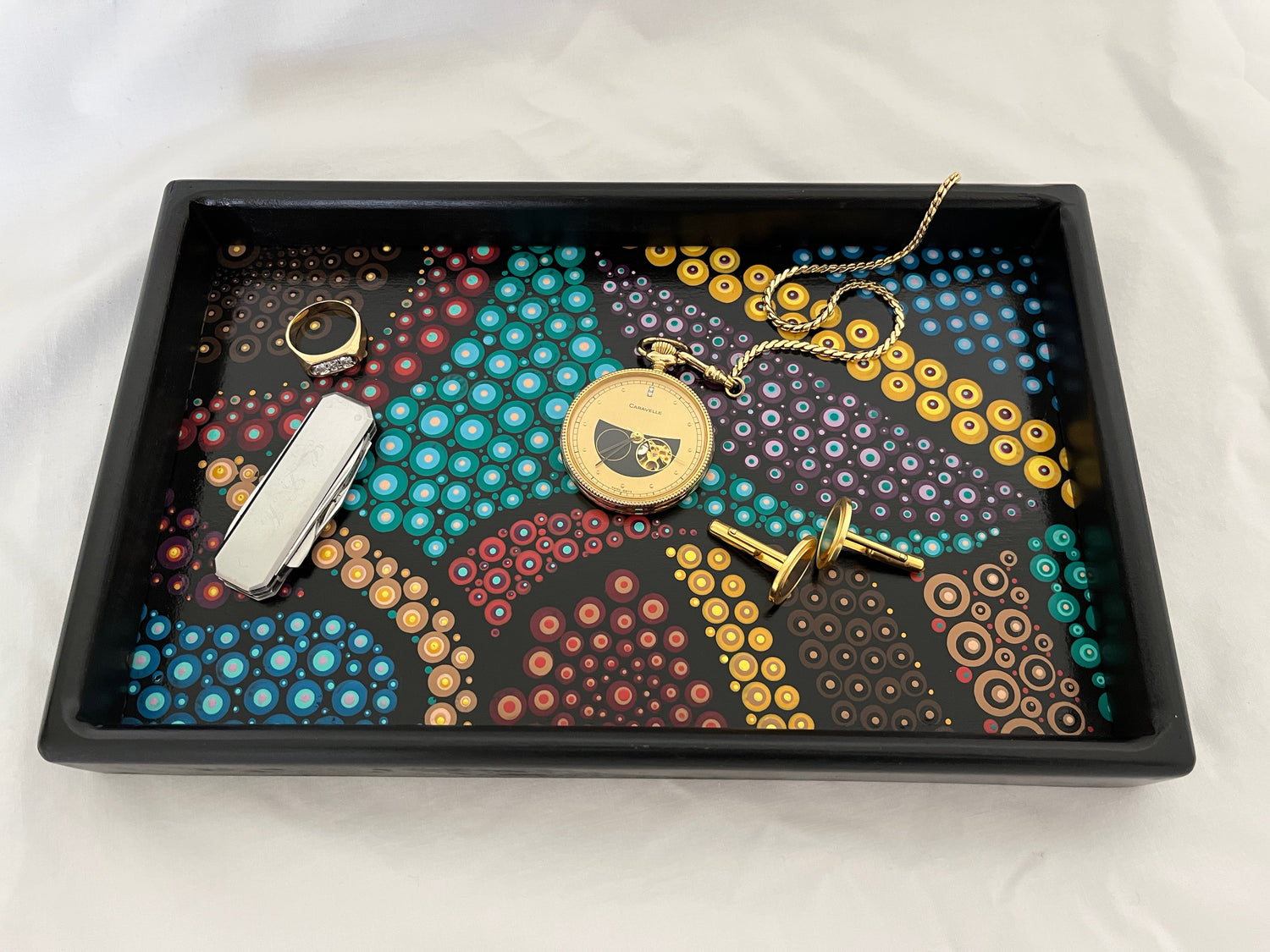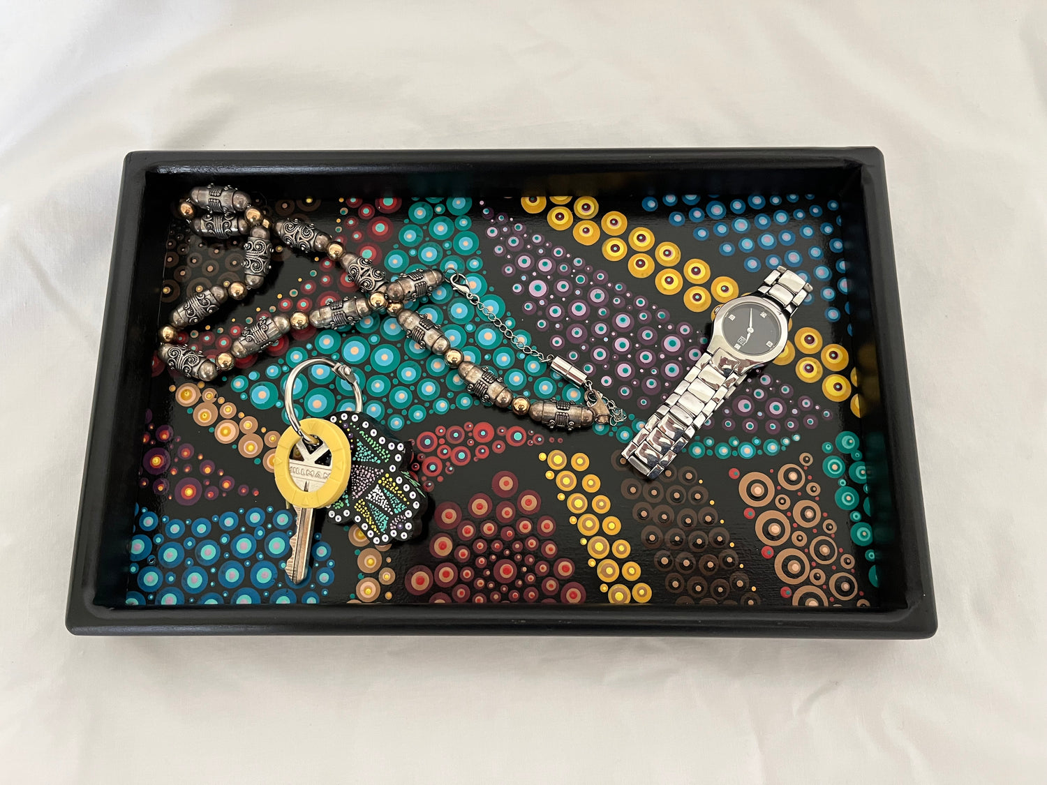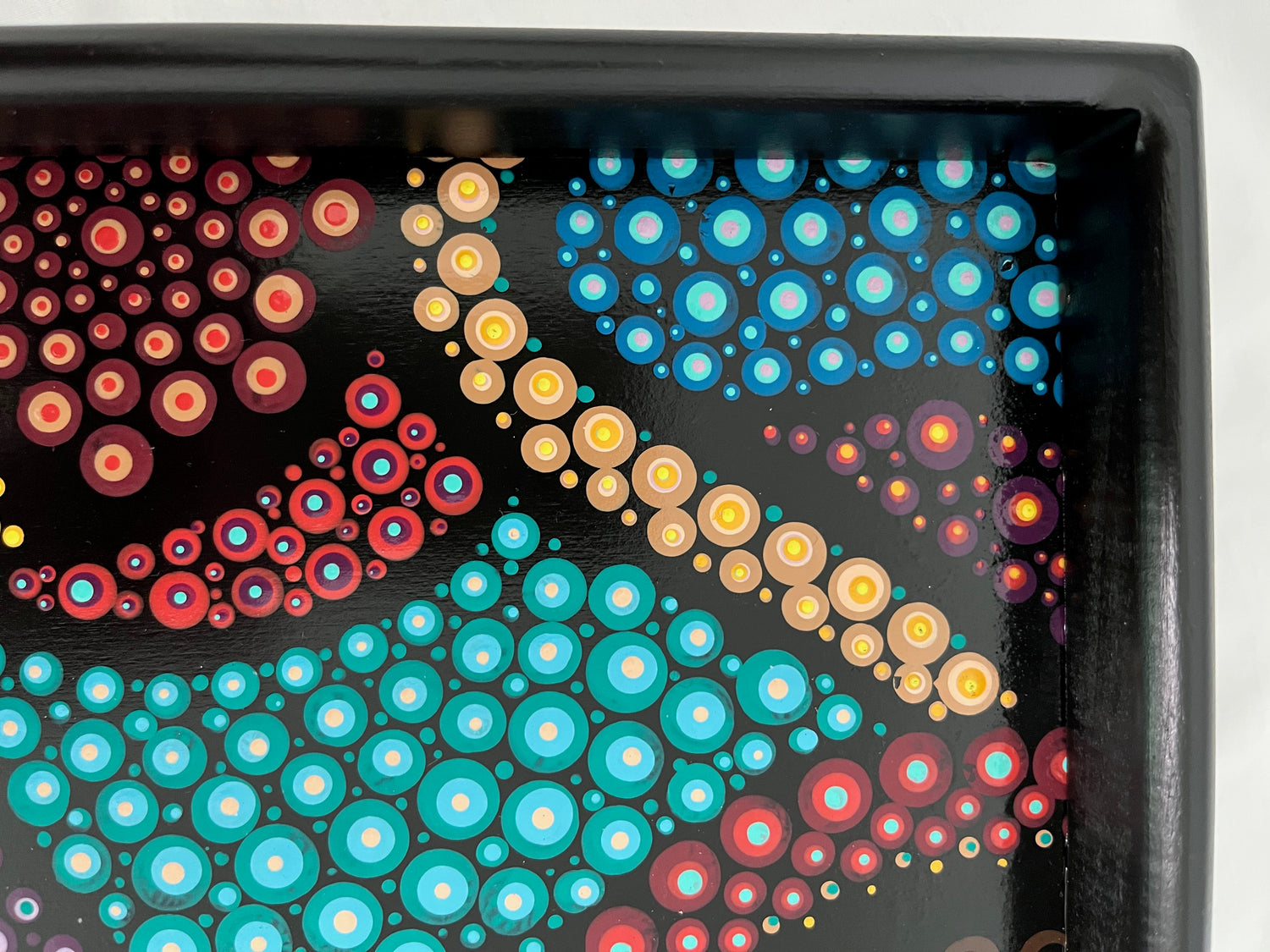 This beautiful hand-painted Valet Tray features an acrylic dot pattern in browns, burgundy, turquoise, mustard and brick colors on a black background. Run your fingers over the design for a delightful sensory experience! A solid black wooden tray base and sides makes this piece an elegant tray for watches, cufflinks or jewelry, or near your home's entryway for keys and change. A great gift for Him or Her — maybe Father's Day?? A glossy, clear-coat enamel spray adds shine and protection.