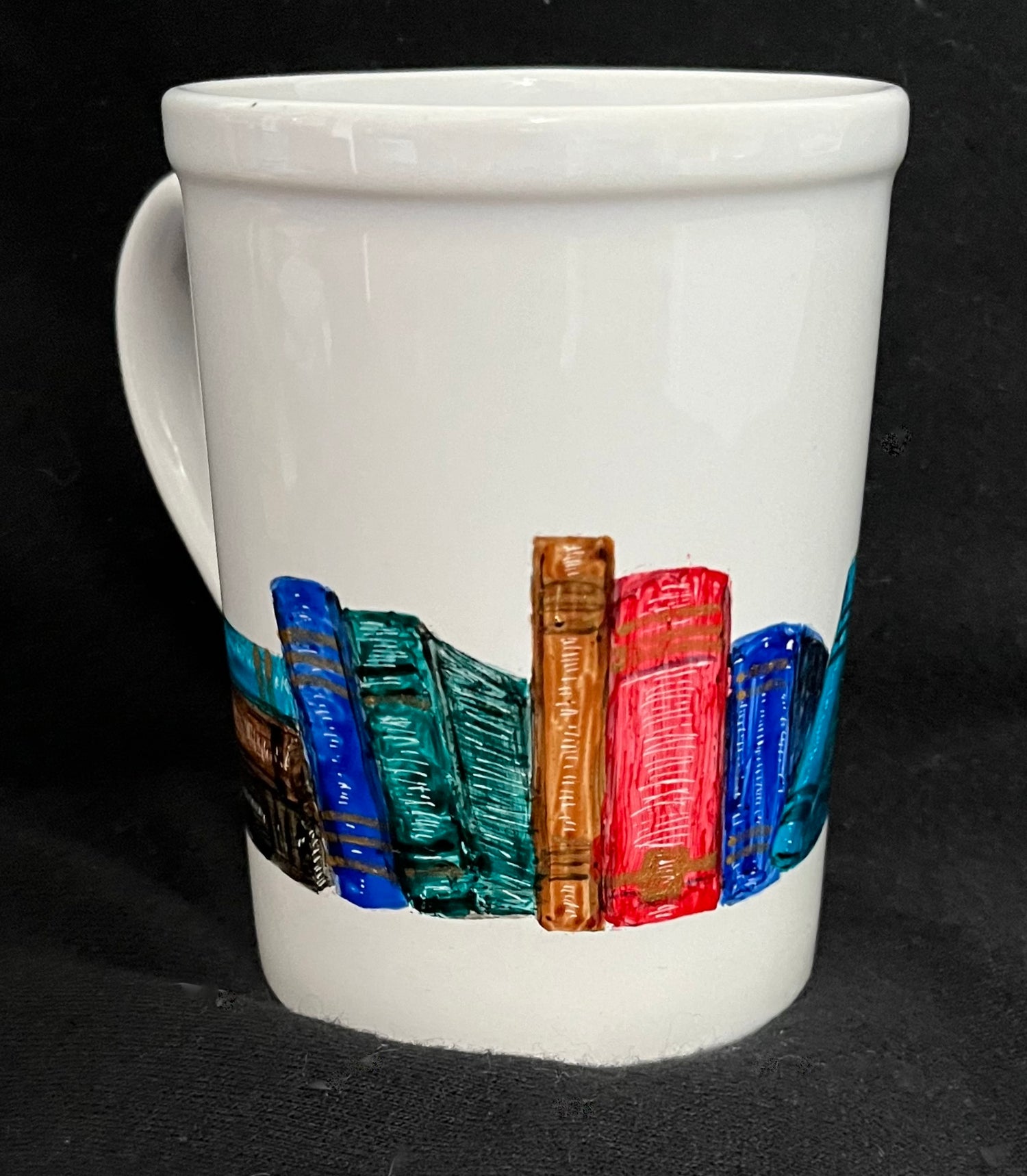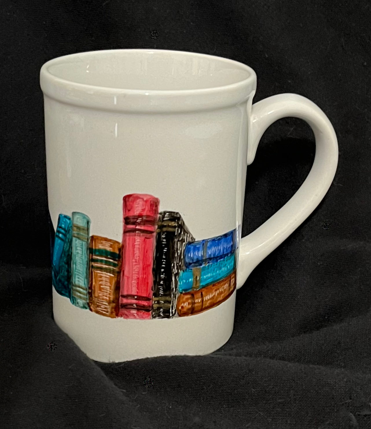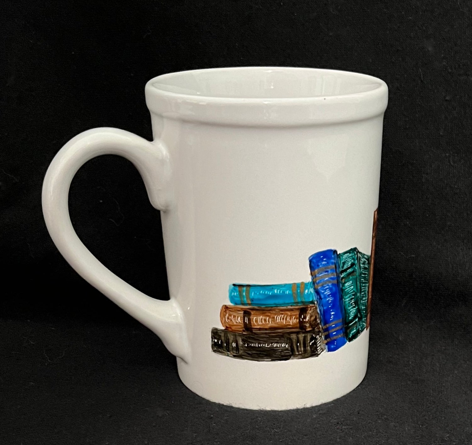 This fun white mug with a large handle is painted with a row of books. Fine details include gold accents in the book spine and subtle shadings with etching. A wonderful gift for any book lover! Each mug is hand crafted and unique, so there will be subtle variations in each design.
