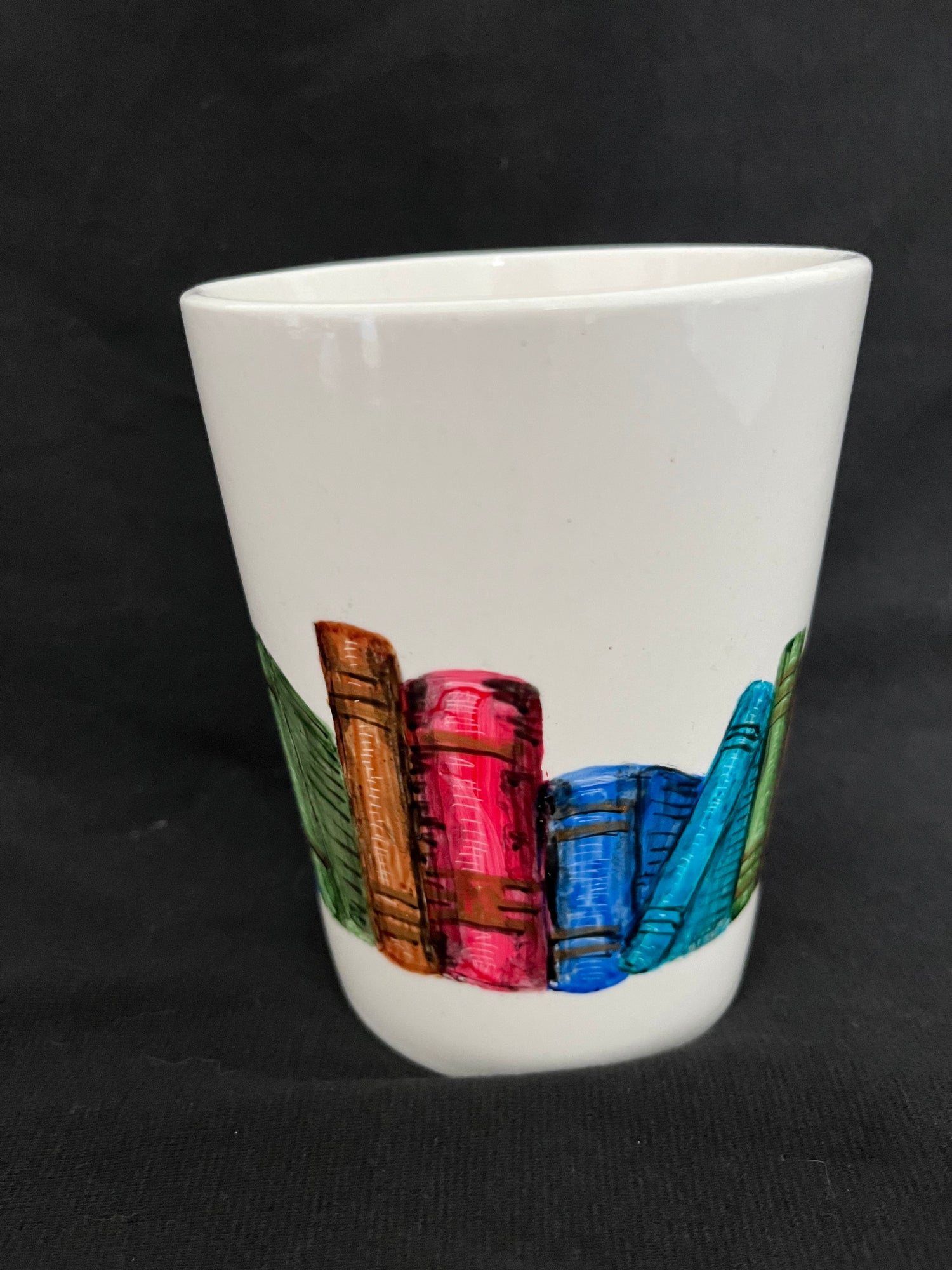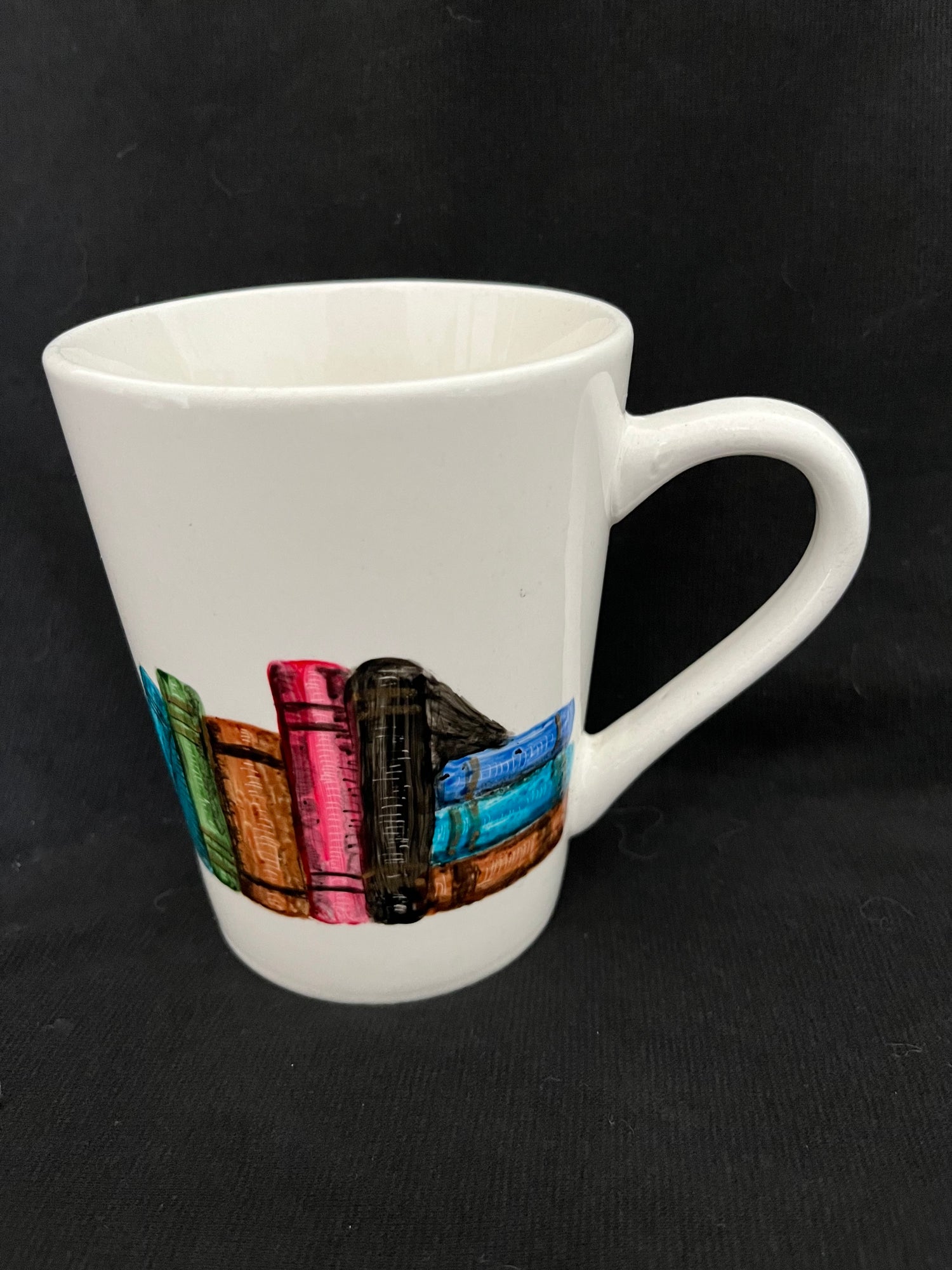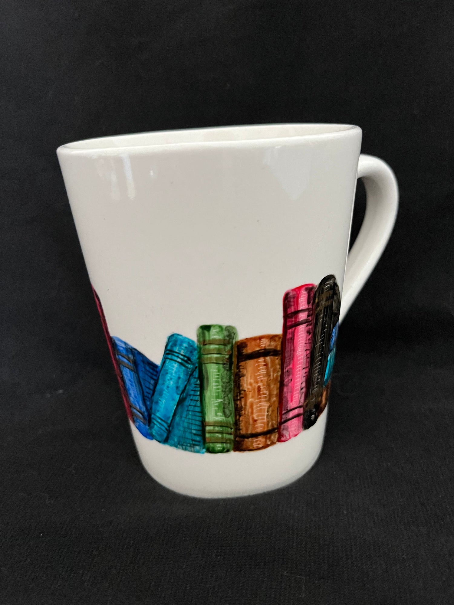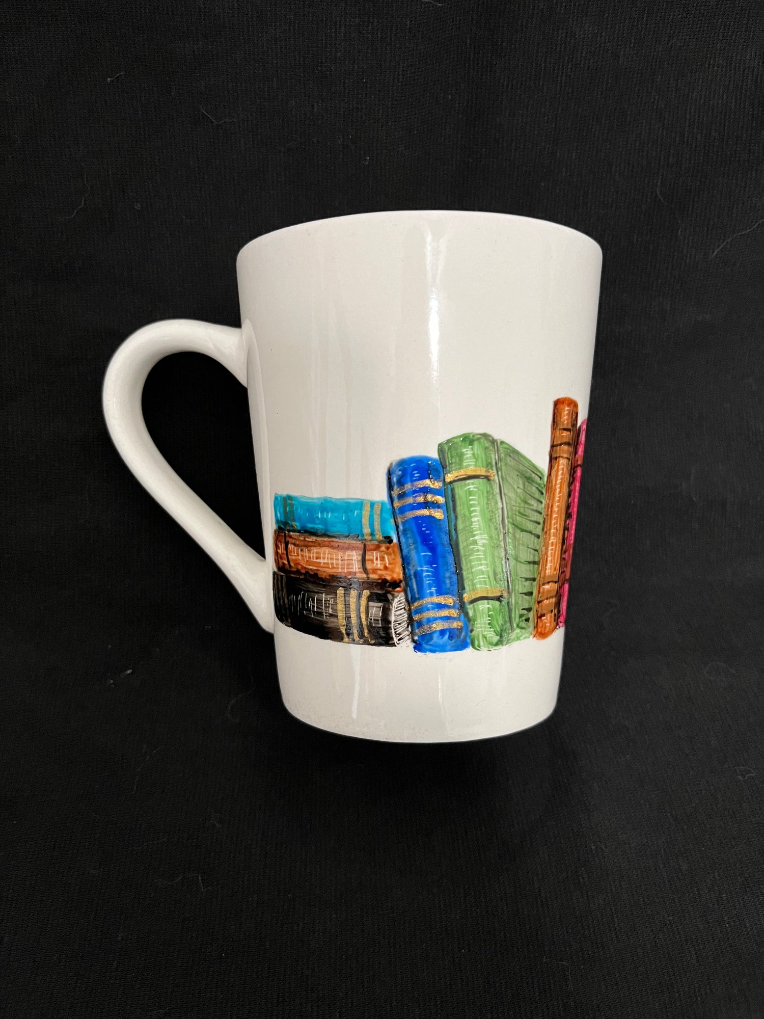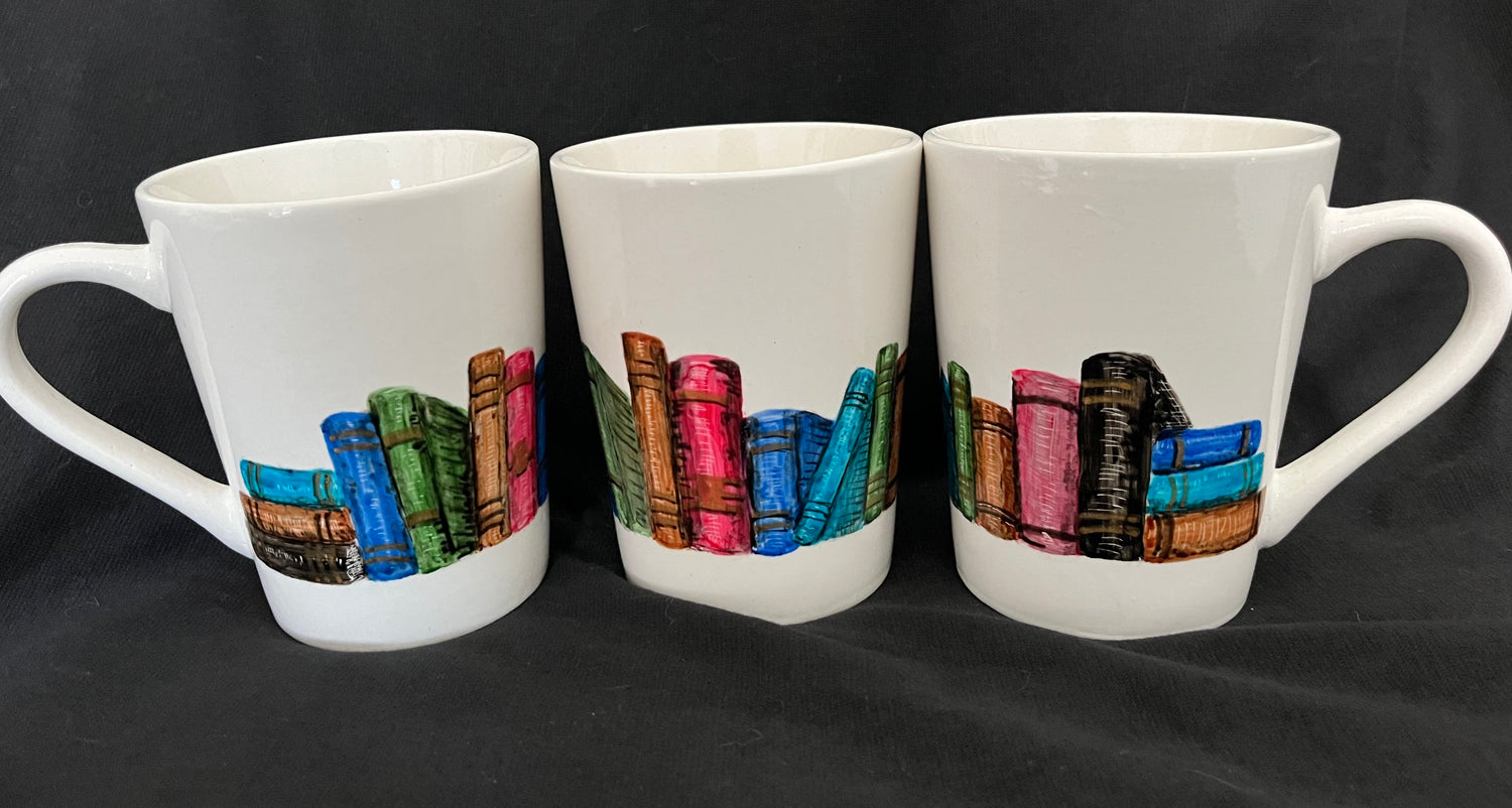 This fun white mug with a large handle is painted with a row of books. Fine details include gold accents in the book spines and subtle shadings with etching. A wonderful gift for any book lover! Each mug is hand painted, so some variations will occur.