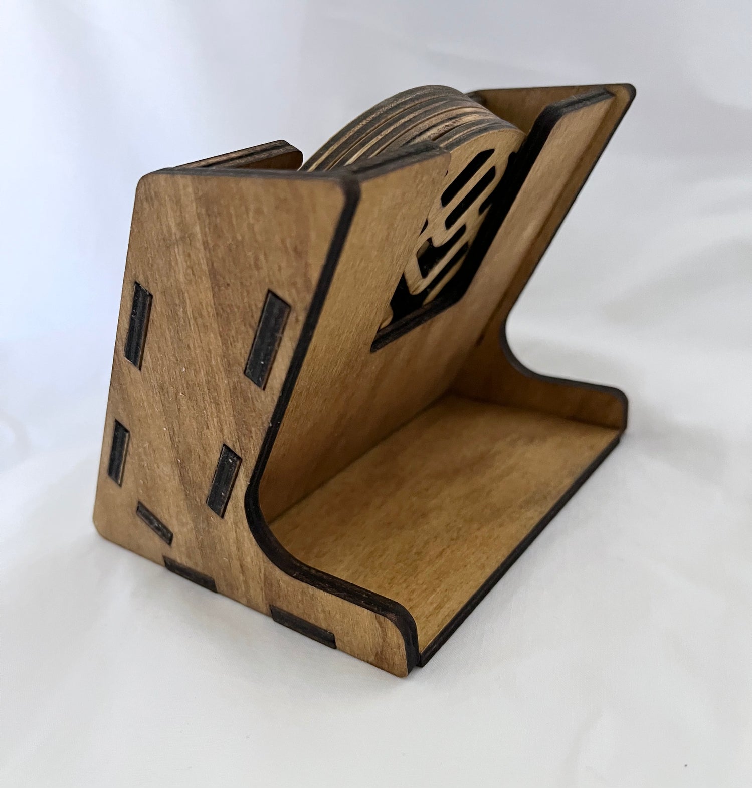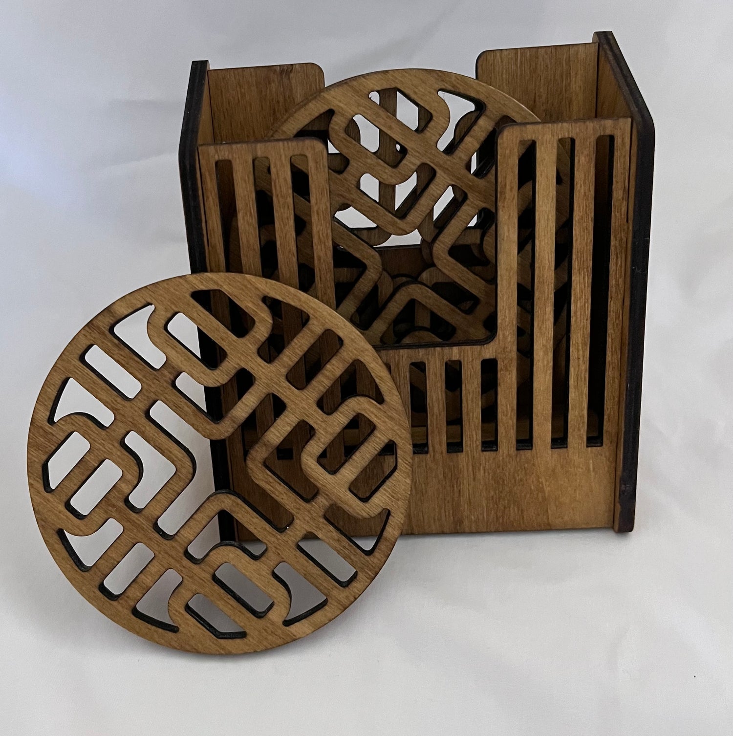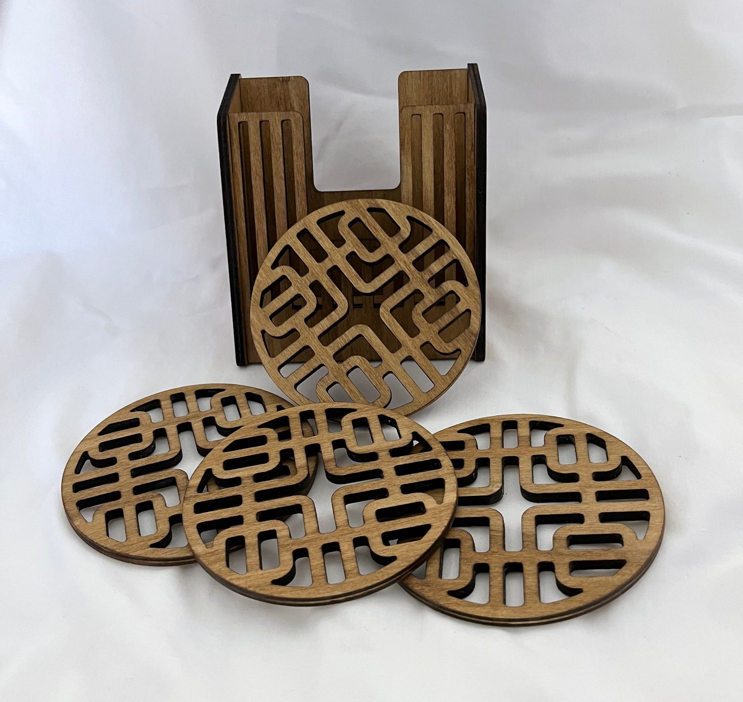 These set of 4 inch laser cut coasters include a matching box and 4 coasters in a golden oak stain.