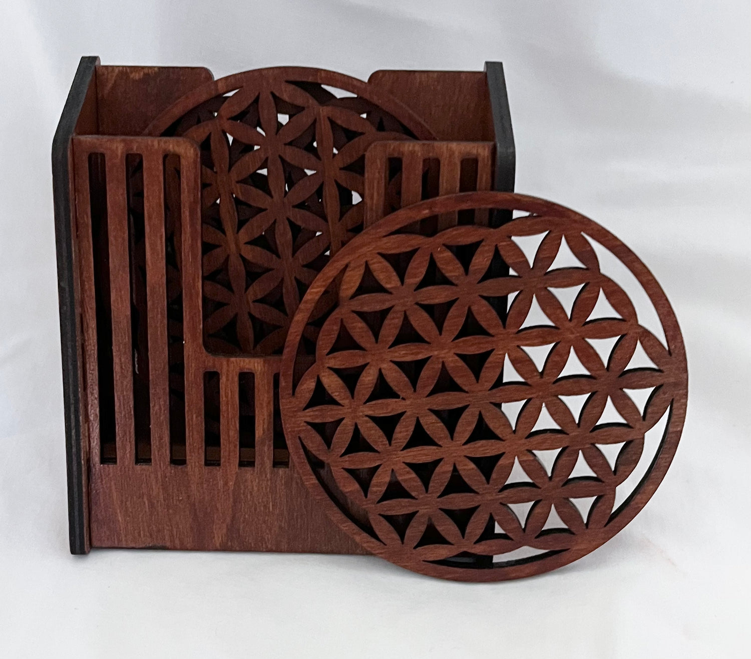 These set of 4 inch laser cut coasters include a matching box and 4 coasters with a mahogany stain.